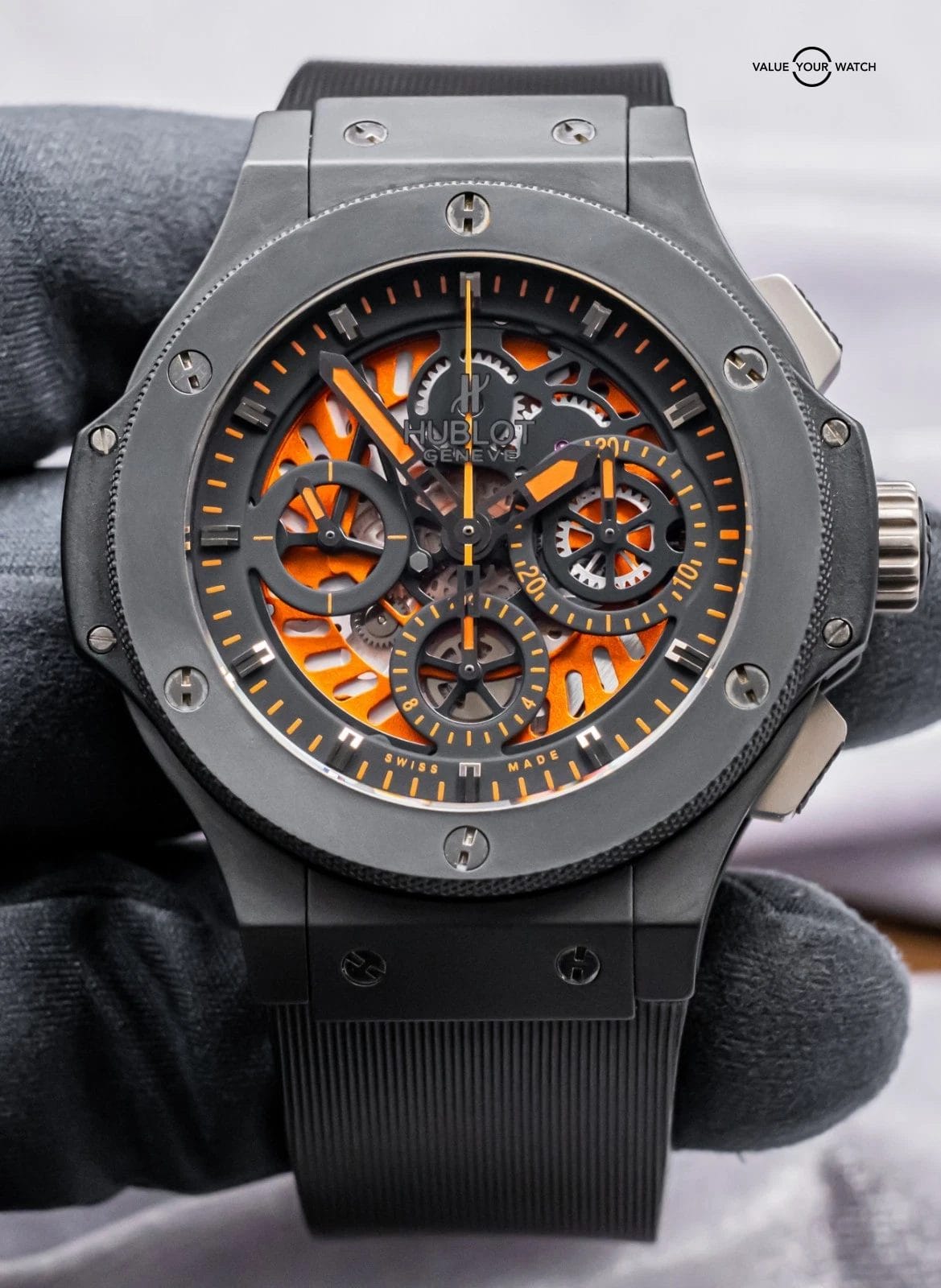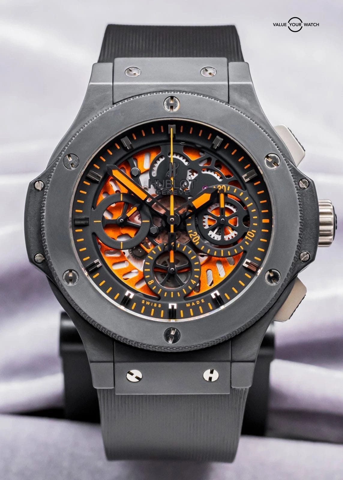 STRIKING Hublot Aero Bang 44 in All Black Ceramic with Orange Skeleton Dial on Black Hublot Rubber Strap! Arrives as watch only with a massive $24,900 MSRP. This is a desirable Aero Bang spec with the black ceramic that allows the orange to make the skeleton dial pop!