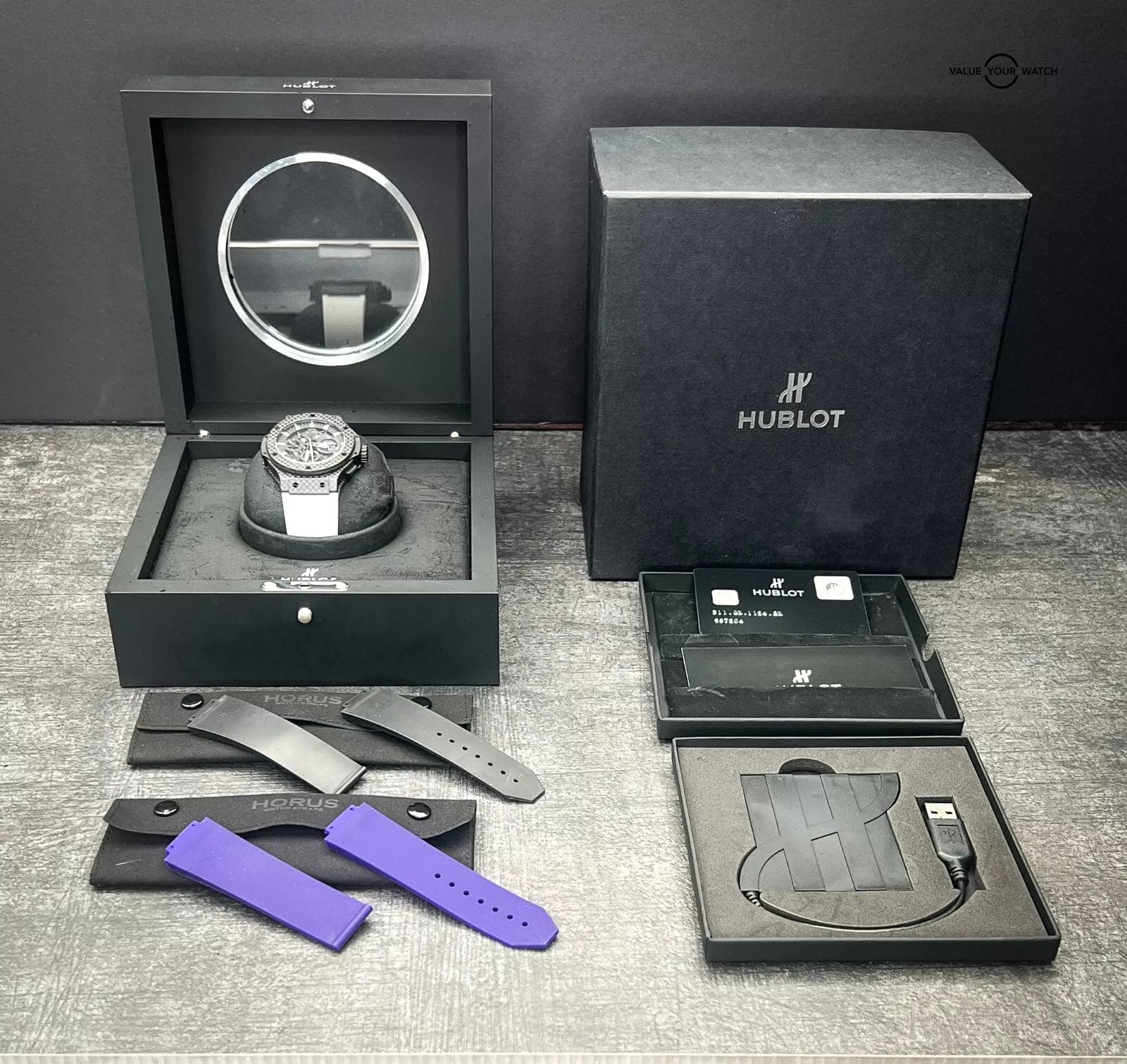 DESCRIPTION¬†The Hublot Big Bang 311.QX.1124.RX ¬†stands as a masterful fusion of cutting-edge design and precision engineering. With its 44mm carbon fiber case, this timepiece boasts a striking aesthetic. Its skeleton dial offers a mesmerizing view into the intricate heart of its in-house movement, showcasing the artistry and innovation at the core of Hublot’s craftsmanship. Paired with a comfortable rubber strap, it epitomizes modern luxury and technical excellence.¬†IncludesWatch in excellent conditionHublot Outer BoxHublot Inner Display box2 Additional Horus Straps (white and purple)HangtagUSB ReaderWarranty Card¬†CONDITION¬†Watch is excellent+ ¬†condition. All photos are taken by our in-house photographer of the actual item and is the best visual description of the condition we can provide. We do not use any stock photos. Please refer to the photos for condition. If you need additional photos or have any questions, please feel free to contact us.¬†¬†AUTHENTICITY¬†We fully stand behind and guarantee that all our pieces are 100% authentic. For your extra peace of mind, all of our pieces are backed by eBay‚Äôs Authenticity Guarantee. Each piece is inspected by an independent expert before you receive it, so you can buy in complete confidence that it is authentic and just as we have explained in our listing.¬†¬†¬†¬†SHIPPING TERMS¬†All domestic shipments have a 2-day handling time and are shipped using Fed Ex 2 Day Service. All shipments are fully insured, and tracking numbers provided.¬†For International Shipping please contact us directly for assistance to your destination.¬†¬†RETURNS¬†Returns accepted for 14 days from purchase. Buyer responsible for any return shipping costs and must be in the exact condition they were delivered with all boxes, manuals and paperwork included.¬†¬†WARRANTY & DISCLAIMER¬†Adrenaline Timepieces is not a dealer nor affiliated with any of the brands that we sell. All items are considered as pre-owned. Any warranty provided is the remaining factory warranty if still valid.¬†¬†¬†ABOUT THE SELLER¬†I am a professional watch collector and love anything and everything about watches.¬†I am 100% committed to providing you with a beautiful timepiece at reasonable price backed by my exceptional customer service. I am happy to answer any questions about the watch you might have. Just reach out to me via messages.¬†I have many references in the watch world and am happy to provide them as needed.¬†I look forward to helping you secure your next timepiece!¬†¬†¬†