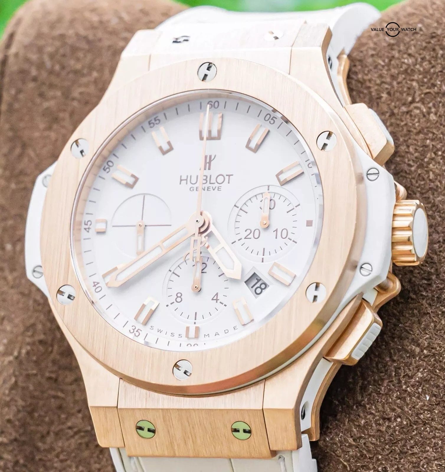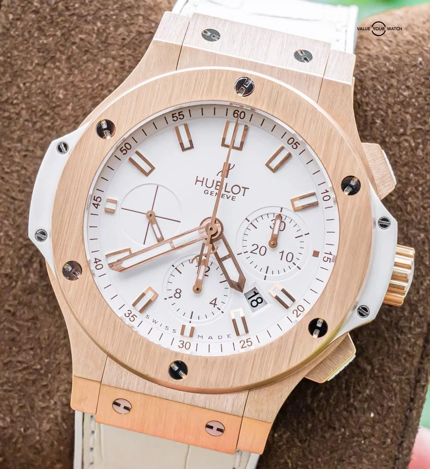 STUNNING Hublot Big Bang 44 in 18K Rose Gold with White Dial on White Hublot Leather! Comes with original Hublot papers and was originally purchased from a Hublot Authorized Dealer. When it comes to a solid rose gold piece under $30K, Hublot is always my go-to. Simply, they are unmatched- nice wrist presence, unsurpassed comfort, modern, durable, and extremely versatile. The White Hublot Leather is backed in rubber, making it super comfortable on wrist with that nice look of leather but rubber comfort. This Big Bang is ready to be on wrist!
