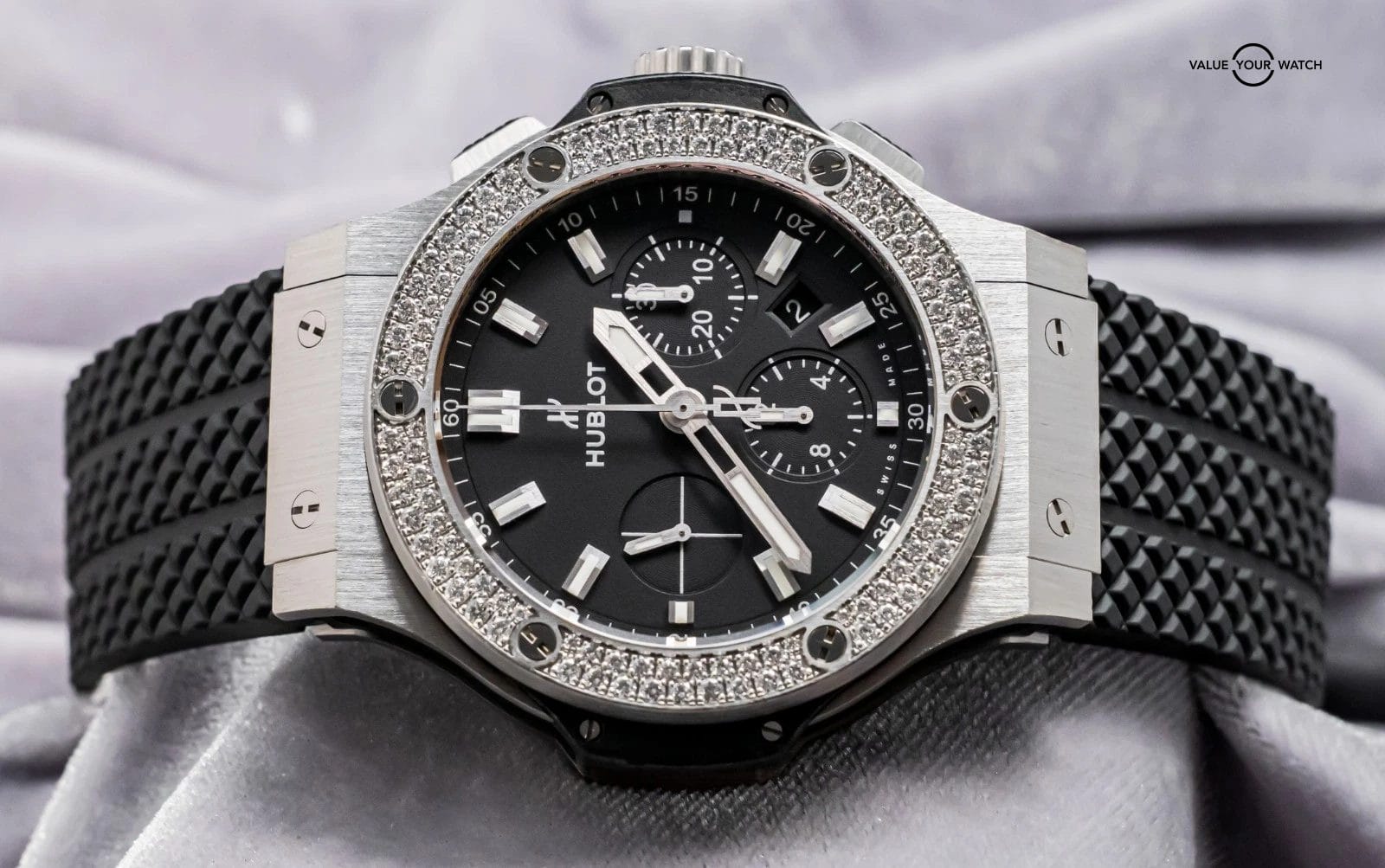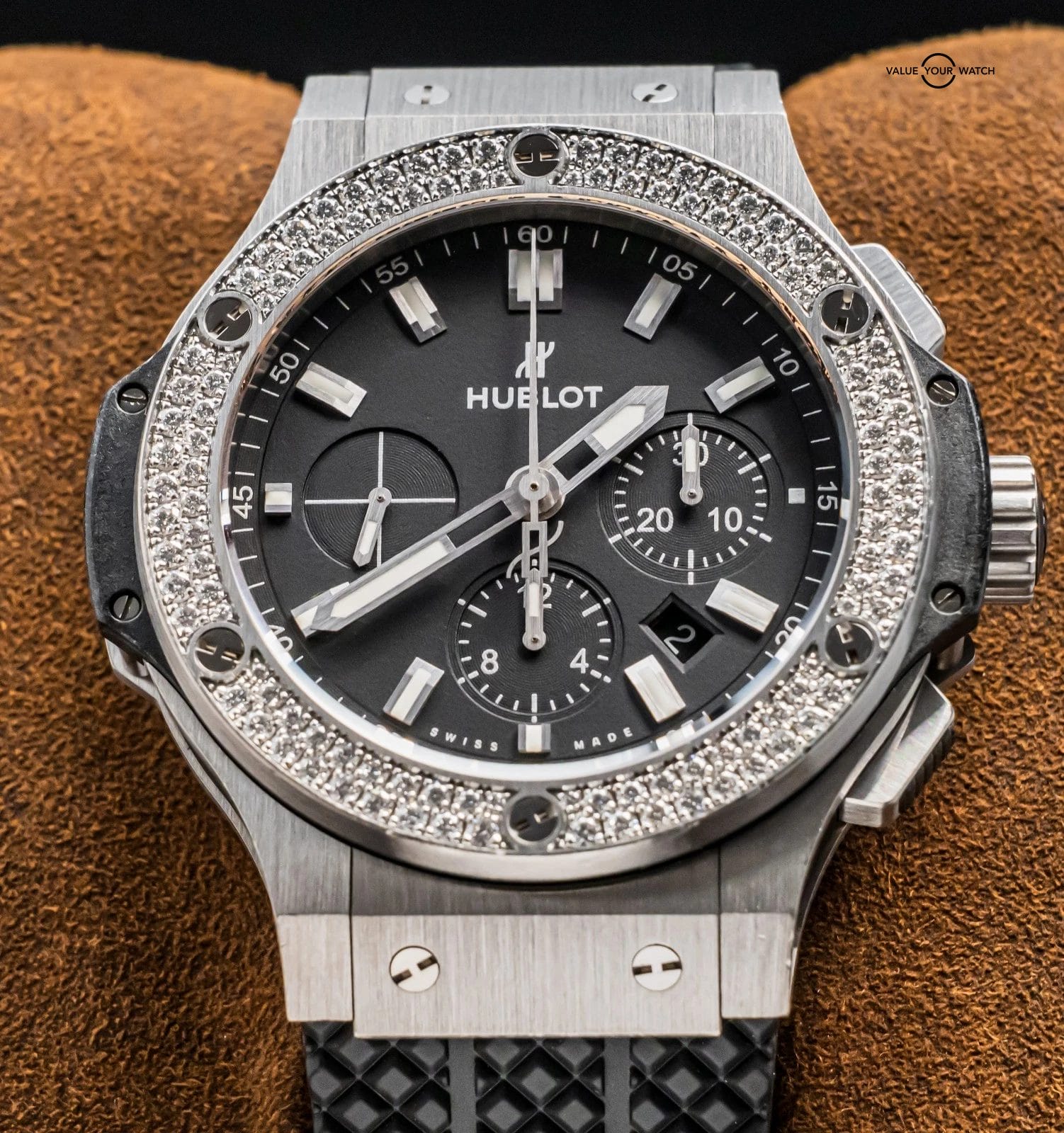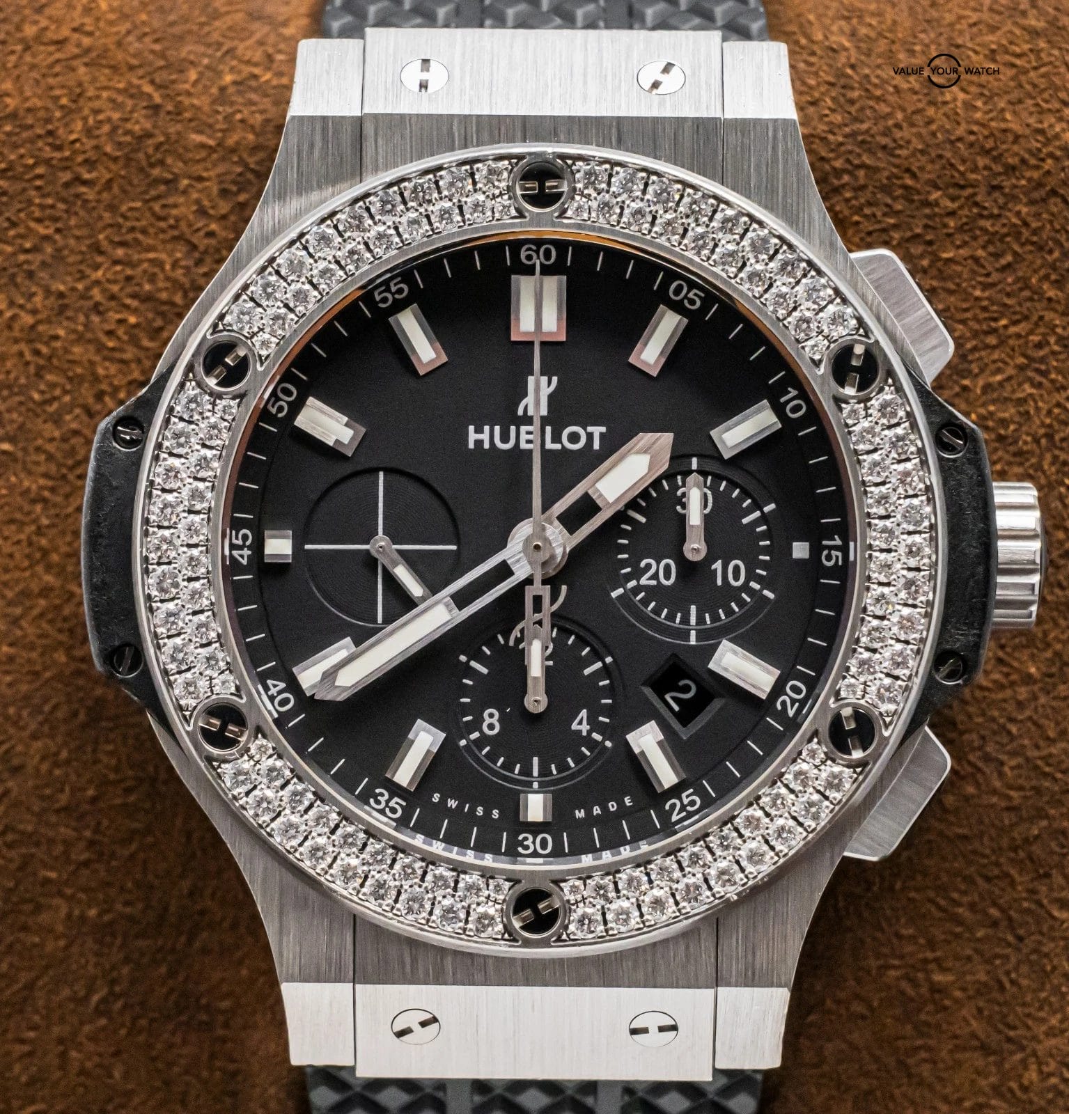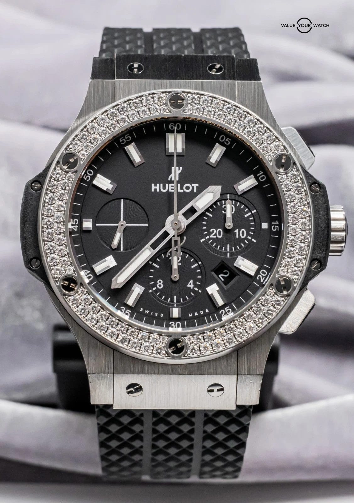 STUNNING Hublot Big Bang 44 Original Steel with FACTORY Diamond Bezel & Matte Black Dial on Black Hublot Rubber Strap! Arrives as watch only and with a massive $19,300 MSRP. The brushed stainless steel & matte black dial are what makes this Big Bang unique from other Big Bangs, given this increases the versatility and durability of the watch. It really is a solid Big Bang you can both wear everyday and pair with any colored strap, should you seek to switch it up. The pictures truly don’t do it justice!