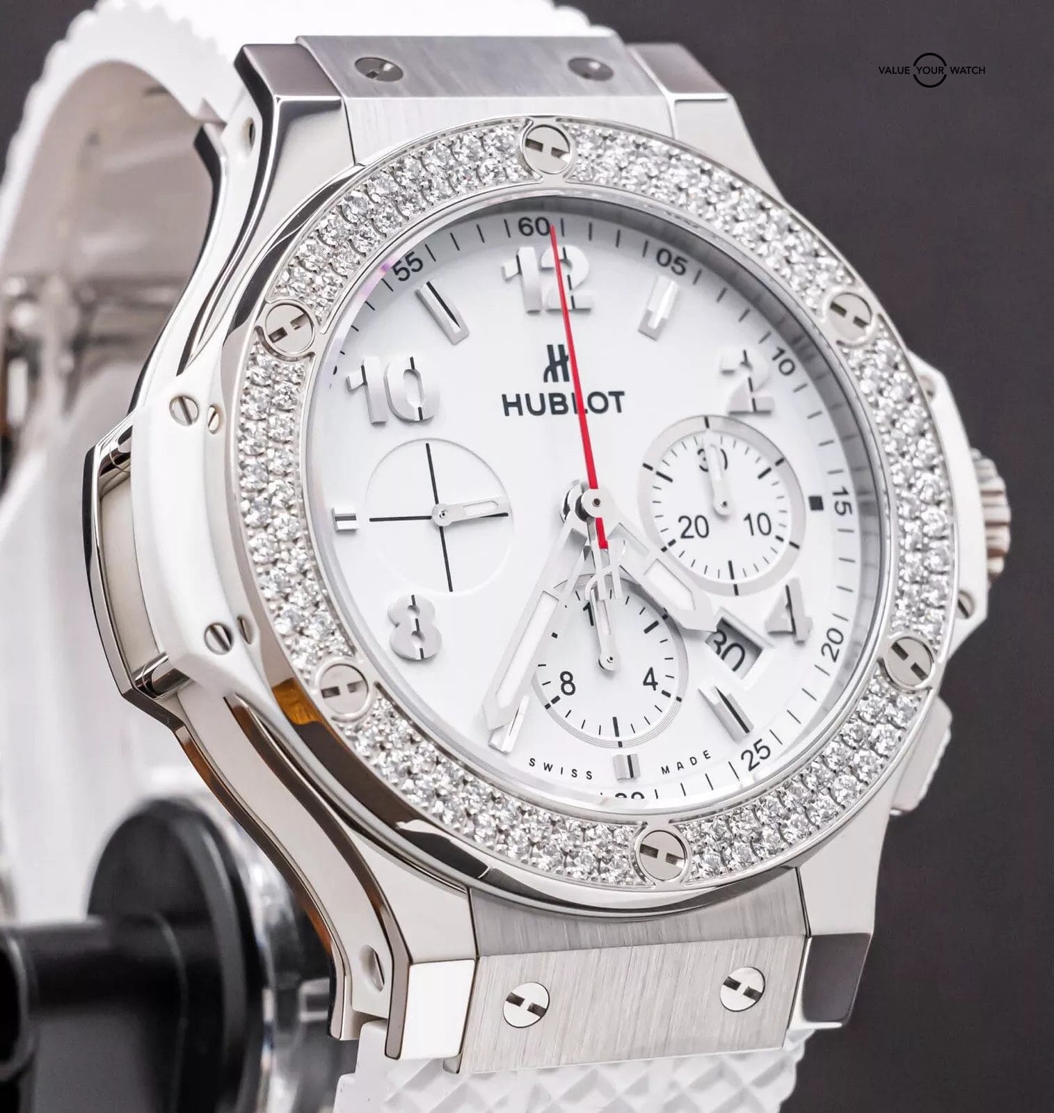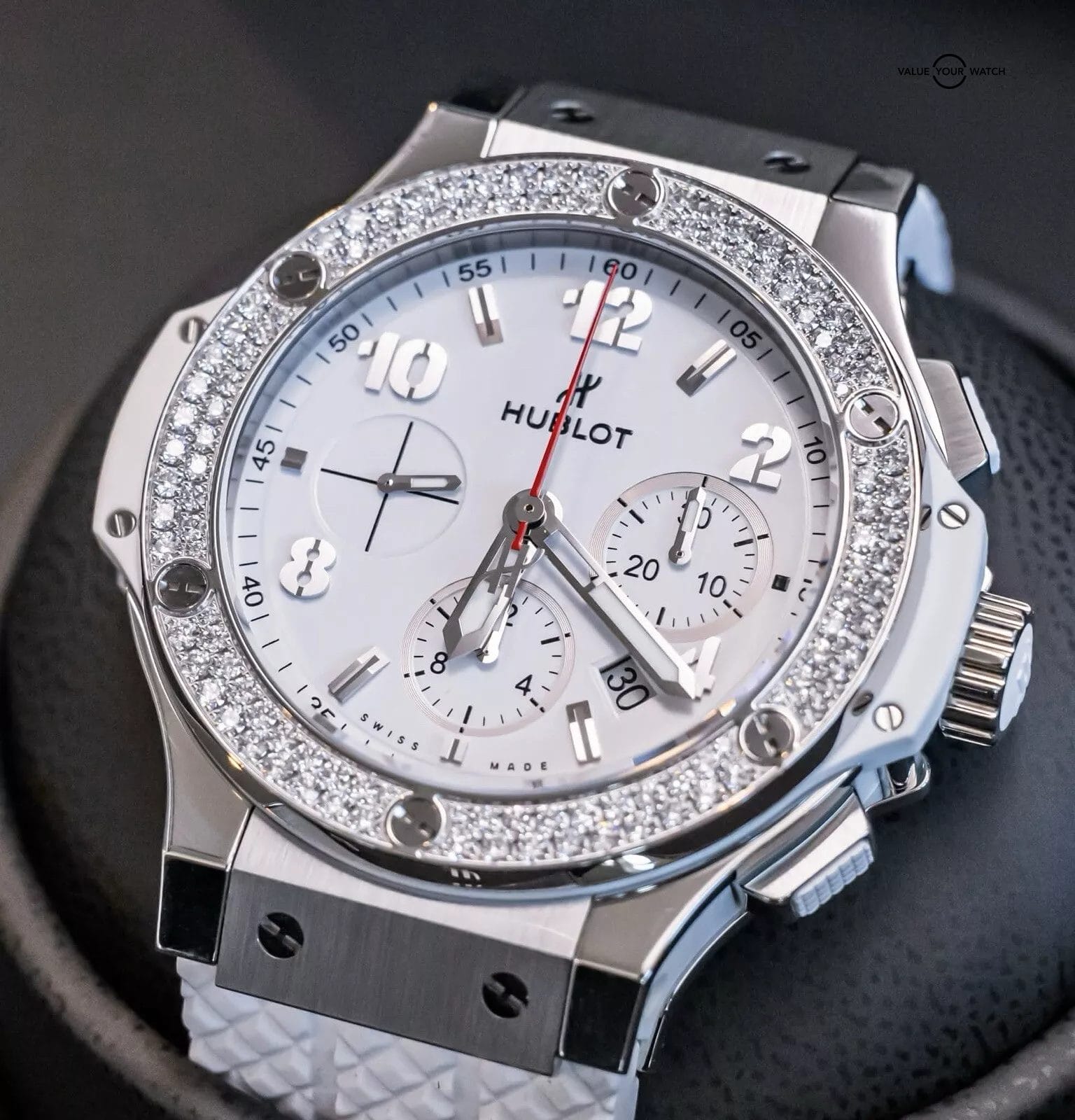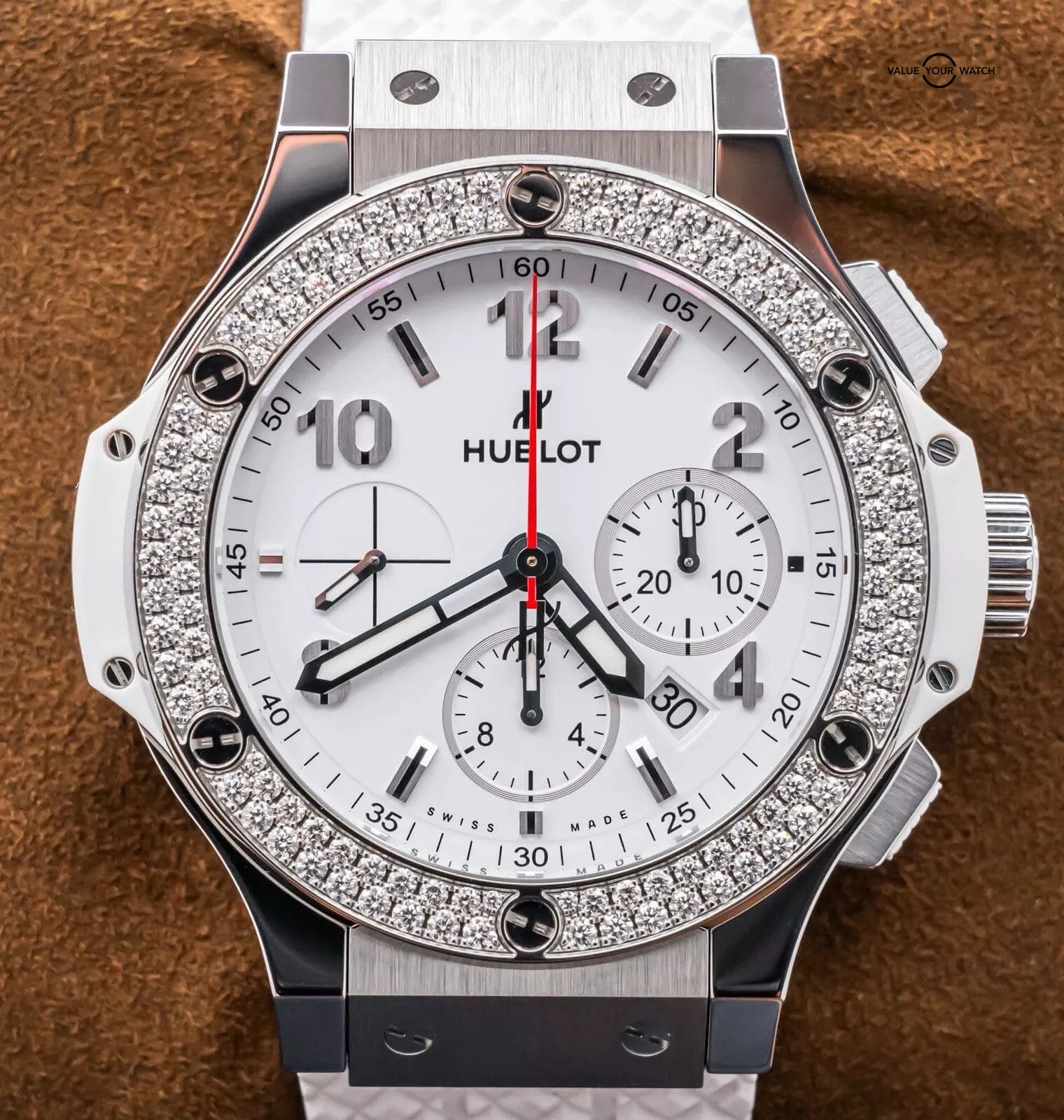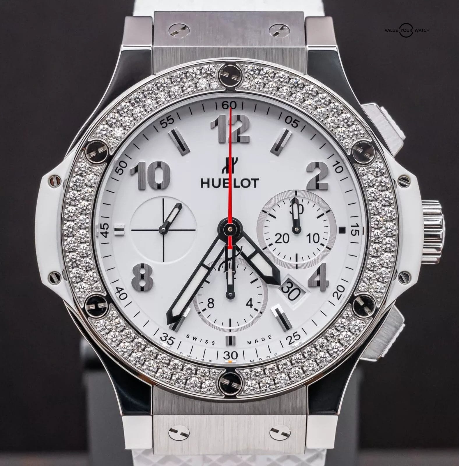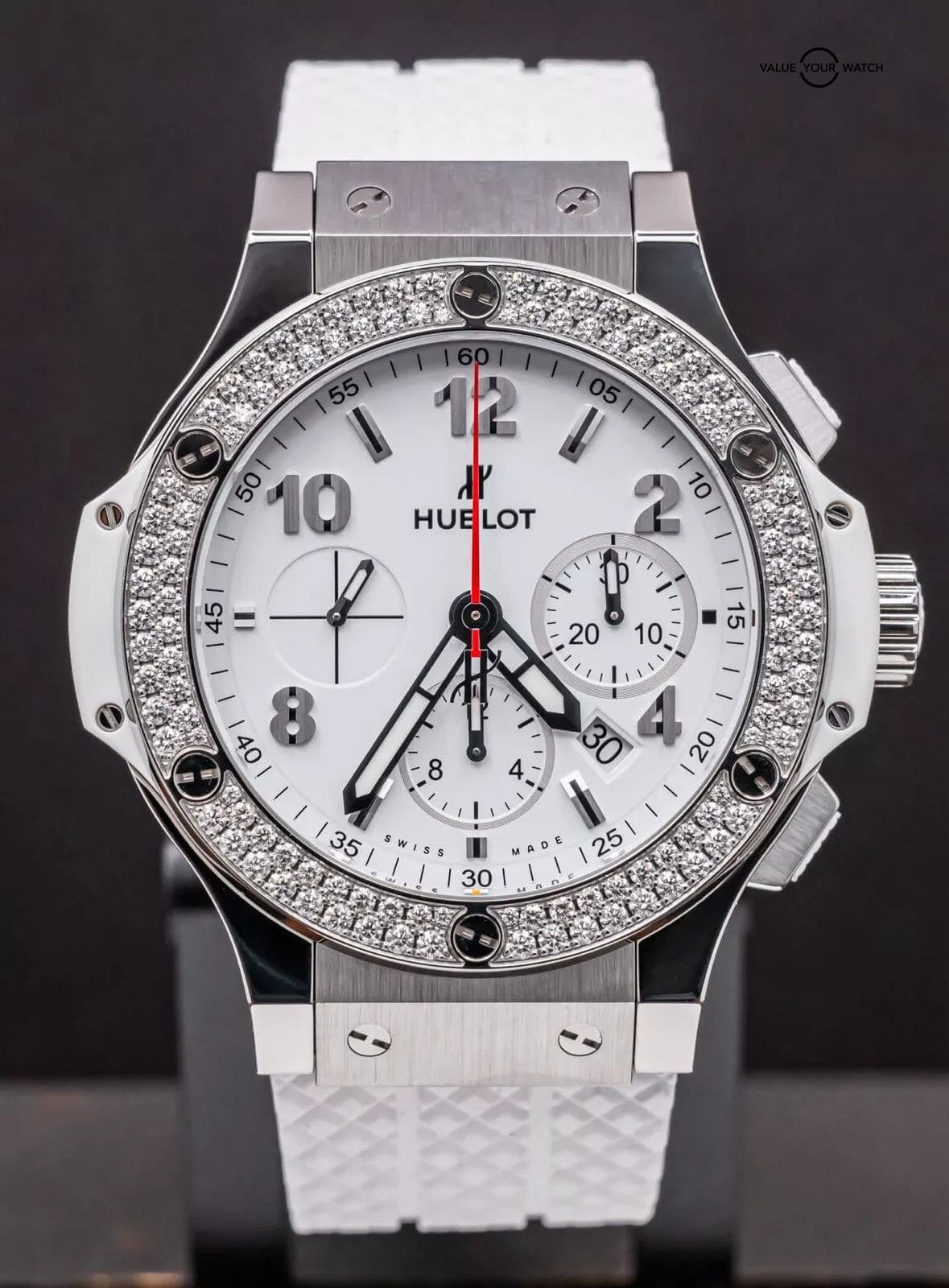 STUNNING Hublot Big Bang 44 in Stainless Steel with White Dial and FACTORY Hublot Diamond Bezel on White Hublot Structured Rubber! Arrives with original Hublot boxes and is keeping good time on my timegrapher when tested. This is A LOT of watch for the dollar on the secondary market, with an original MSRP of $19,300. KILLER on wrist!