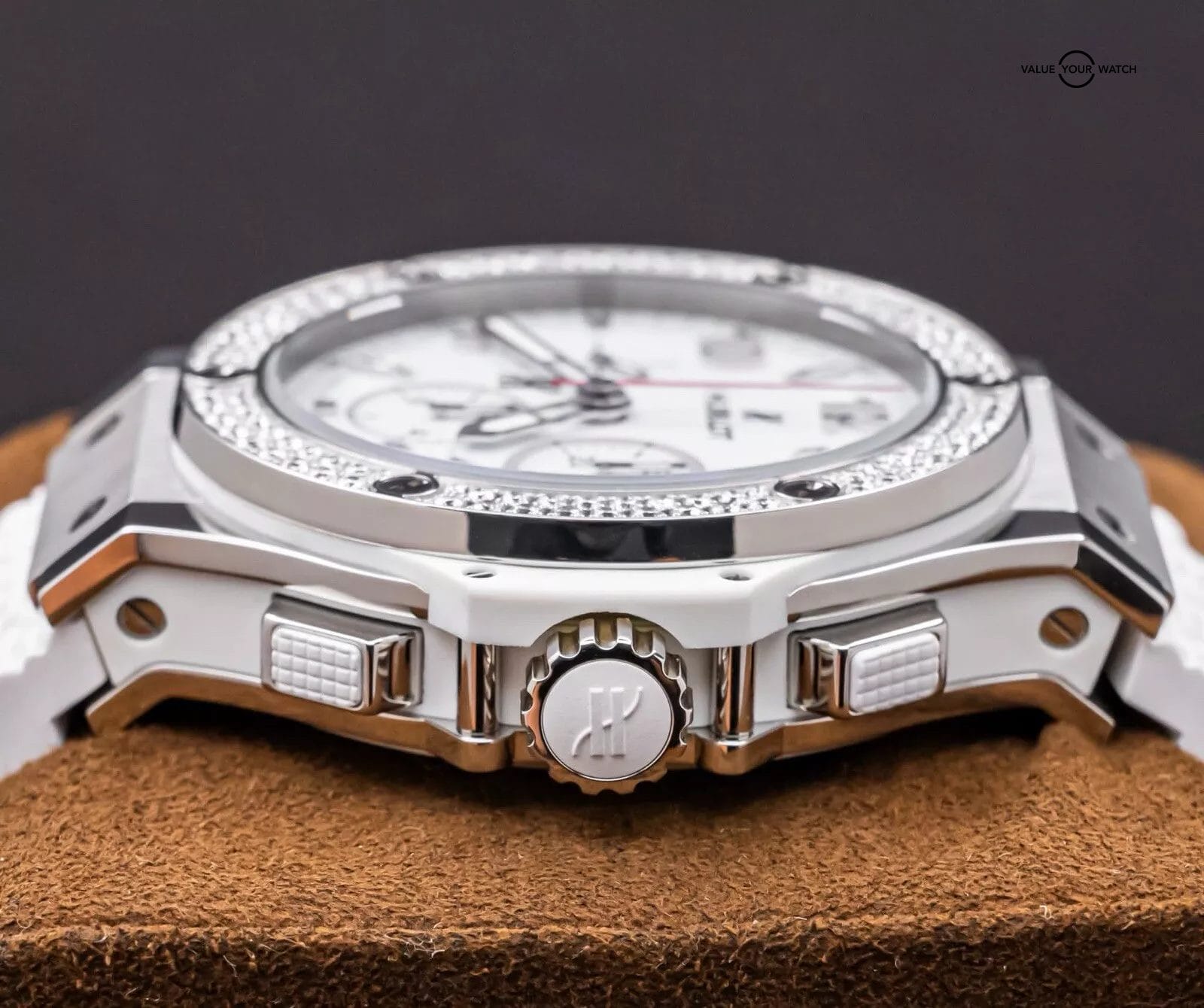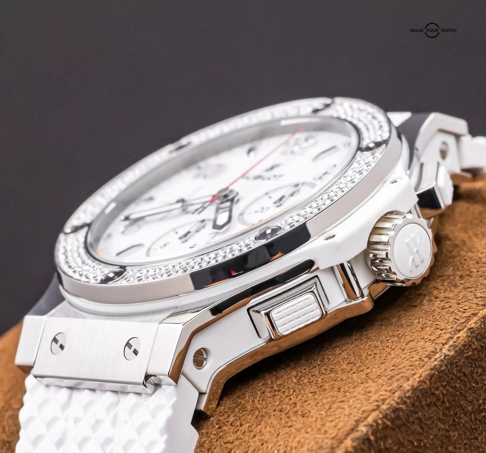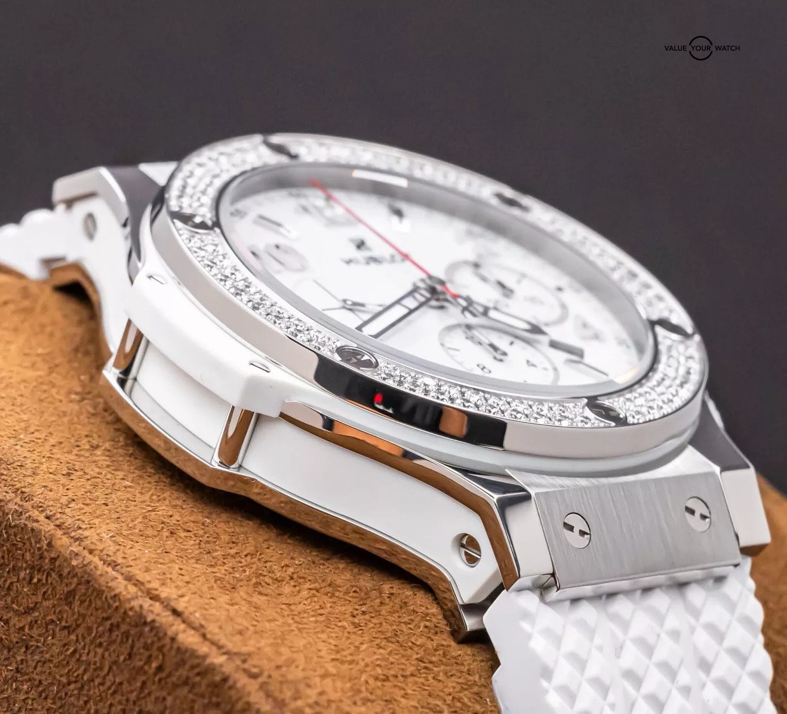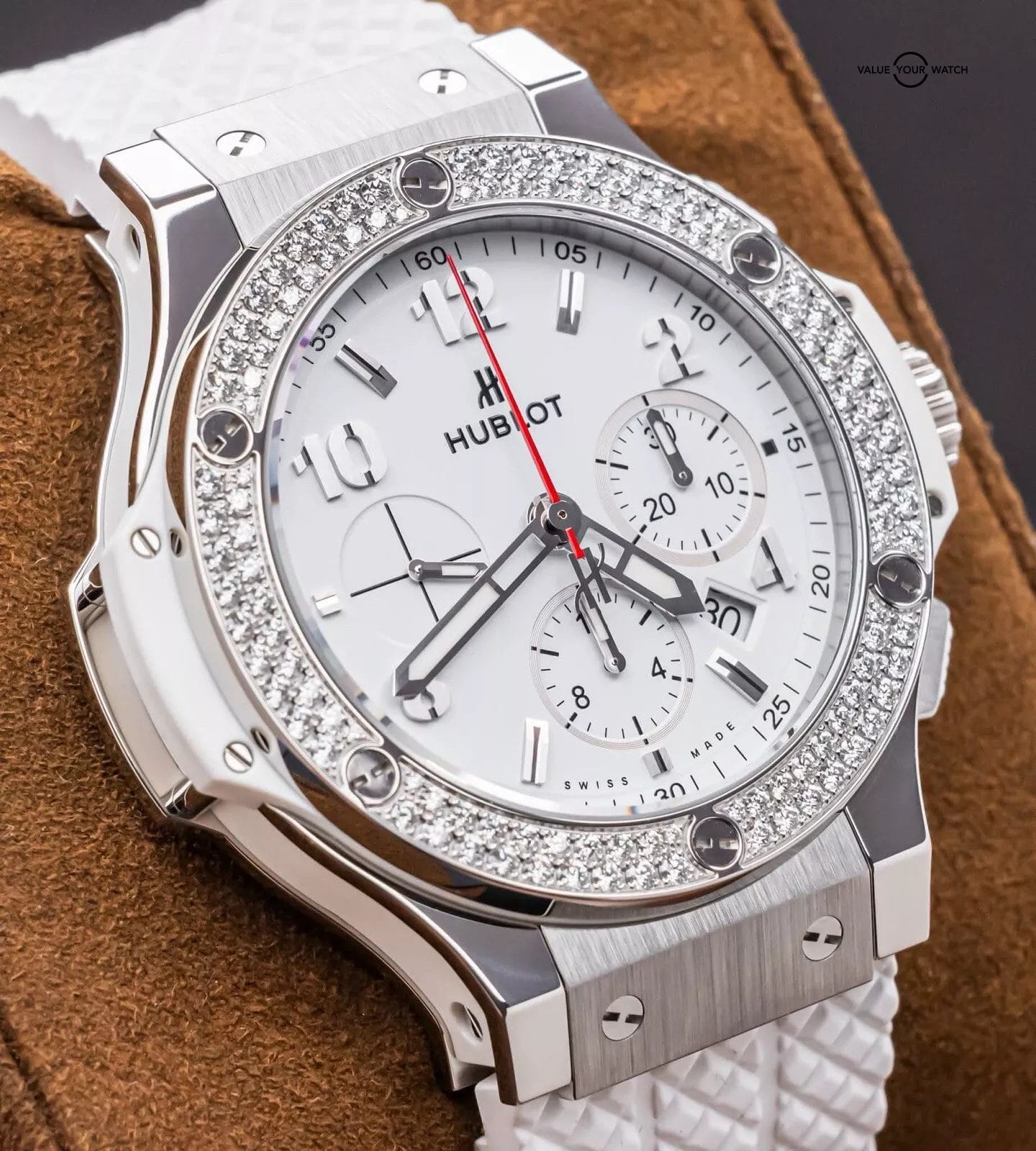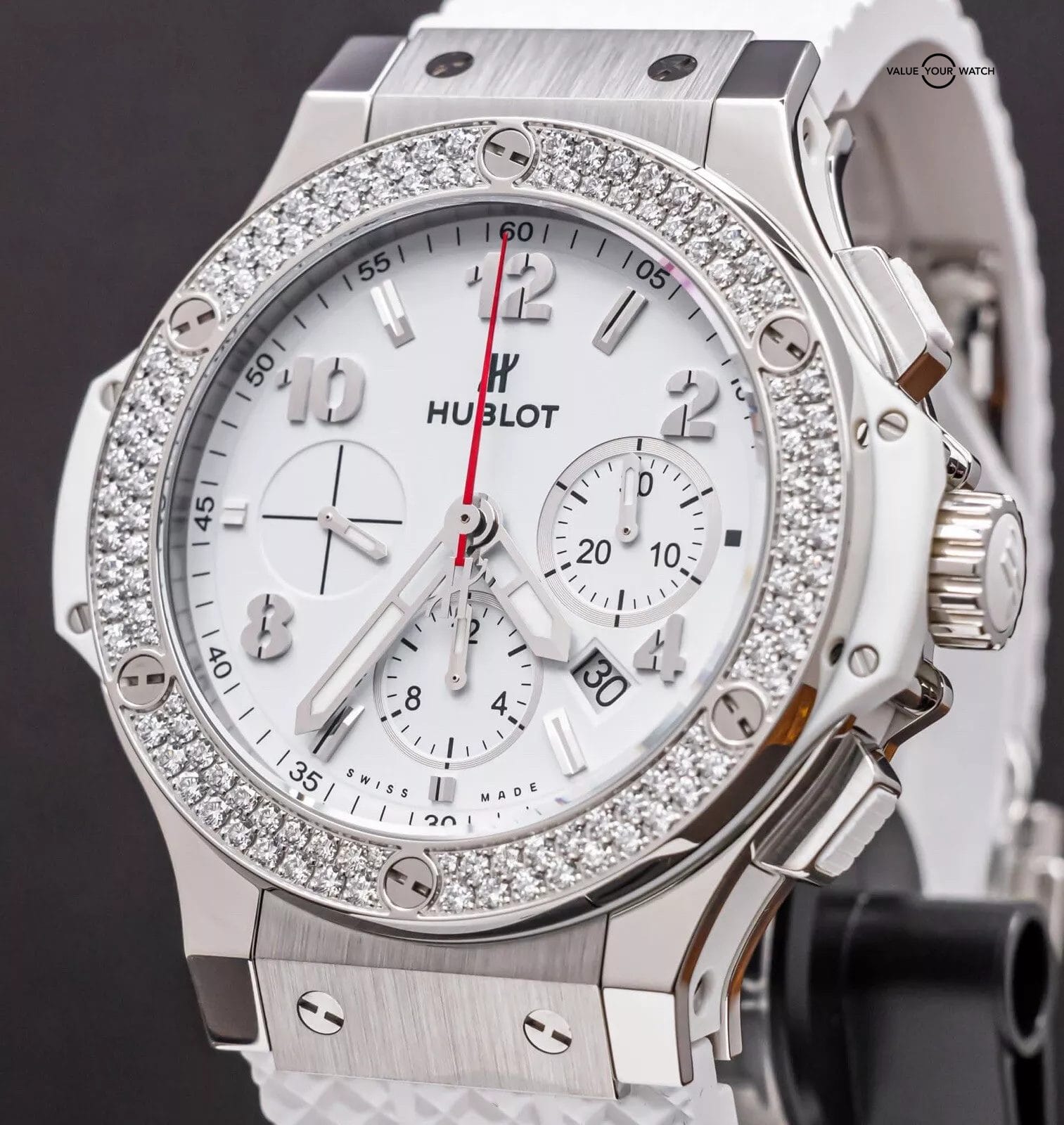 STUNNING Hublot Big Bang 44 in Stainless Steel with White Dial and FACTORY Hublot Diamond Bezel on White Hublot Structured Rubber! Arrives with original Hublot boxes and is keeping good time on my timegrapher when tested. This is A LOT of watch for the dollar on the secondary market, with an original MSRP of $19,300. KILLER on wrist!