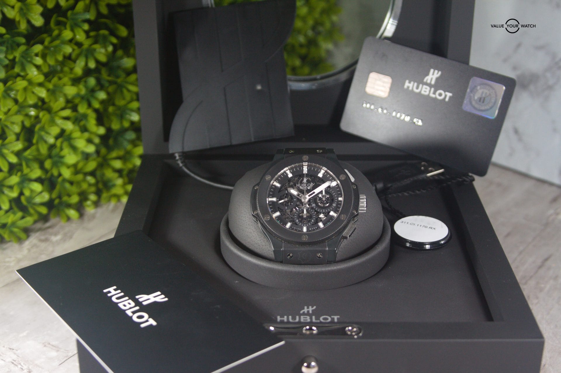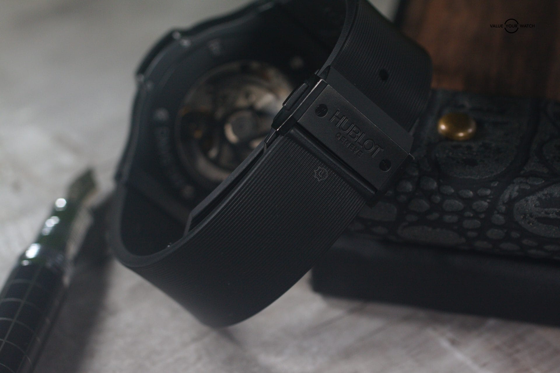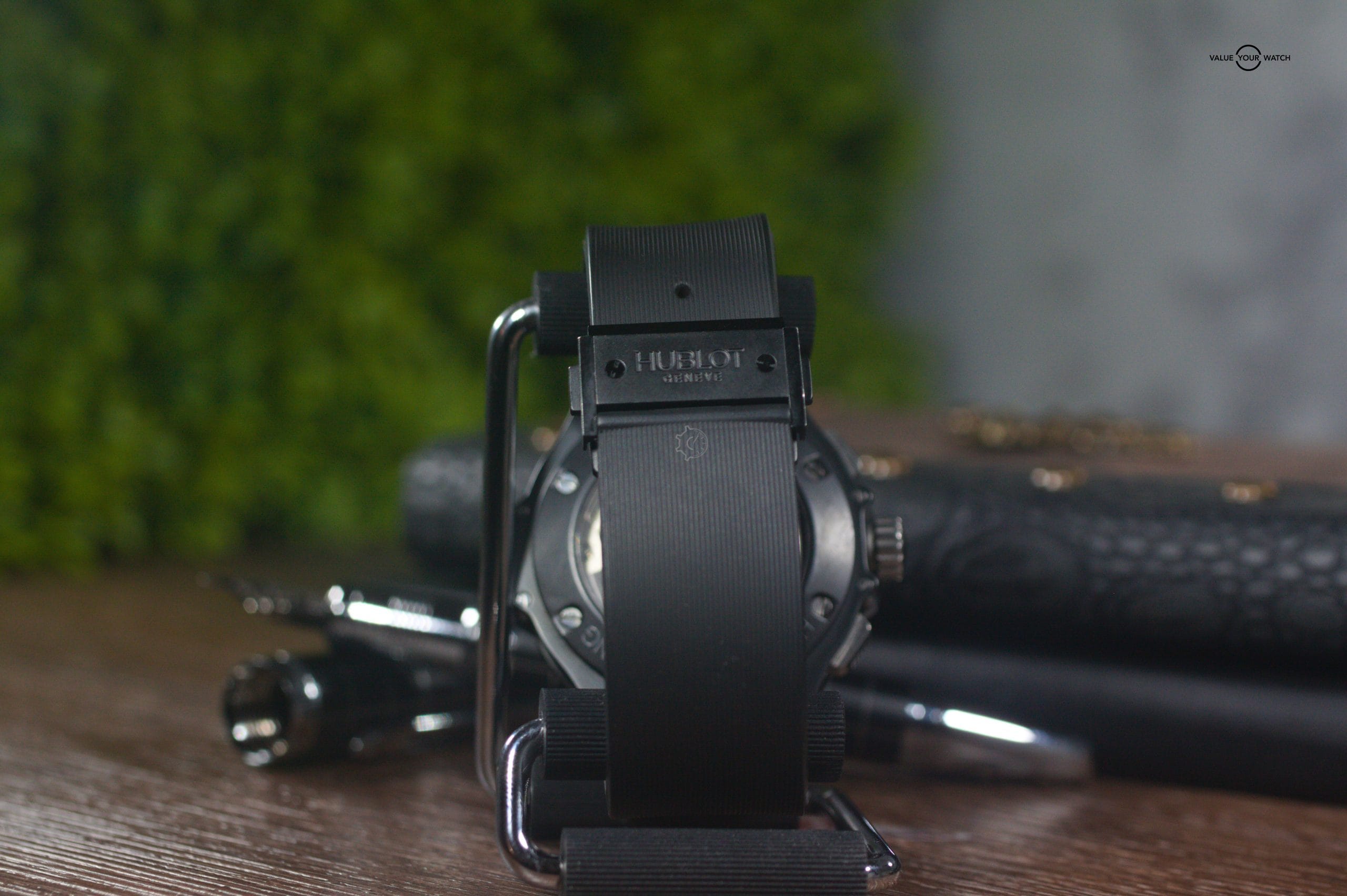 The Aero Bang comes with a black rubber strap that complements the design of the watch, ensuring it stays secure on your wrist with a black ceramic deployment buckle. As one of the most recognizable models from Hublot, the Big Bang Aero Bang is sure to turn heads & make a statement every time you wear it.