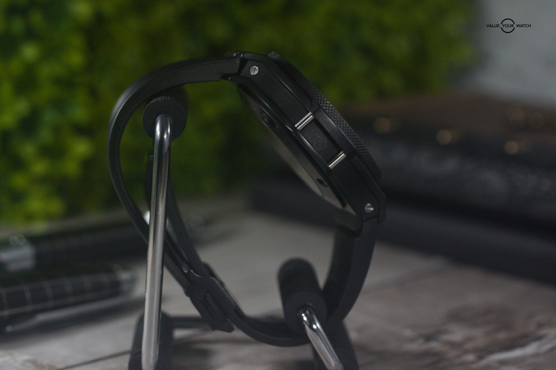 Crafted from high-quality ceramic, the 44mm case of the Aero Bang boasts an unmistakable industrial aesthetic, highlighted by exposed screws & a skeletonized dial. The striking black on black design is elevated by the distinctive hands, indexes, & Arabic numerals that are all coated in luminous material for easy readability even in low light.