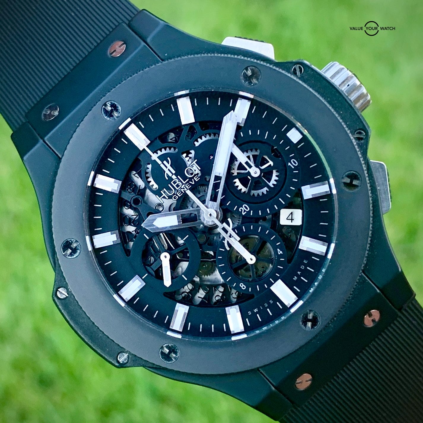 Set includes the original Hublot outer box/inner box, manufacturer’s warranty card, instruction manual, and hang tag.