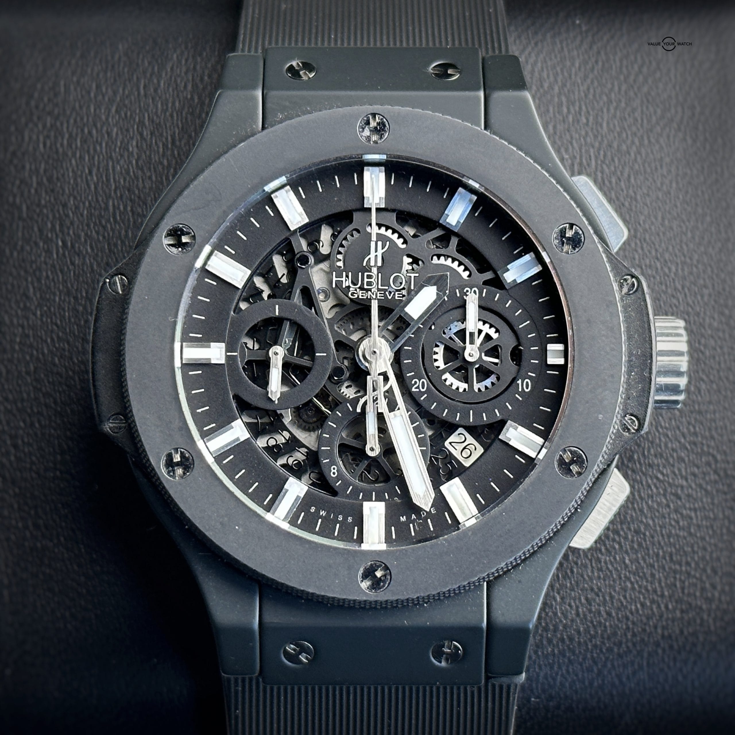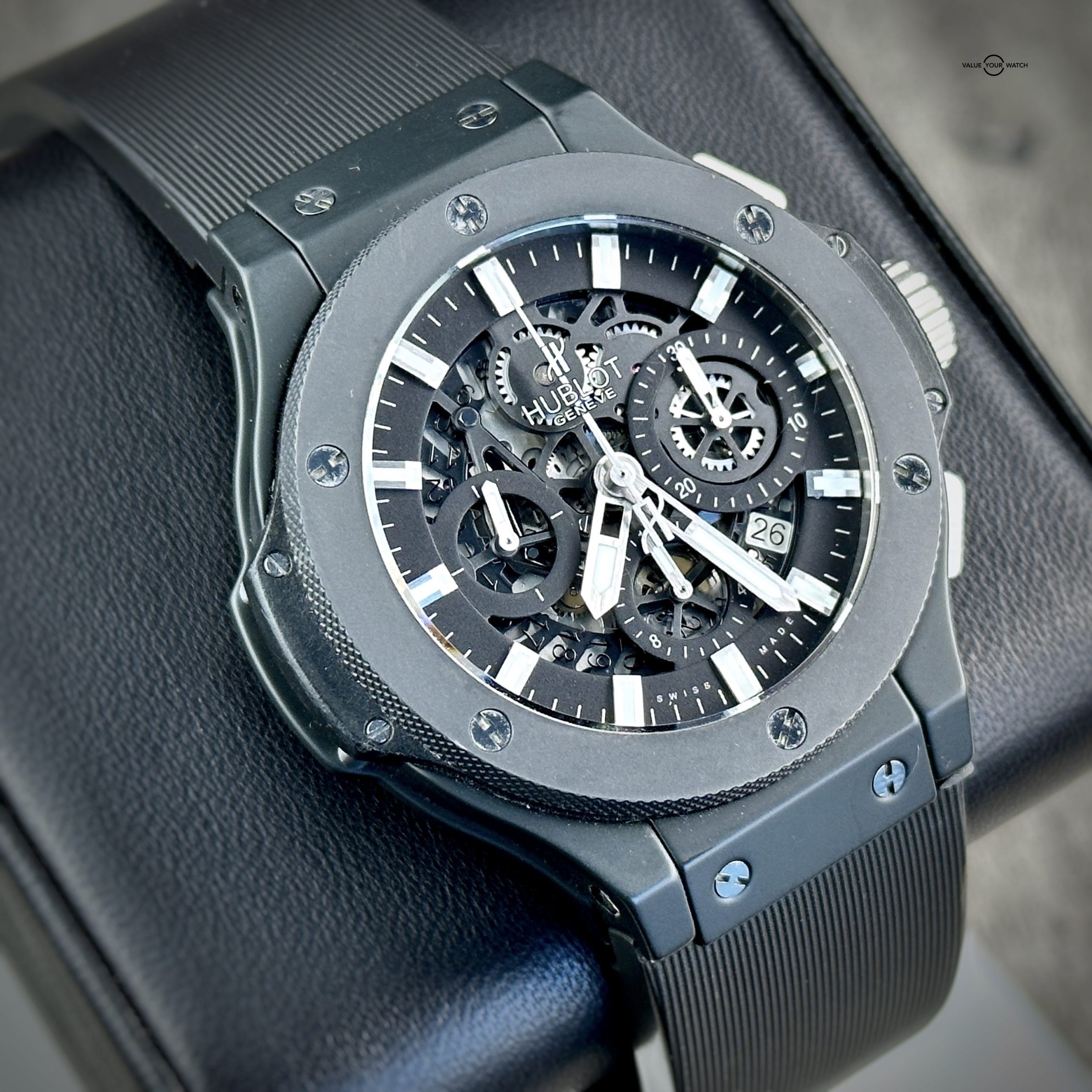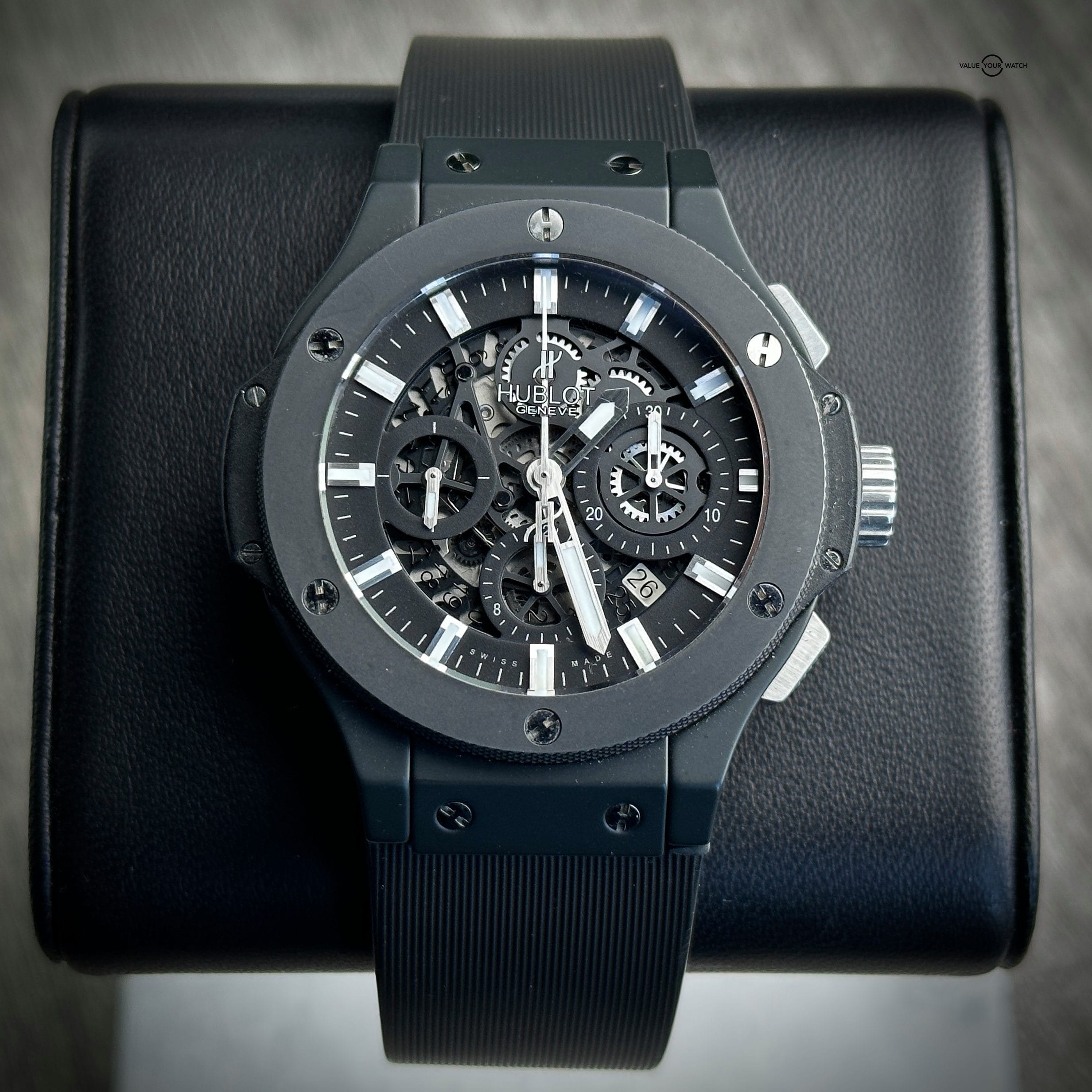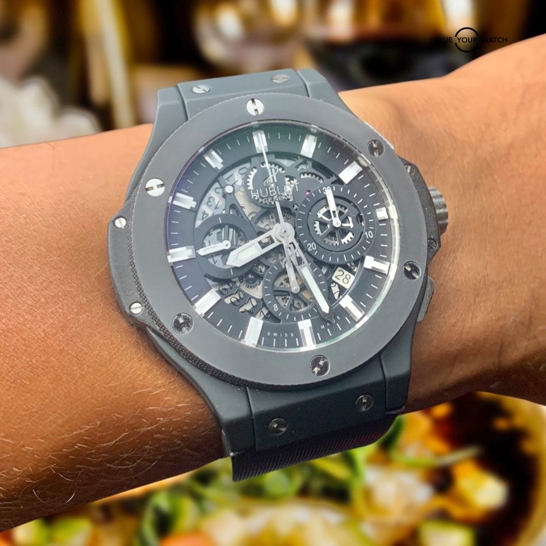 Up for sale: This Hublot Big Bang Aero Bang “Black Magic” 44mm Chronograph with the ultra sleek black ceramic bezel and matching black case. The skeleton dial is a staple feature of the Aero Bang. The exhibition see-through case back allows full view of this piece’s inner workings. Comes on OEM black rubber strap for versatility.