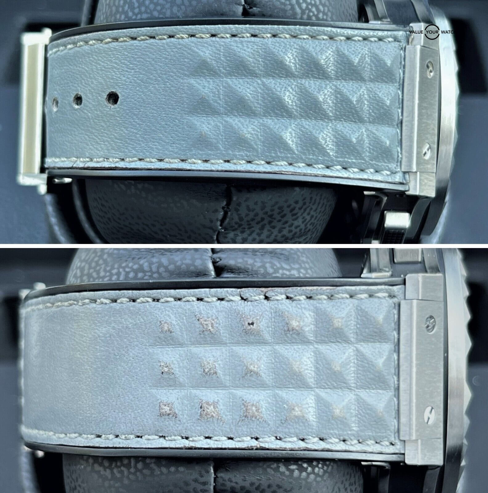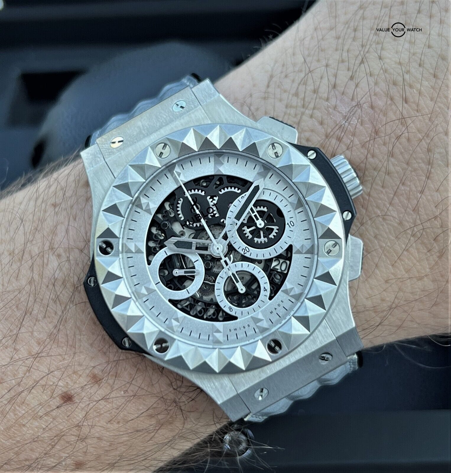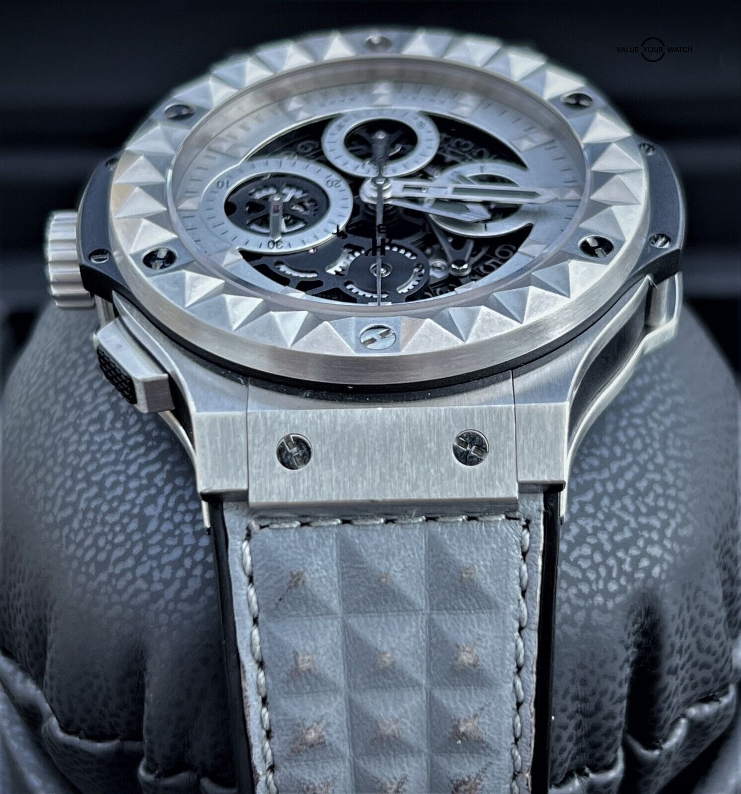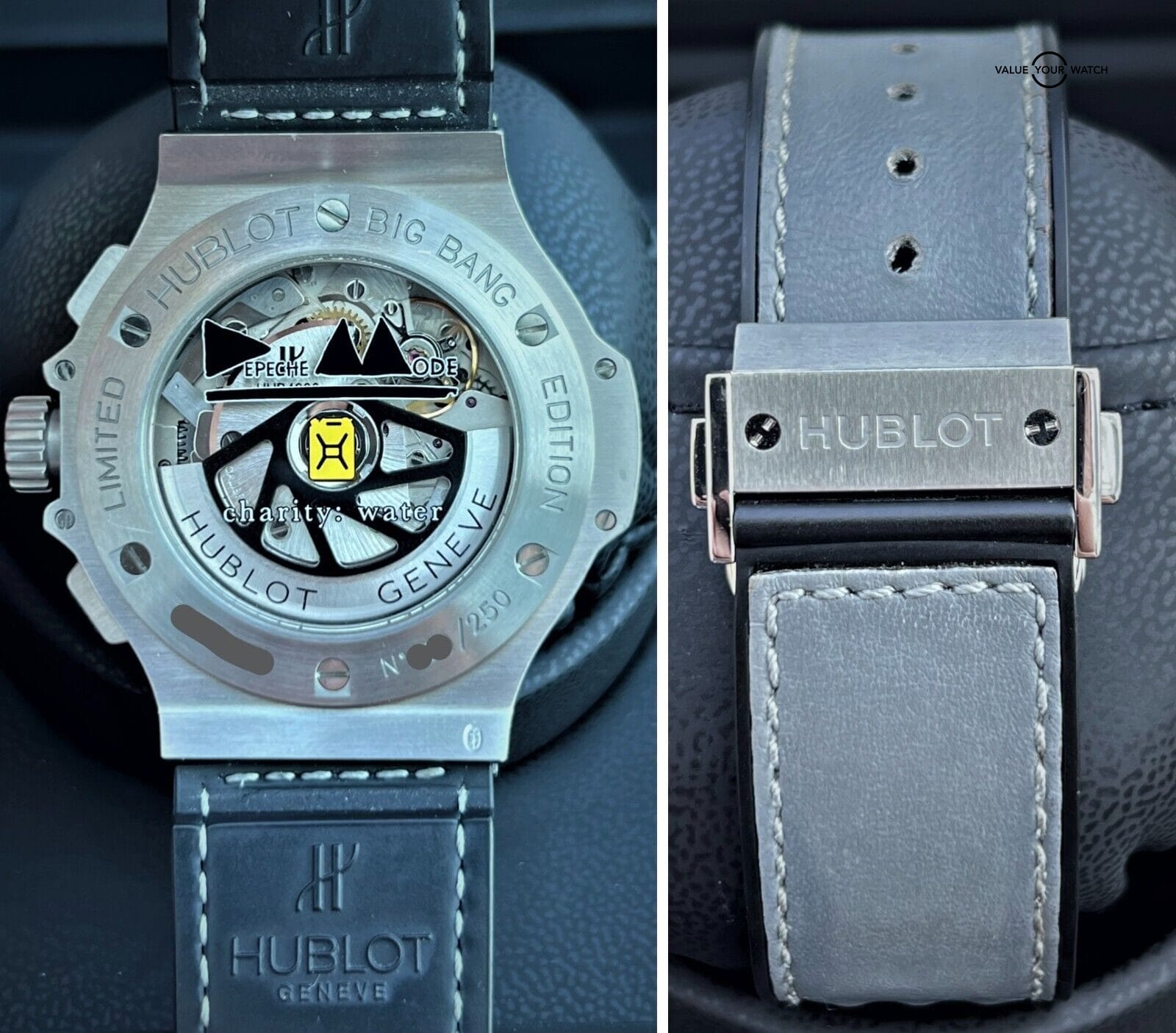 Hublot Big Bang Aero Bang Depeche Mode LE of 250 BOXES/PAPERS! This beautiful timepiece comes with a general Hublot inner/outer box set, watch and original warranty card. The timepiece is in excellent pre-owned condition with very minor cosmetic wear throughout. The pyramid studs on the 12 o clock strap side show some minor wear. The sapphire crystal is clean with no nicks or scratches. Everything Is functioning as it should. Serial numbers and names are blurred in photos only for privacy reasons. This version of the Depeche mode was introduced in 2014 for the organization “Charity: Water” in a 250-piece run. The Clous Pyramide “studs” on the bezel, strap, and hour markers make for a very distinct look. It is meant to be loud and statement worthy. Thus, being a must have for any watch collector who fancies themselves something eccentric & novelty. I am happy to answer all questions about the watch. Just reach out to me via messages. I have many references in the watch world and am happy to provide as many as needed. Feel free to search my username “thegolferguy” in the Rolex Forums under the “Who’s Who” section and see ample feedback.