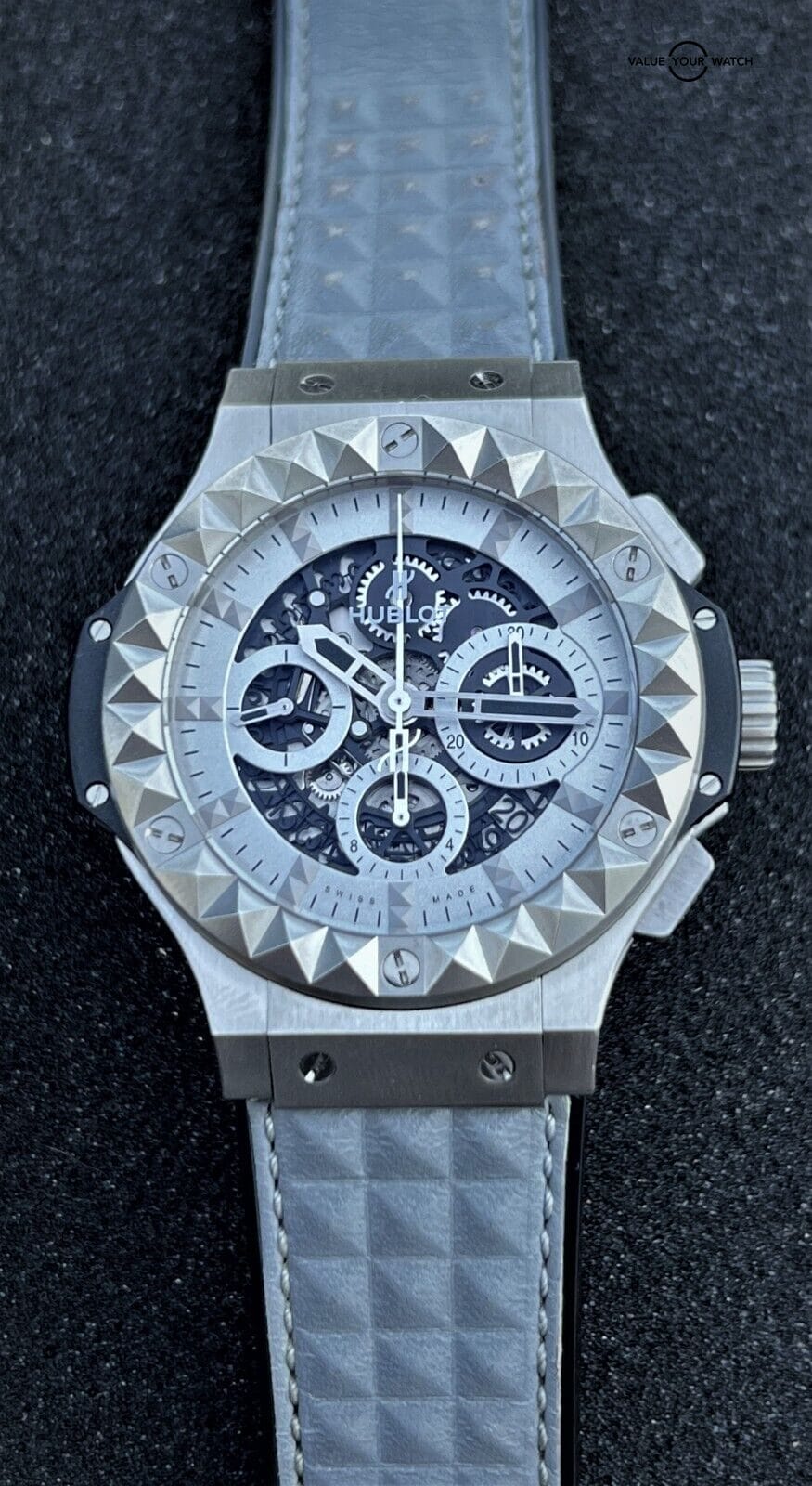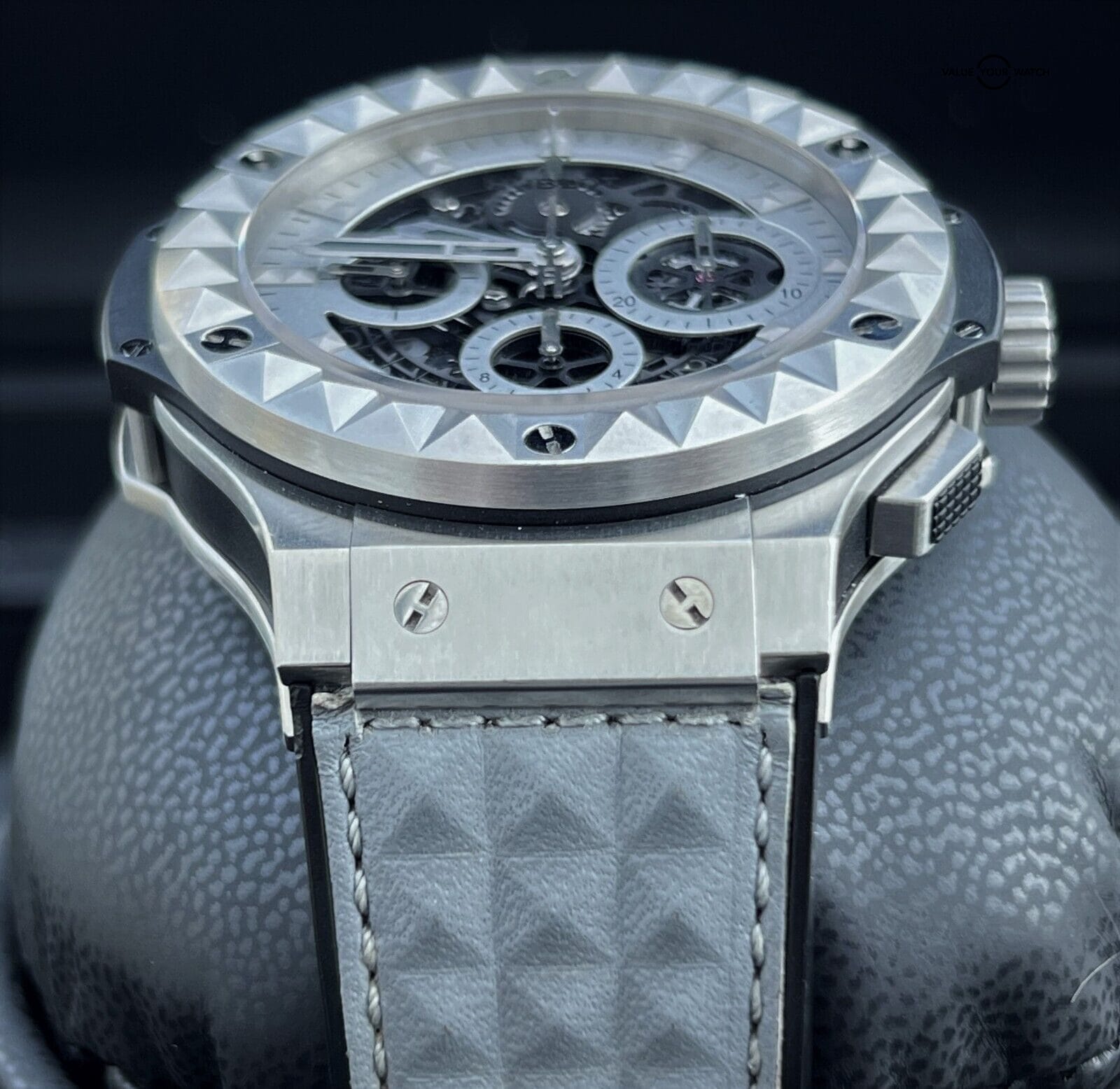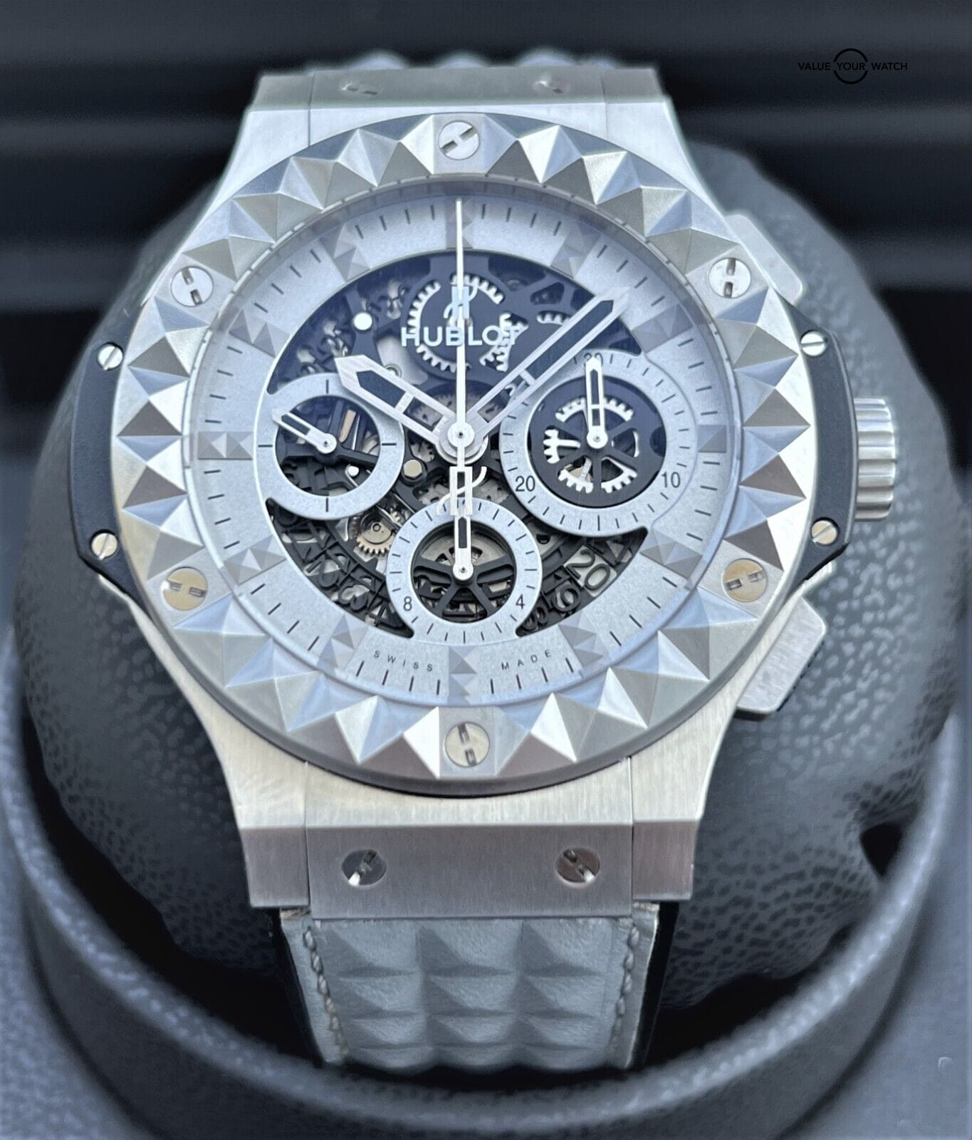Hublot Big Bang Aero Bang Depeche Mode LE of 250 BOXES/PAPERS! This beautiful timepiece comes with a general Hublot inner/outer box set, watch and original warranty card. The timepiece is in excellent pre-owned condition with very minor cosmetic wear throughout. The pyramid studs on the 12 o clock strap side show some minor wear. The sapphire crystal is clean with no nicks or scratches. Everything Is functioning as it should. Serial numbers and names are blurred in photos only for privacy reasons. This version of the Depeche mode was introduced in 2014 for the organization “Charity: Water” in a 250-piece run. The Clous Pyramide “studs” on the bezel, strap, and hour markers make for a very distinct look. It is meant to be loud and statement worthy. Thus, being a must have for any watch collector who fancies themselves something eccentric & novelty. I am happy to answer all questions about the watch. Just reach out to me via messages. I have many references in the watch world and am happy to provide as many as needed. Feel free to search my username “thegolferguy” in the Rolex Forums under the “Who’s Who” section and see ample feedback.
