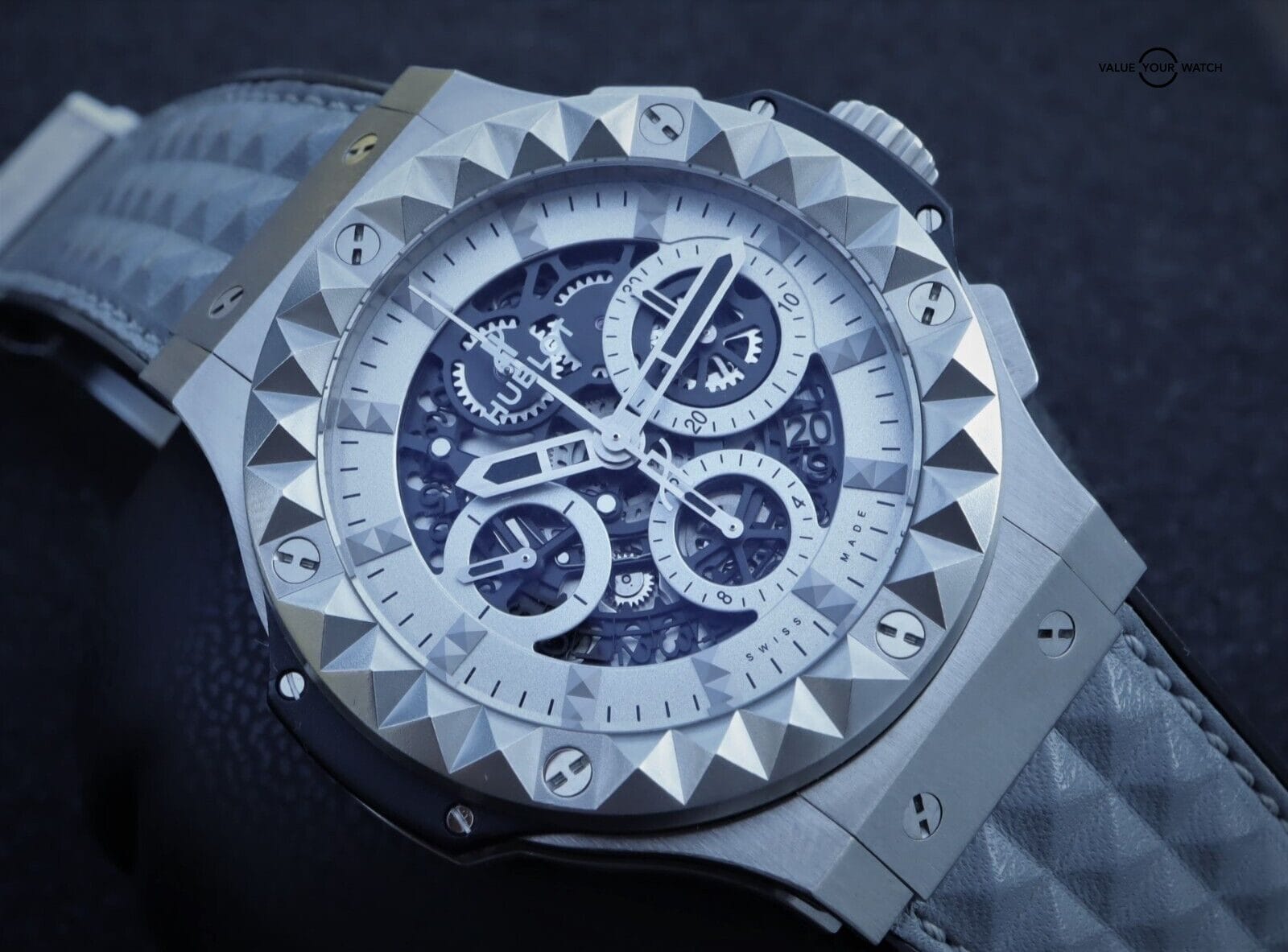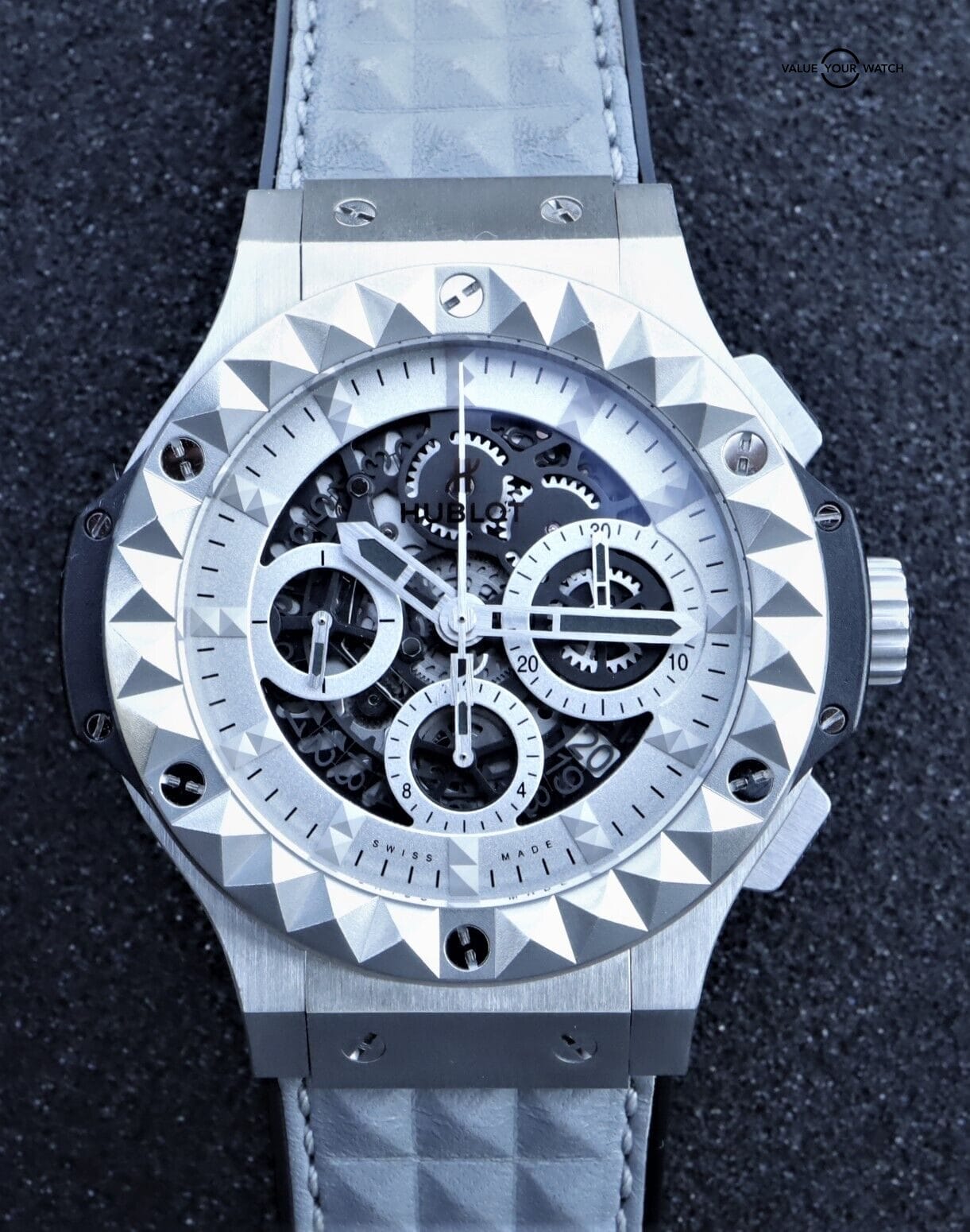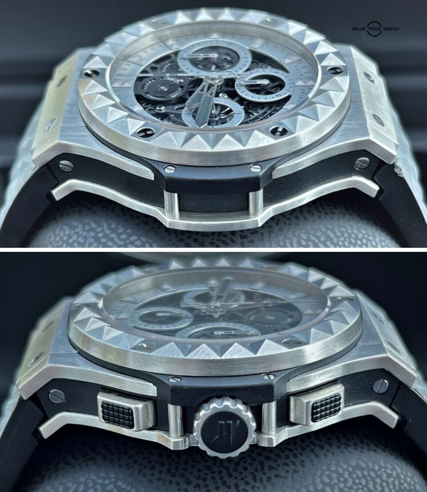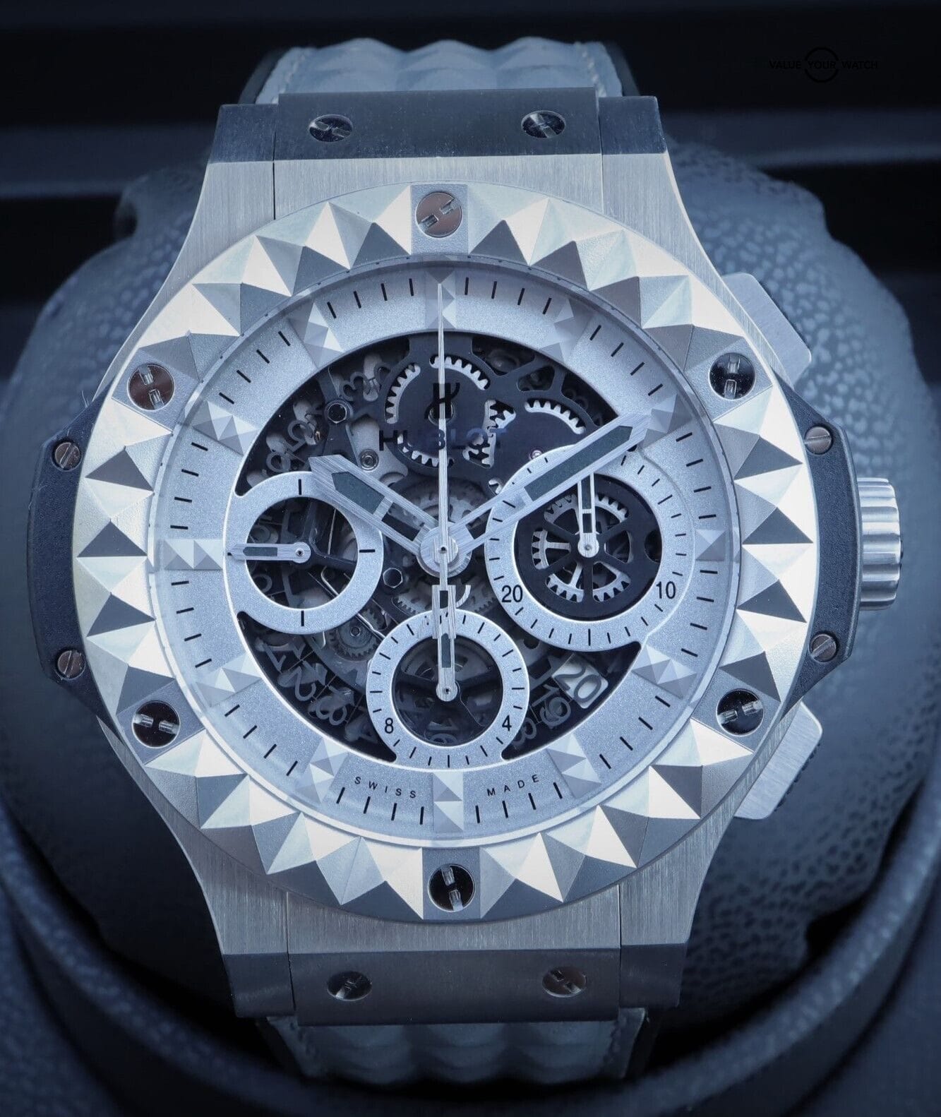 Hublot Big Bang Aero Bang Depeche Mode LE of 250 BOXES/PAPERS! This beautiful timepiece comes with a general Hublot inner/outer box set, watch and original warranty card. The timepiece is in excellent pre-owned condition with very minor cosmetic wear throughout. The pyramid studs on the 12 o clock strap side show some minor wear. The sapphire crystal is clean with no nicks or scratches. Everything Is functioning as it should. Serial numbers and names are blurred in photos only for privacy reasons. This version of the Depeche mode was introduced in 2014 for the organization “Charity: Water” in a 250-piece run. The Clous Pyramide “studs” on the bezel, strap, and hour markers make for a very distinct look. It is meant to be loud and statement worthy. Thus, being a must have for any watch collector who fancies themselves something eccentric & novelty. I am happy to answer all questions about the watch. Just reach out to me via messages. I have many references in the watch world and am happy to provide as many as needed. Feel free to search my username “thegolferguy” in the Rolex Forums under the “Who’s Who” section and see ample feedback.
