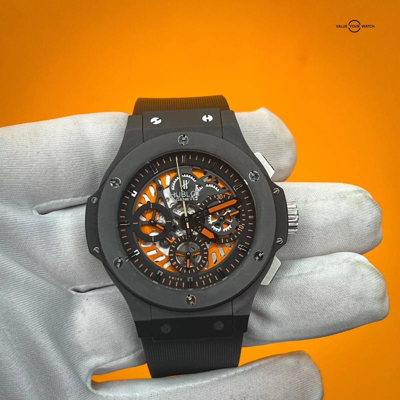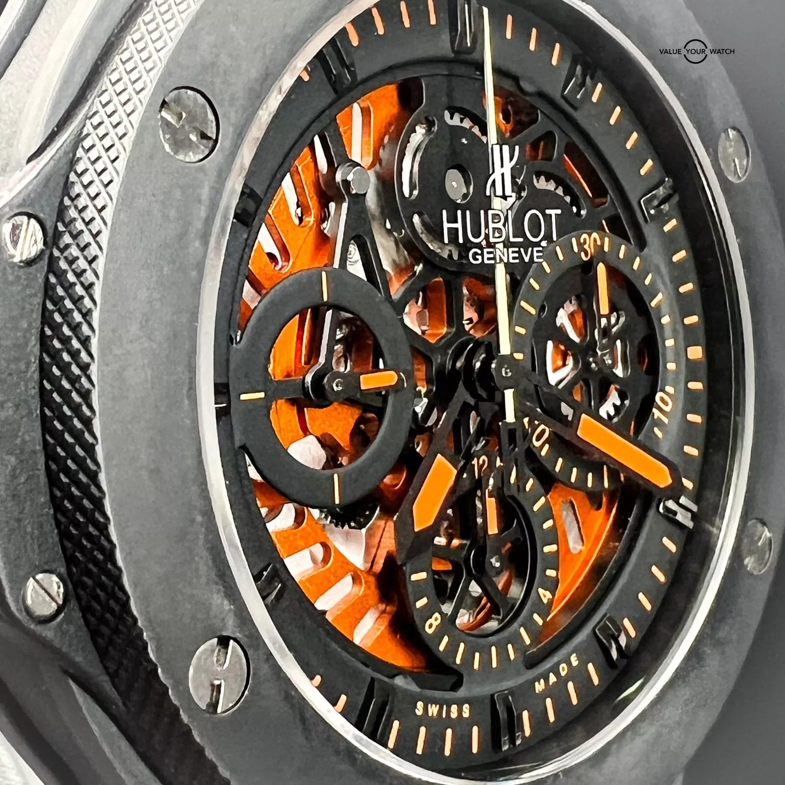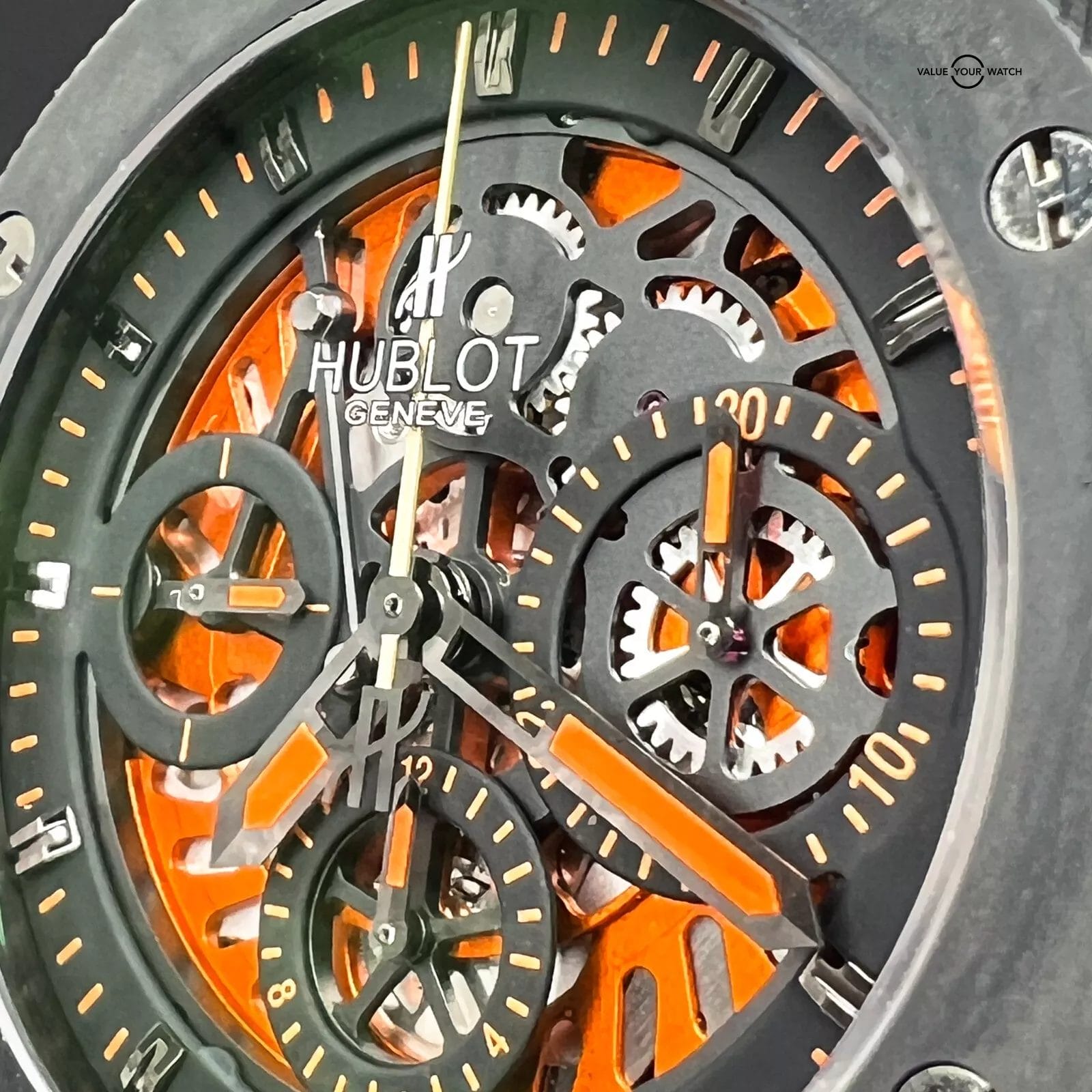The Hublot Big Bang 310.CI.1190.RX.AB010 with a Limited Edition of only 500 Worldwide features a captivating two-tone textured skeleton dial, accentuated by three subdials at 3, 6, and 9 o’clock, and a date display positioned between 4 and 5 o’clock. Adding a unique touch, hints of orange infuse the timepiece with an unparalleled style, making it a standout addition to your collection.