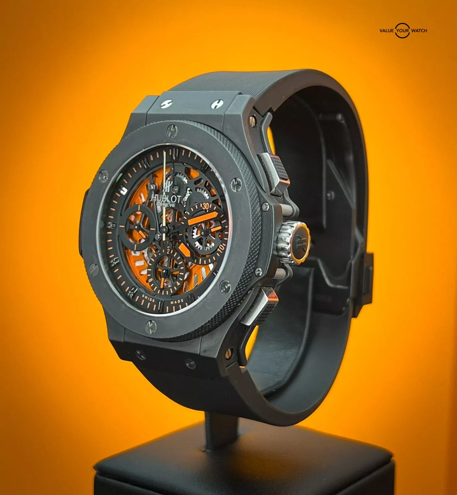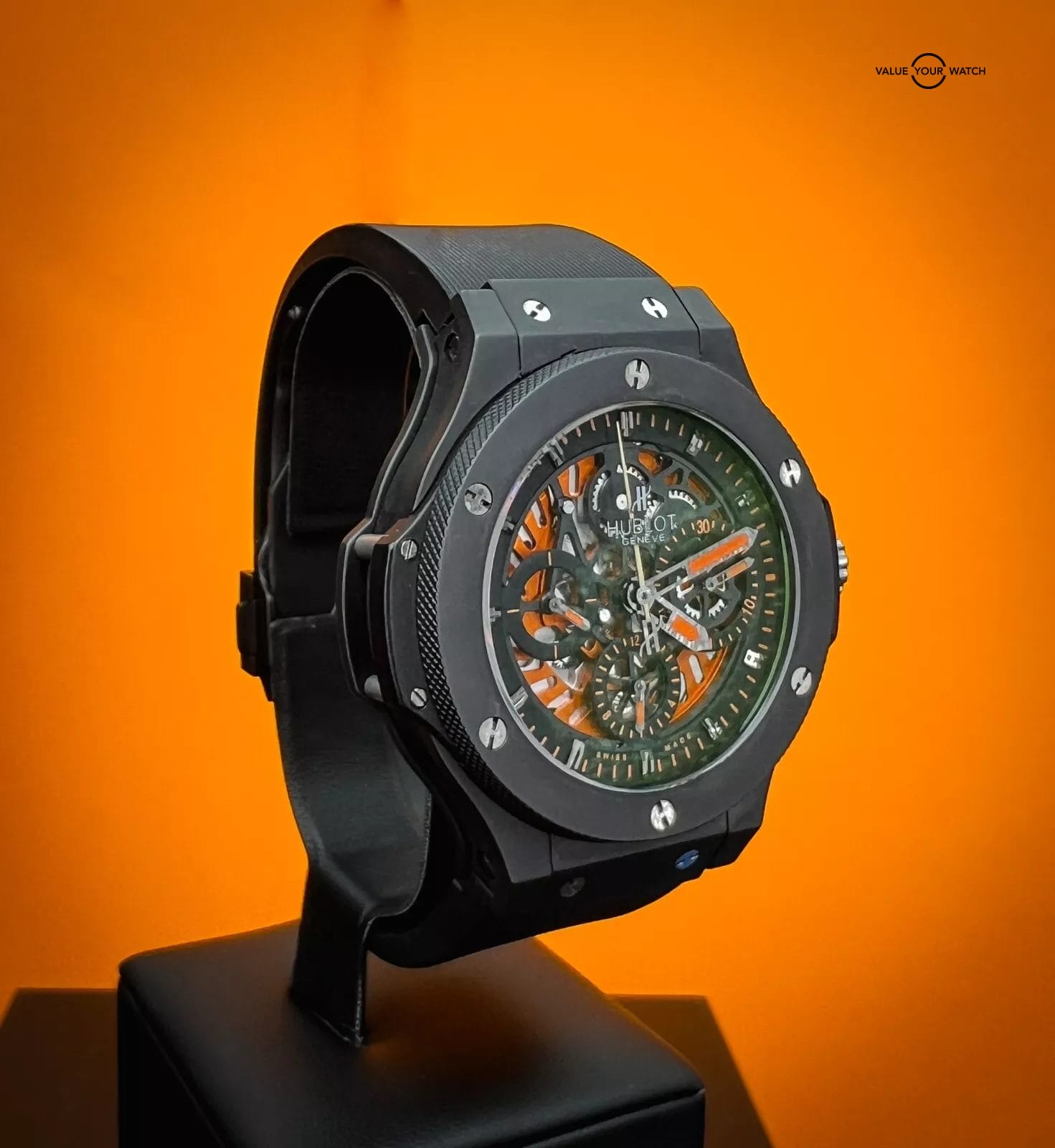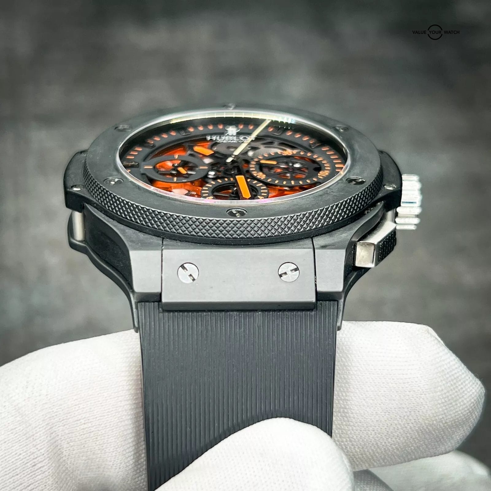 The Hublot Big Bang 310.CI.1190.RX.AB010 with a Limited Edition of only 500 Worldwide features a captivating two-tone textured skeleton dial, accentuated by three subdials at 3, 6, and 9 o’clock, and a date display positioned between 4 and 5 o’clock. Adding a unique touch, hints of orange infuse the timepiece with an unparalleled style, making it a standout addition to your collection.