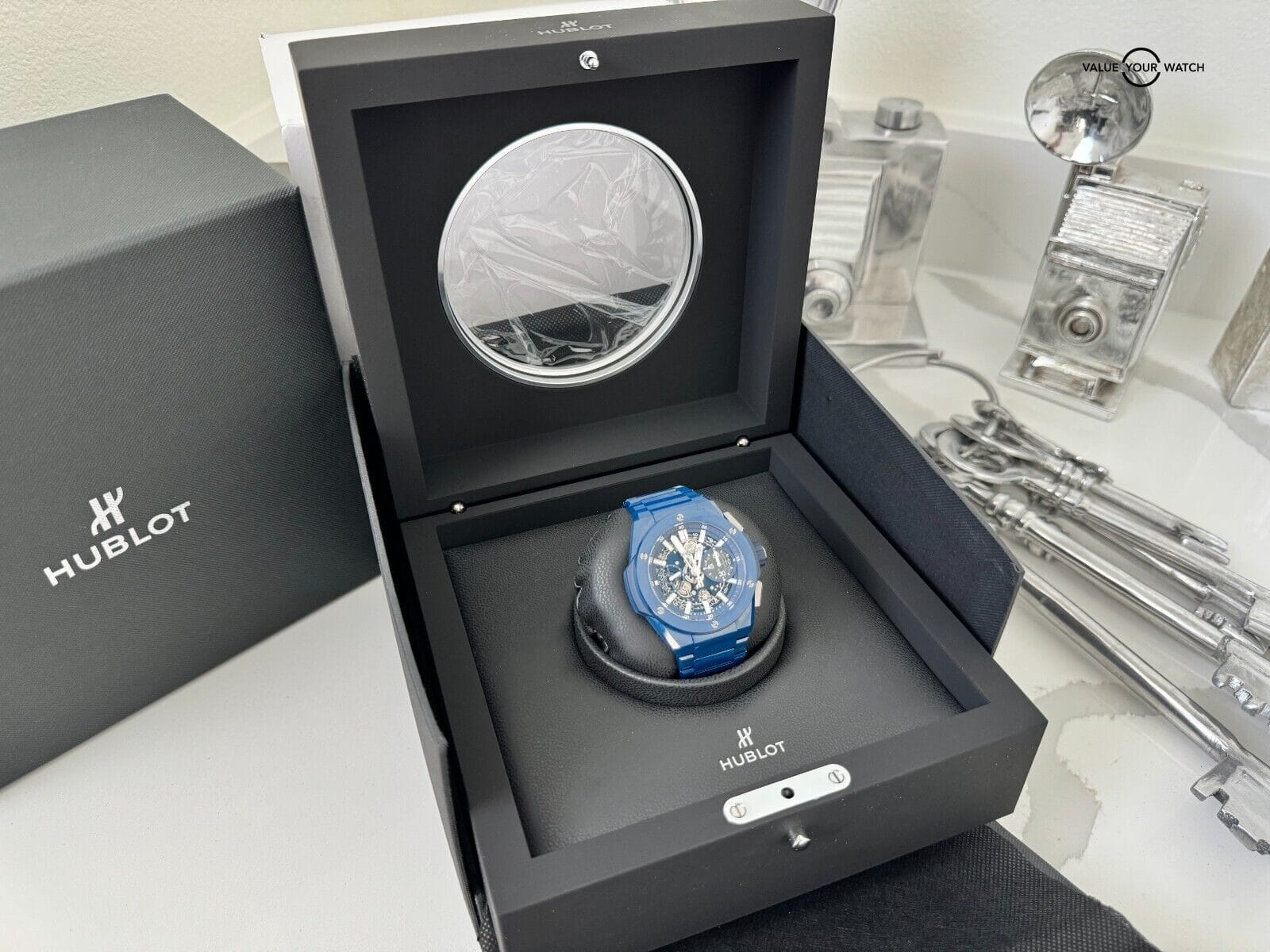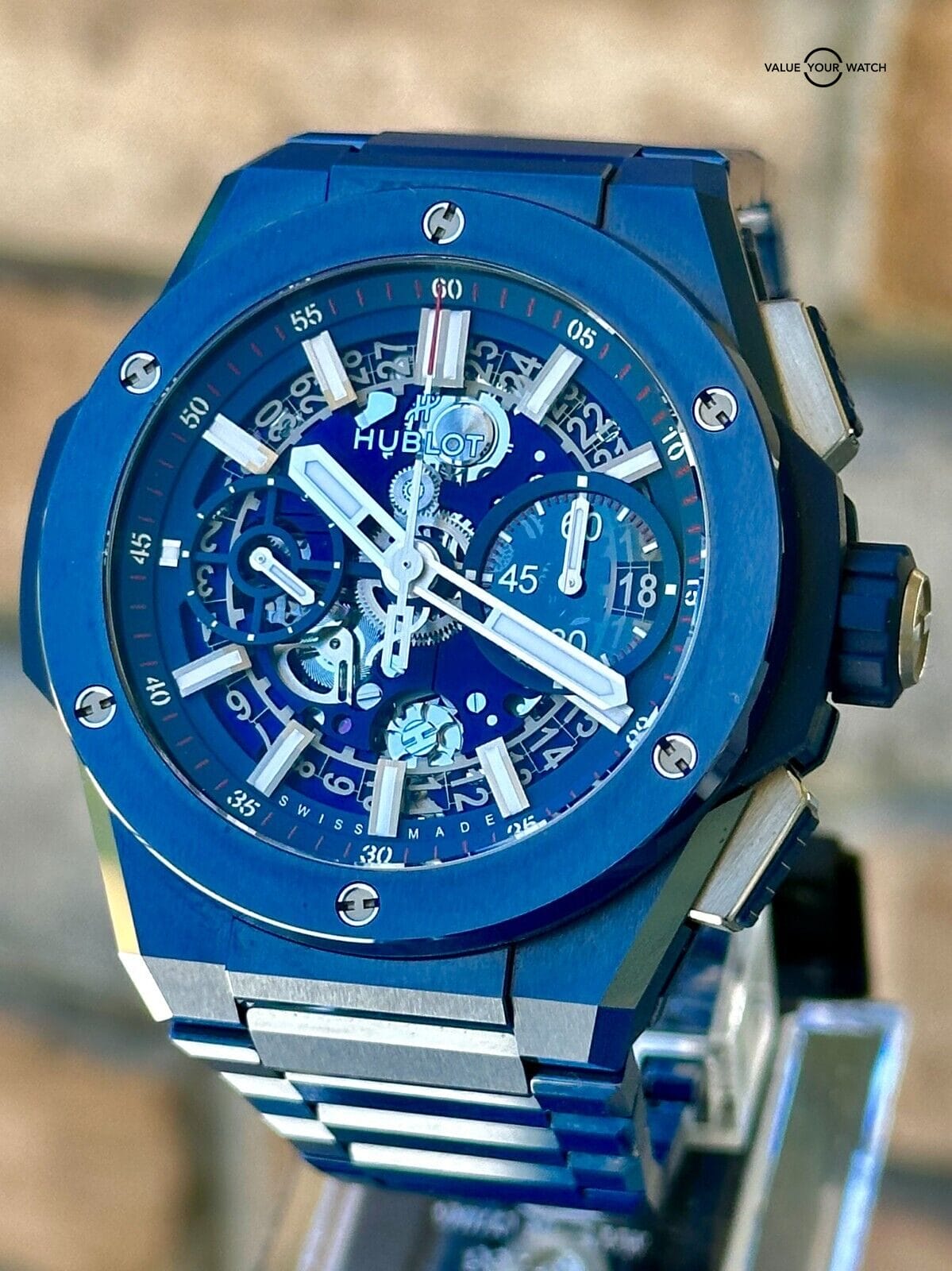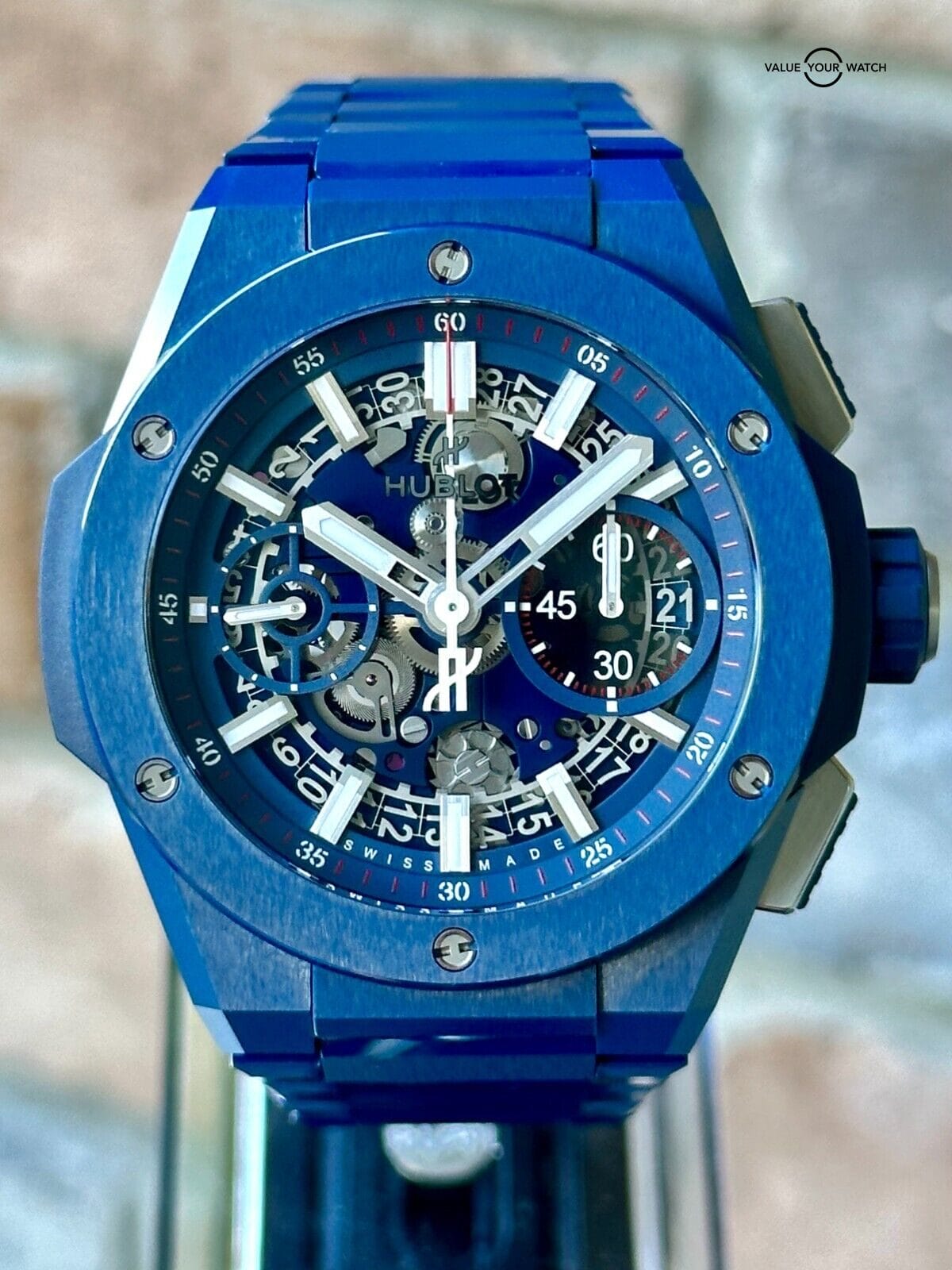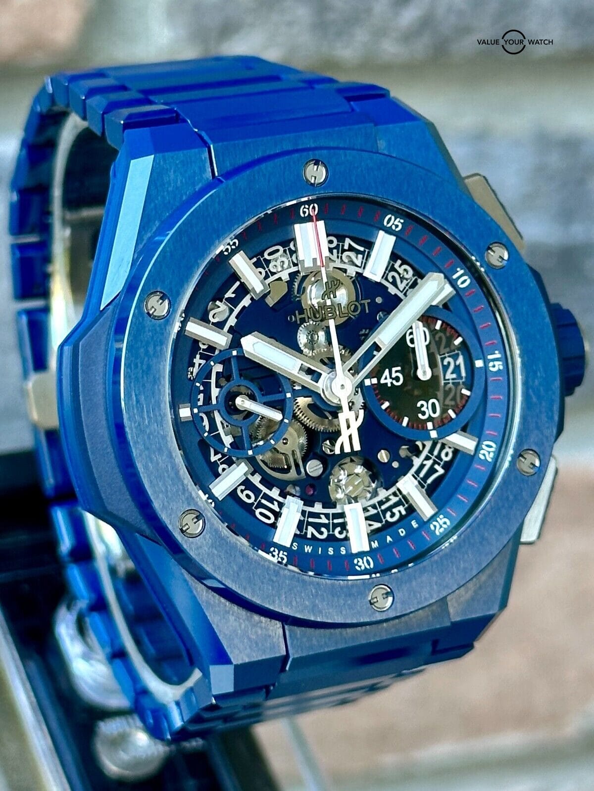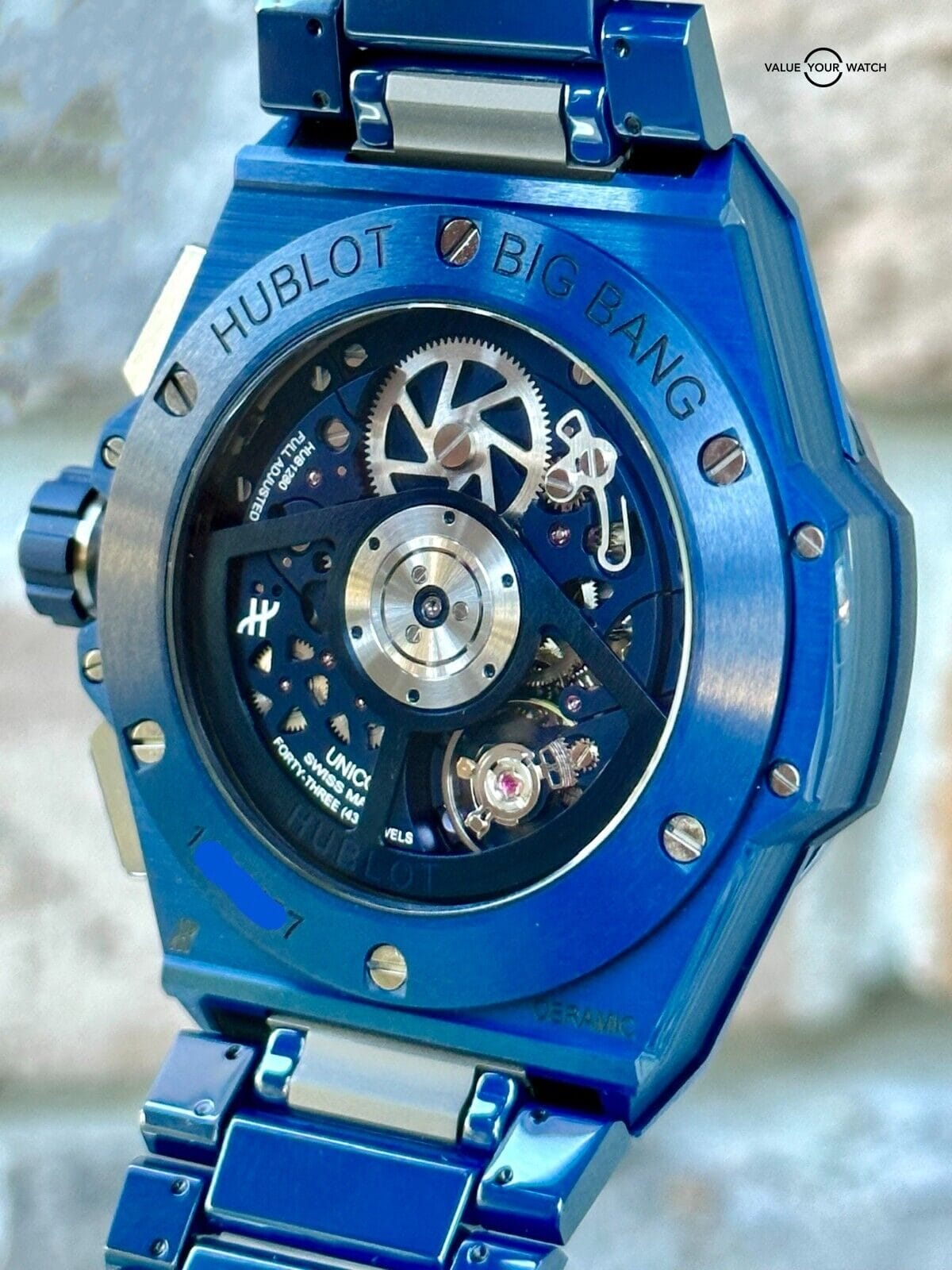Hello and thanks for visiting my listing!I’m a personal collector of unique and intriguing timepieces and I enjoy collecting and trading sets that are very difficult to find. I stand behind every set I offer with 14 days no questions asked full refunds, and am always happy to answer questions in advance of your purchase. You can find me everywhere with crismoffitt and I look forward to interacting!¬† -CrisHublot Big Bang Integral Chronograph in Black Ceramic – 2021 Full SetThe Hublot Big Bang Integrated Chronograph in blue ceramic is a statement piece of horology that is both stylish and functional. The case is made of high-tech blue ceramic, which is scratch-resistant and virtually indestructible. The bezel is also made of blue ceramic and features six H-shaped titanium screws. The dial is a matte blue skeleton dial that reveals the inner workings of the HUB1280 UNICO manufacture self-winding chronograph flyback movement. The movement has a 72-hour power reserve and is visible through the sapphire crystal case back.The watch is water resistant to 100 meters (10 ATM) and is fitted with a satin-finished and polished blue ceramic bracelet with a titanium deployant buckle. The Hublot Big Bang Integral Chronograph in blue ceramic is a perfect watch for the discerning individual who wants a stylish and durable timepiece that will last a lifetime.Features:* 42mm blue ceramic case* Blue ceramic bezel with 6 H-shaped titanium screws* Skeleton dial* HUB1280 UNICO manufacture self-winding chronograph flyback movement* 72-hour power reserve* Sapphire crystal case back* Water resistant to 100 meters (10 ATM)* Satin-finished and polished blue ceramic bracelet* Titanium deployant buckleBenefits:* Scratch-resistant and virtually indestructible* Stylish and functional* Durable and long-lasting* Made with high-quality materials* A perfect watch for the discerning individualOwn the Hublot Big Bang Integrated Chronograph in blue ceramic today and experience the difference that a truly luxurious timepiece can make.Ref# 451.EX.5123.EX