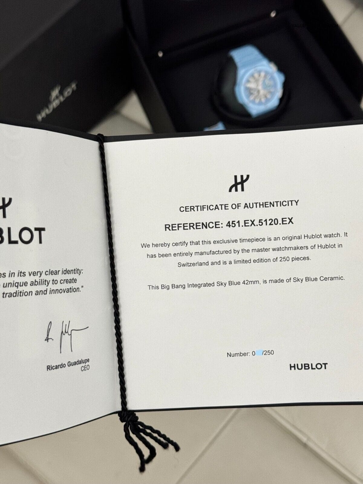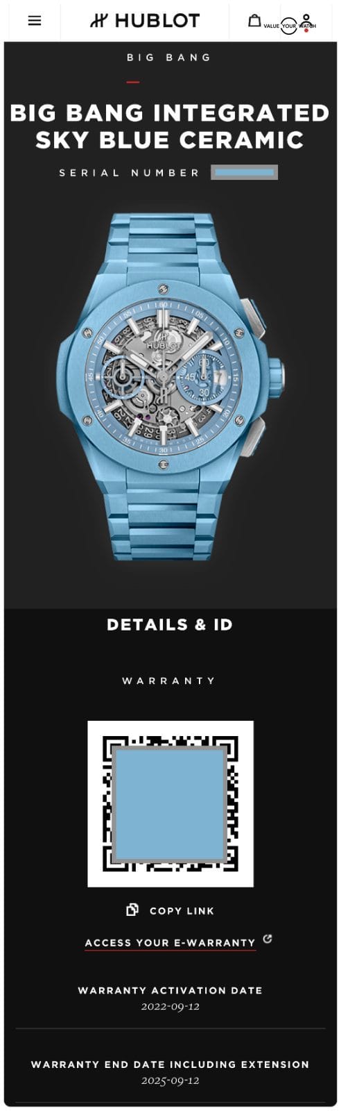 Hublot stands behind the quality and craftsmanship of their timepieces, and the Big Bang Integrated Sky Blue Ceramic is no exception. It comes with a warranty that extends until 2025, providing peace of mind for your investment.