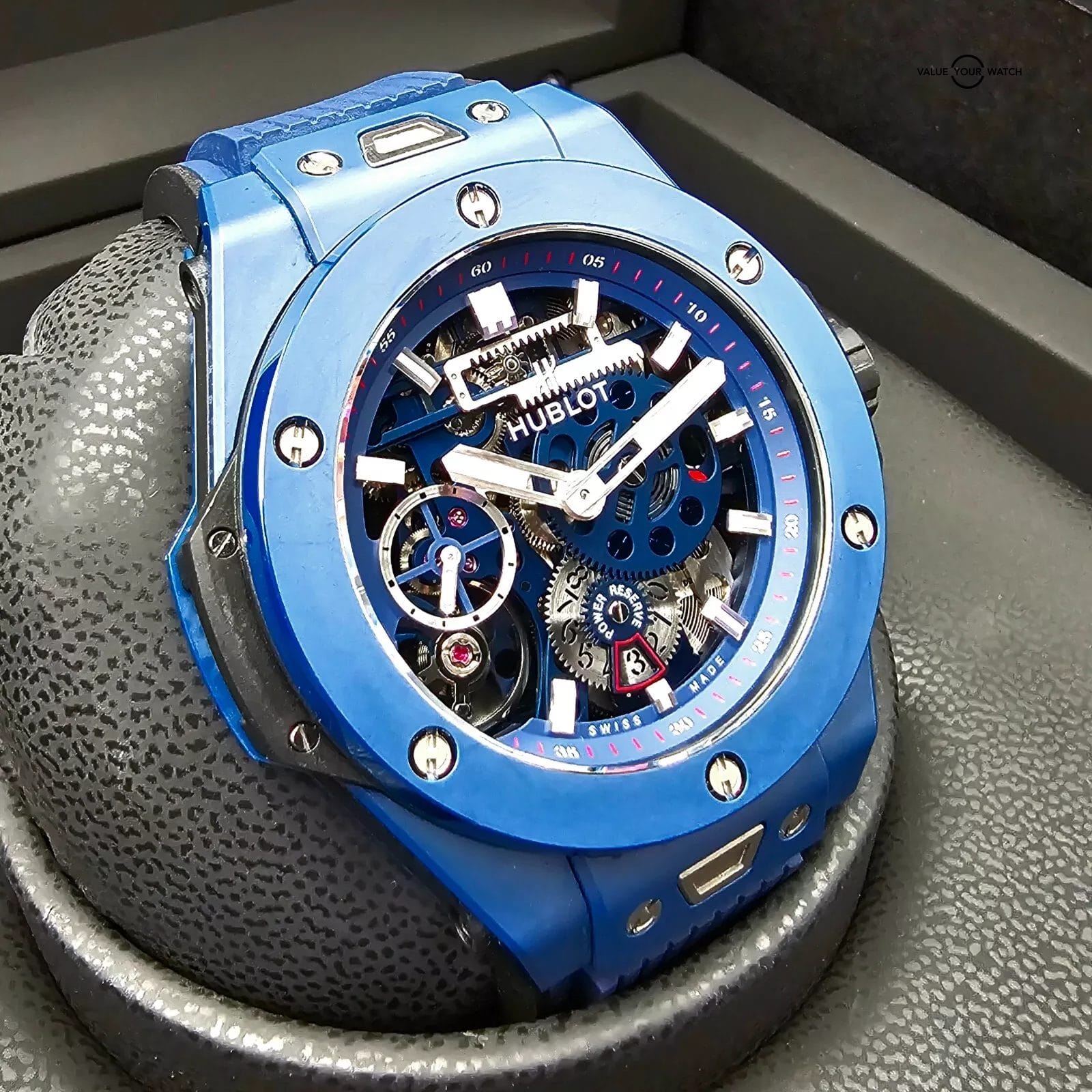 The Meca-10 is a completely in-house movement designed by Hublot, and allows up to 10 days of power reserve before it needs to be wound again. Blue ceramic as a case material also helps to make this timepiece special- ceramic is a very strong and scratch resistant material, and it still look brand new!