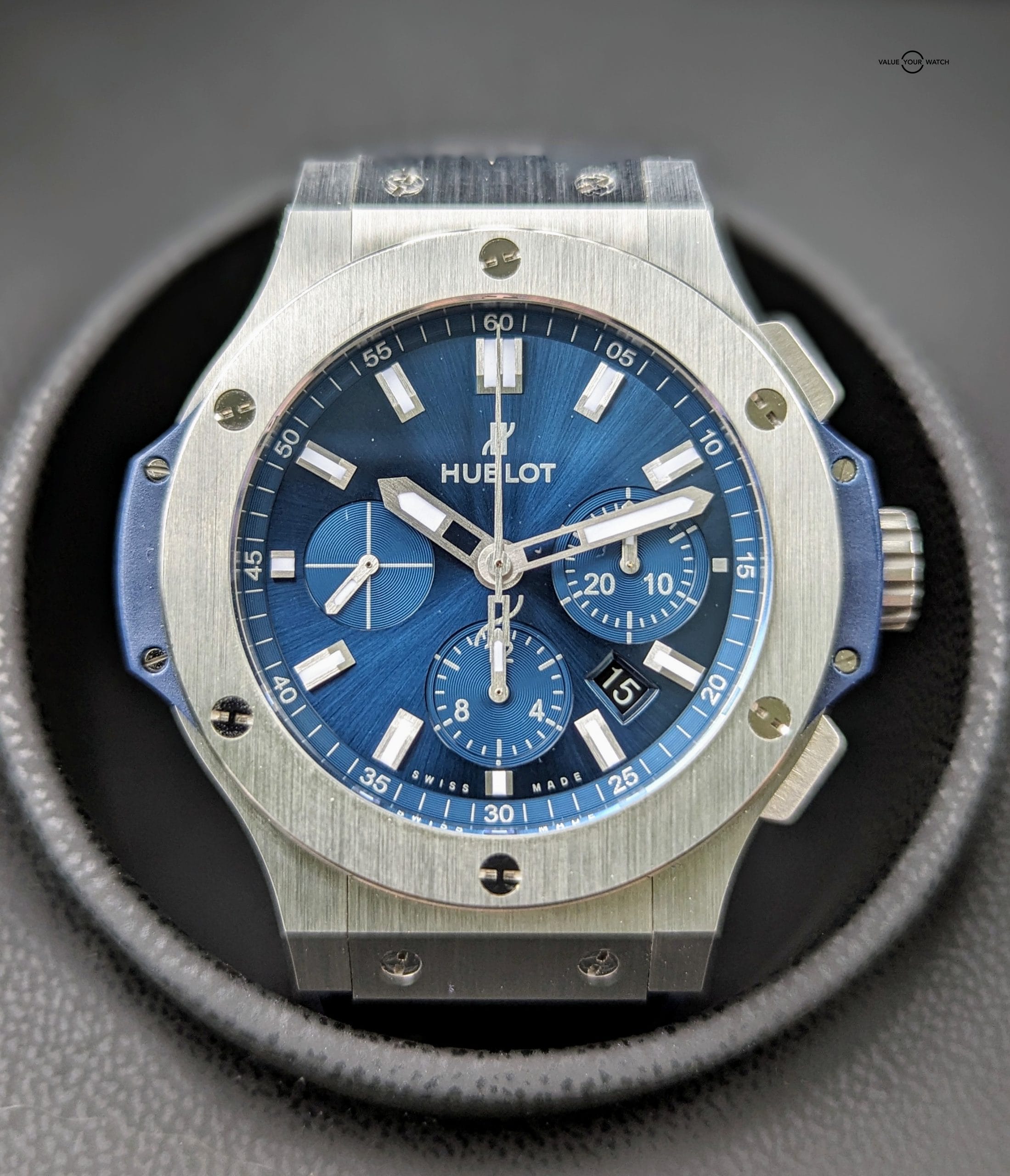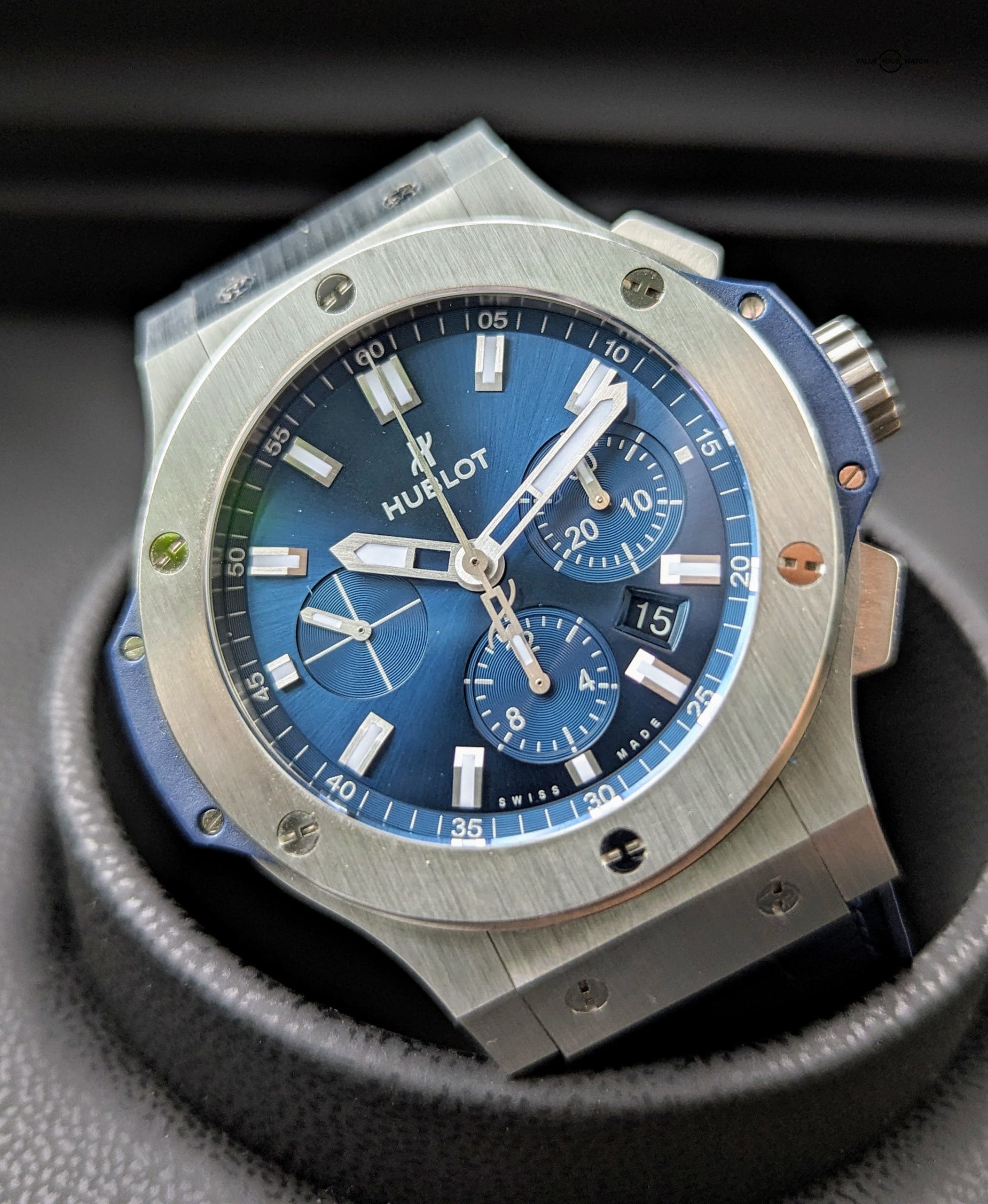 Available for purchase is this Sporty Hublot Big Bang Original Steel Blue. With the blue sunburst dial, it’s perfect for the man who appreciates luxury and sporty design elements, and who also wants to stand out in a crowd of standard looking sport watches from the R brand. The case and bezel are stainless steel, while bezel has titanium H shaped screws securing it in place. Adding to the sportiness of this timepiece, is the sapphire exhibition case bask displaying the ETA based Hublot HUB4100 Chronograph movement.