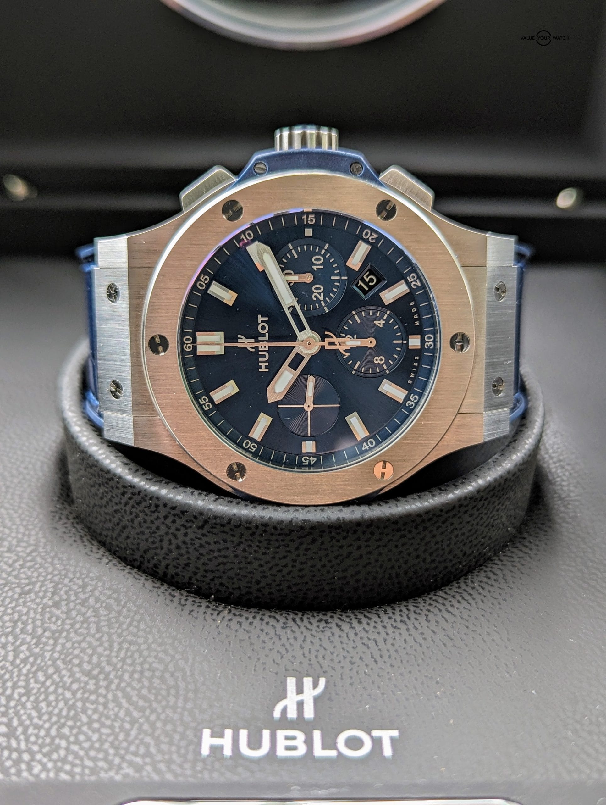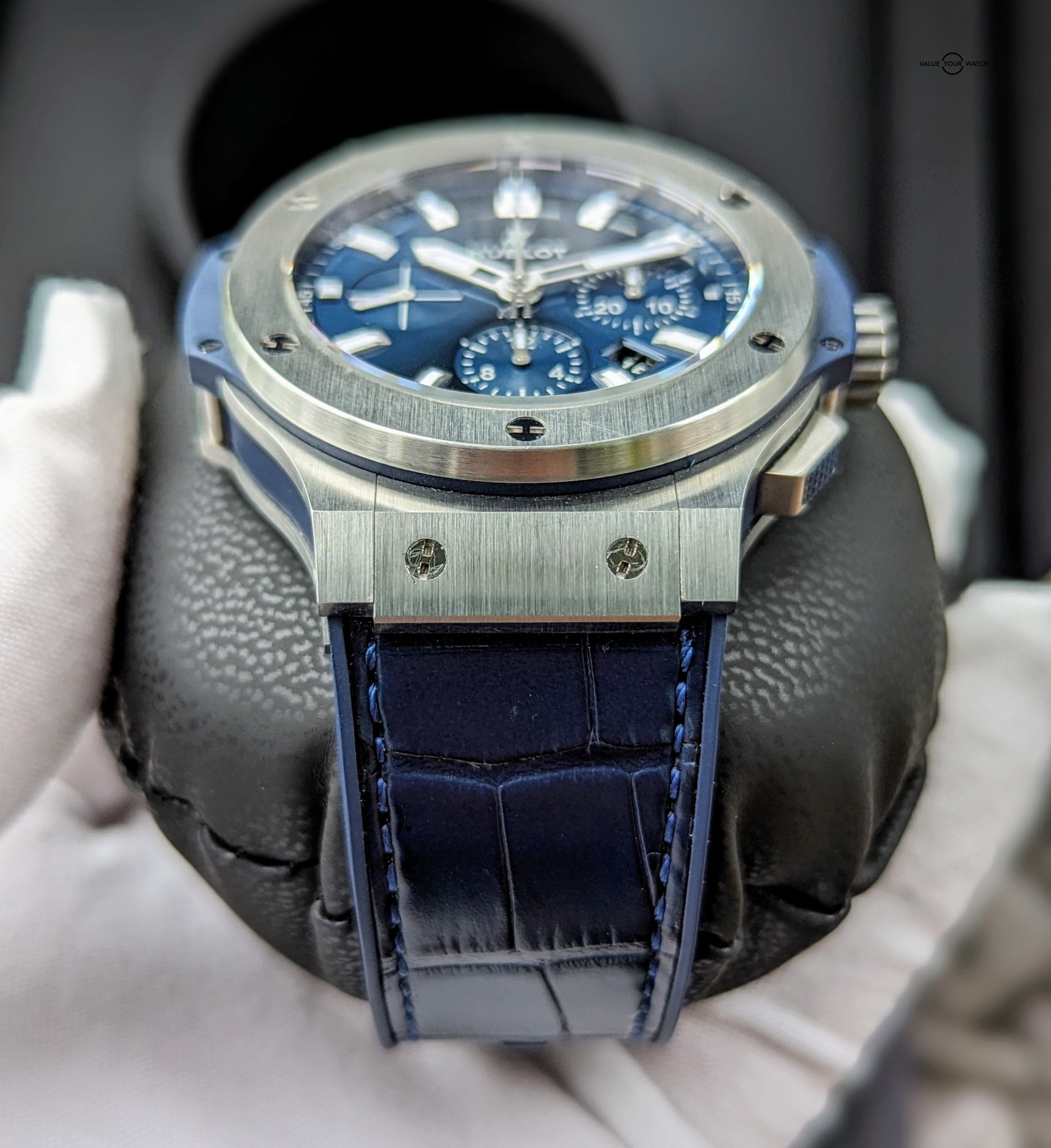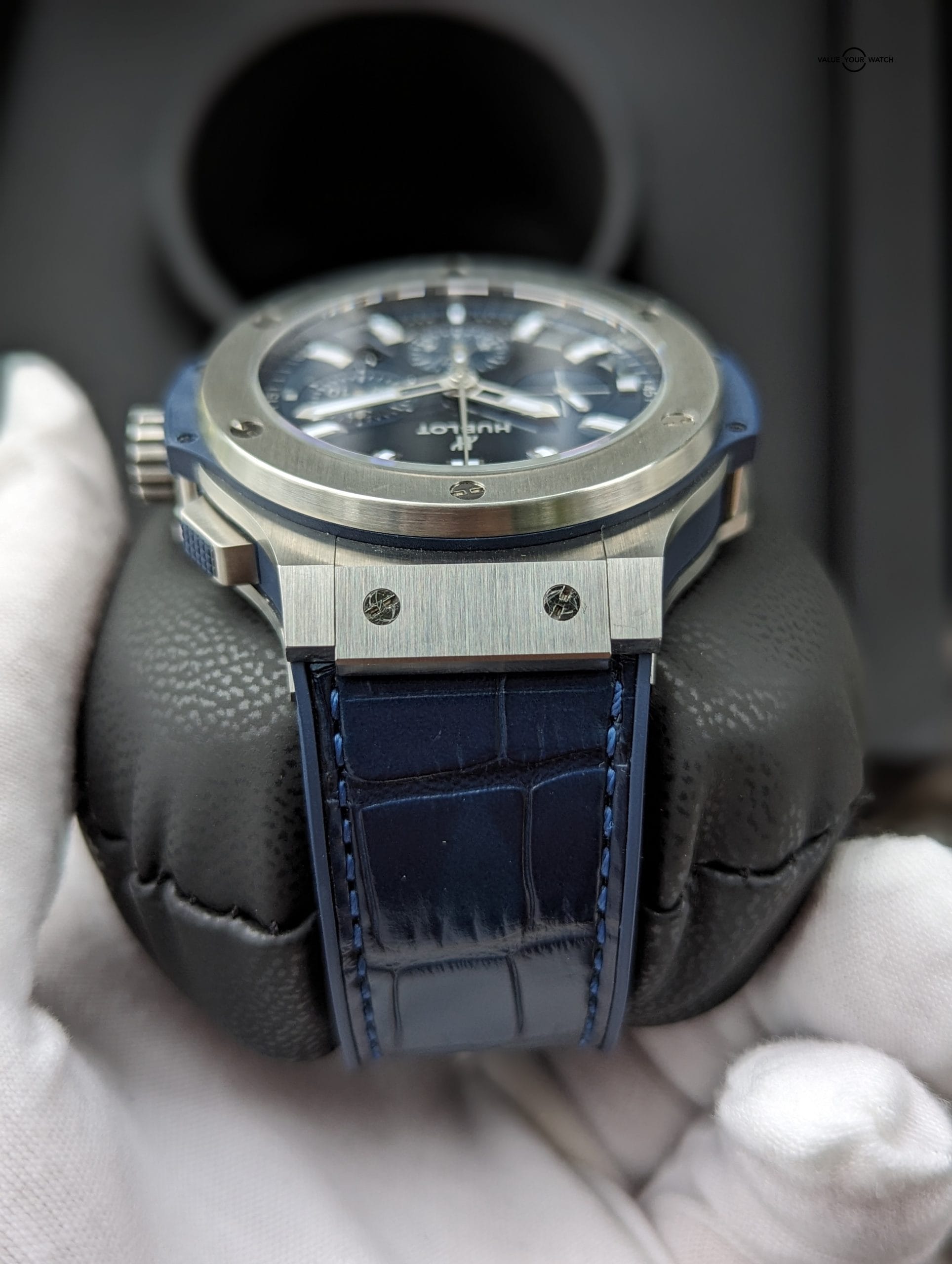 This timepiece comes on a original Hublot blue croc leather strap which is excellent shape, and is lined with blue rubber, making it extremely supple and comfortable. Securing it to your wrist is an original Hublot double push button deployant clasp. Overall the watch is in immaculate condition, only a minor hairline here or there, most notable on the deployant clasp, that is only visible at certain angles. Crystal is free from any blemishes. Functioning as it should, and keeping impeccable time (see timegrapher photo), this watch is good to go for many years.
