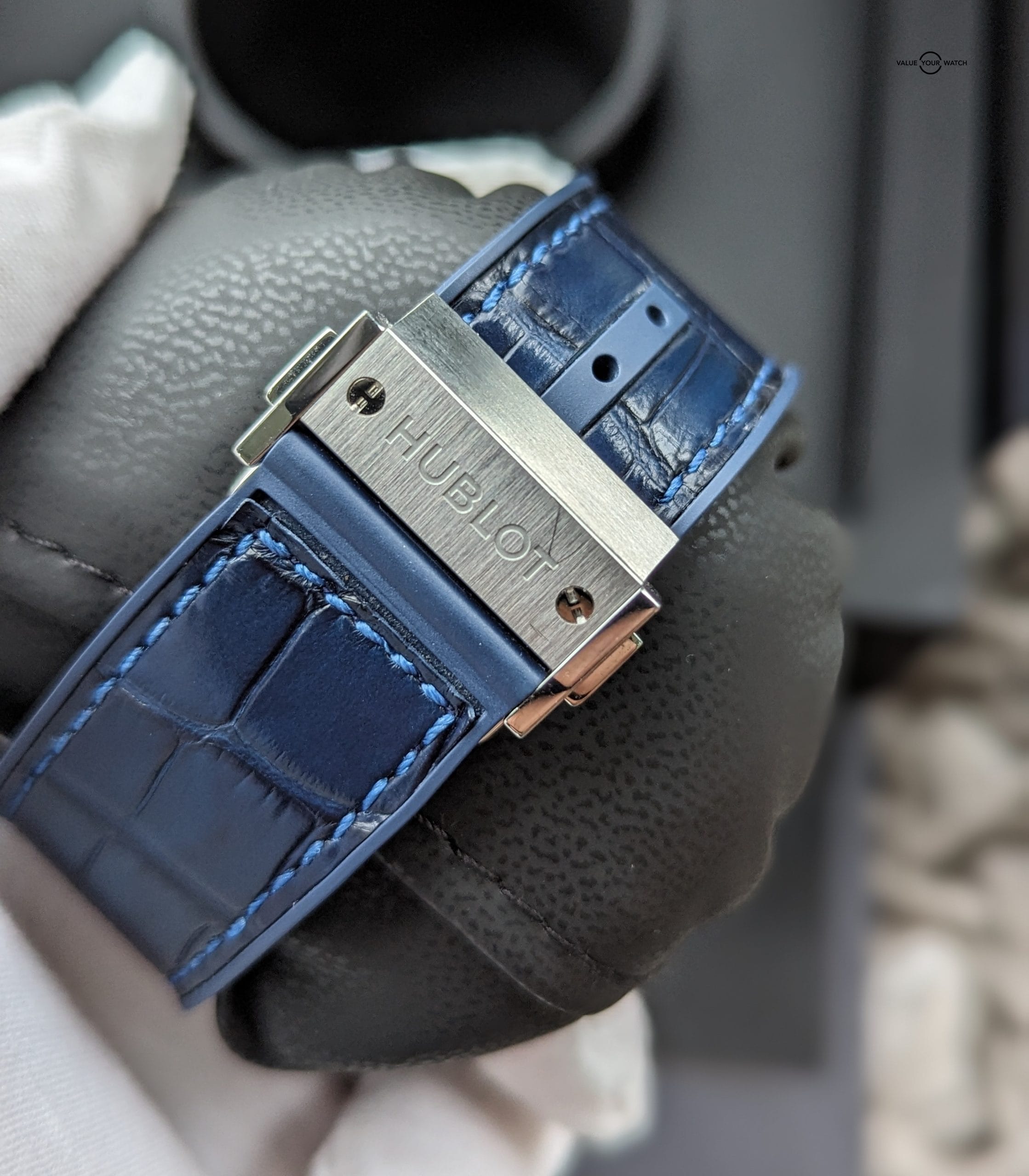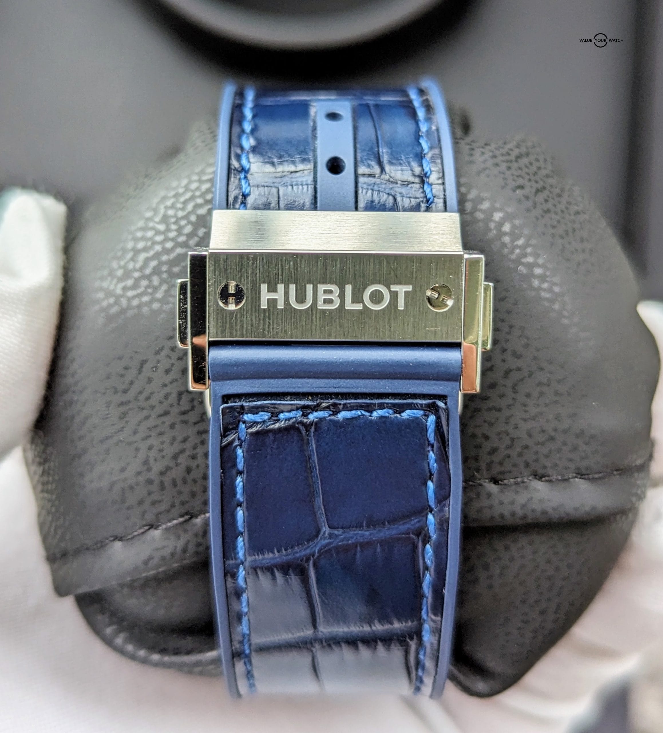 Bracelet: Original Hublot blue croc leather, with blue rubber lining, with Hublot deployant clasp