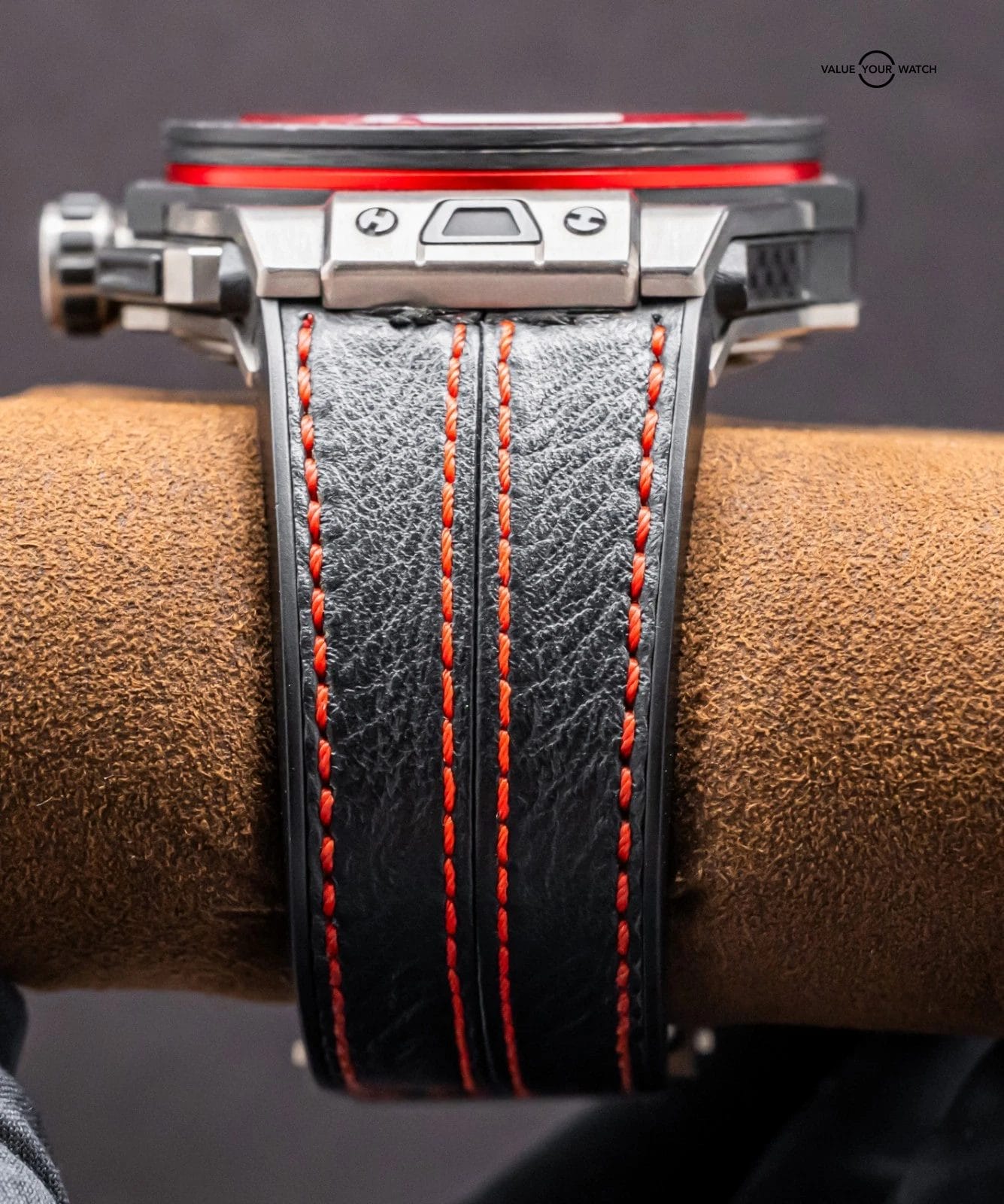 STRIKING Hublot Big Bang Unico Ferrari Titanium & Carbon 45 mm Limited Edition of 1000 with Carbon Bezel & Titanium Case on Black & Red Hublot Strap! Arrives as watch only with a massive $28,600 original MSRP. I wear Hublot’s everyday as they are my go to’s due to their comfort, and this piece is no exception. The skeleton dial, titanium case, red sapphire, and carbon bezel provide a killer contrast; a lot of people also don’t know that Hublot developed this Unico movement entirely in-house, pretty impressive!