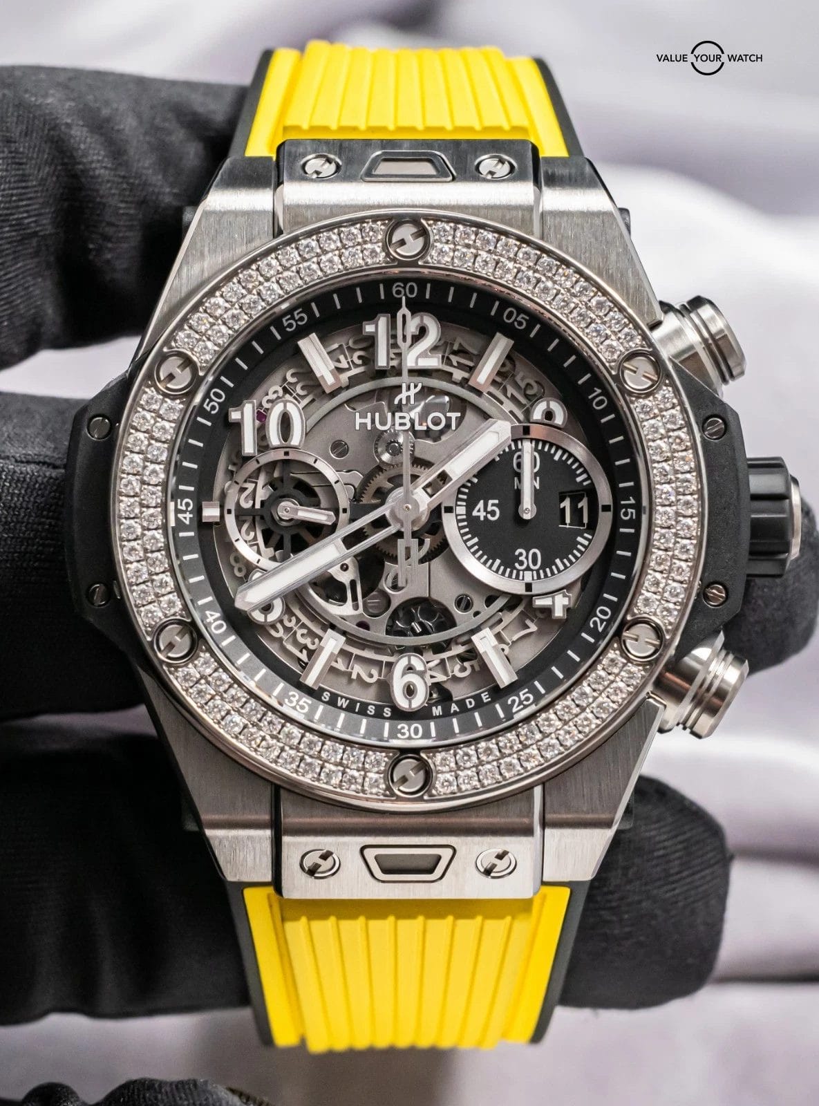 STRIKING Hublot Big Bang Unico Titanium Diamonds 44 mm in Titanium with Skeleton Black Dial & Yellow Hublot Rubber! The 126 Hublot-Set Diamond Bezel looks super cool in person, I love this overall combination on the watch. Arrives as a complete set with the original Hublot boxes and papers consisting of the box and e-Warranty printout from the original purchase at a Hublot Boutique in July 2022. Very comfortable watch on the Rubber Strap, I wear Hublots everyday as they are my go tos due to their comfort; this is a true “everyday” diamond piece that can be worn with swim trunks, shorts, or a suit. The skeleton dial and titanium case provide a killer contrast; a lot of people also don’t know that Hublot developed this Unico movement entirely in-house, pretty impressive!