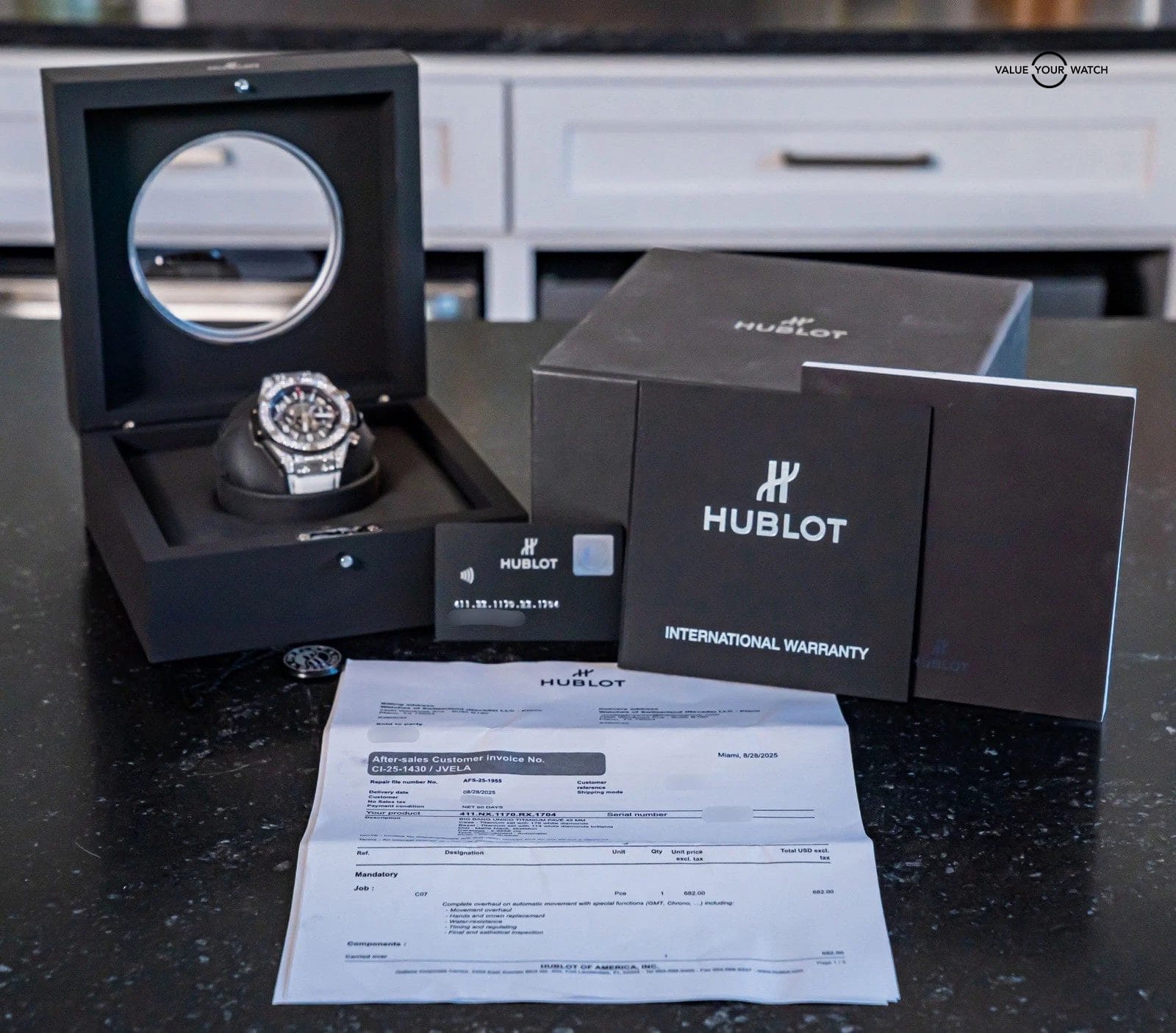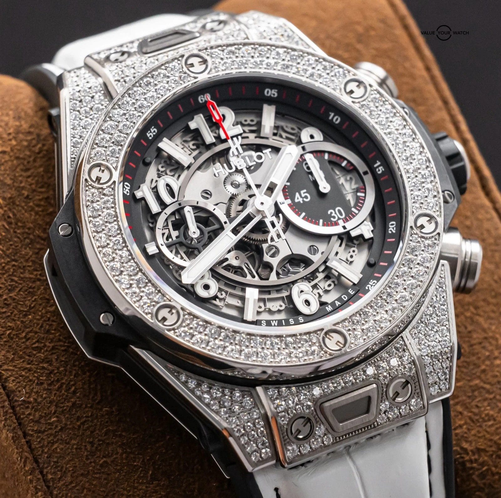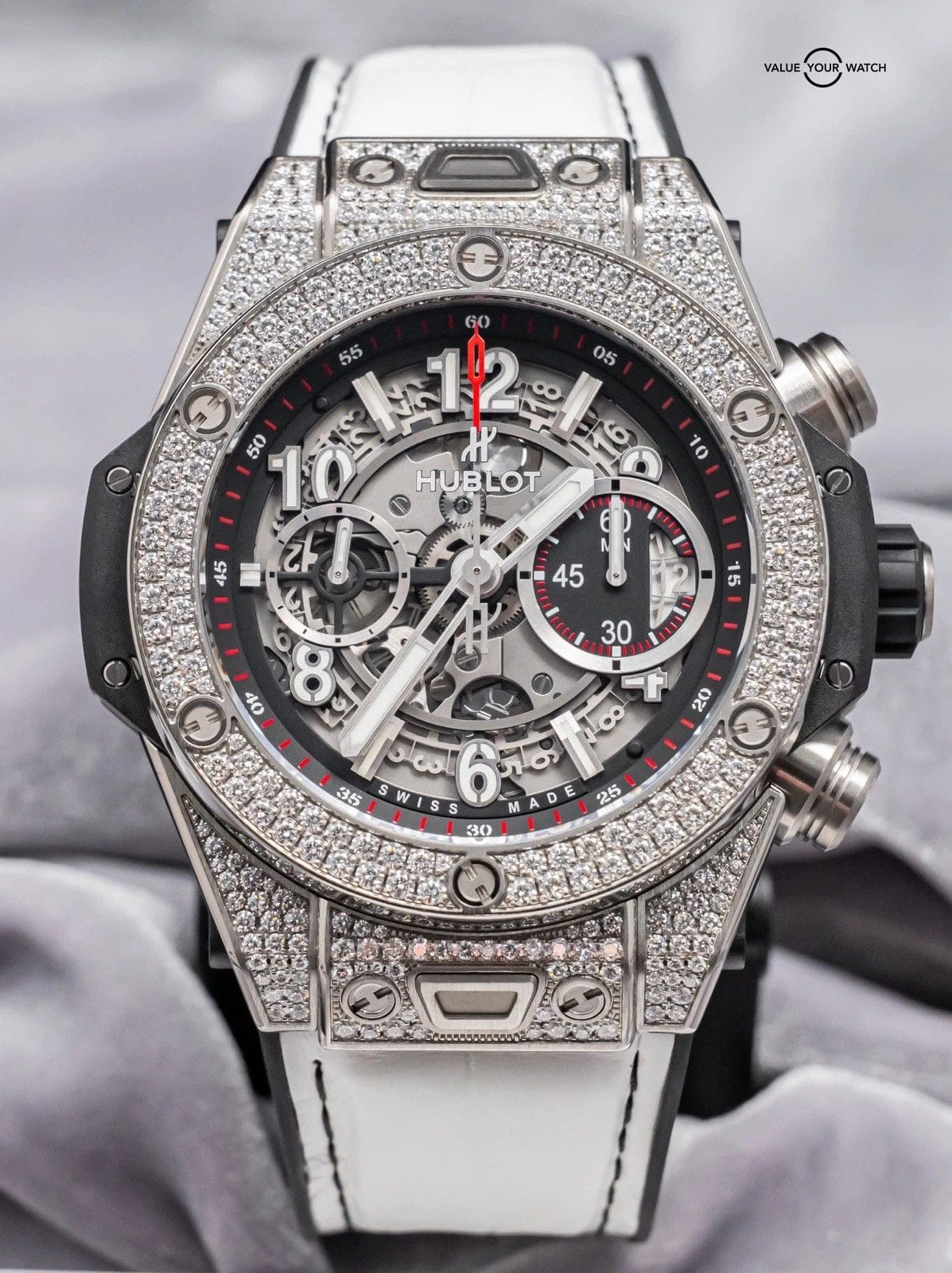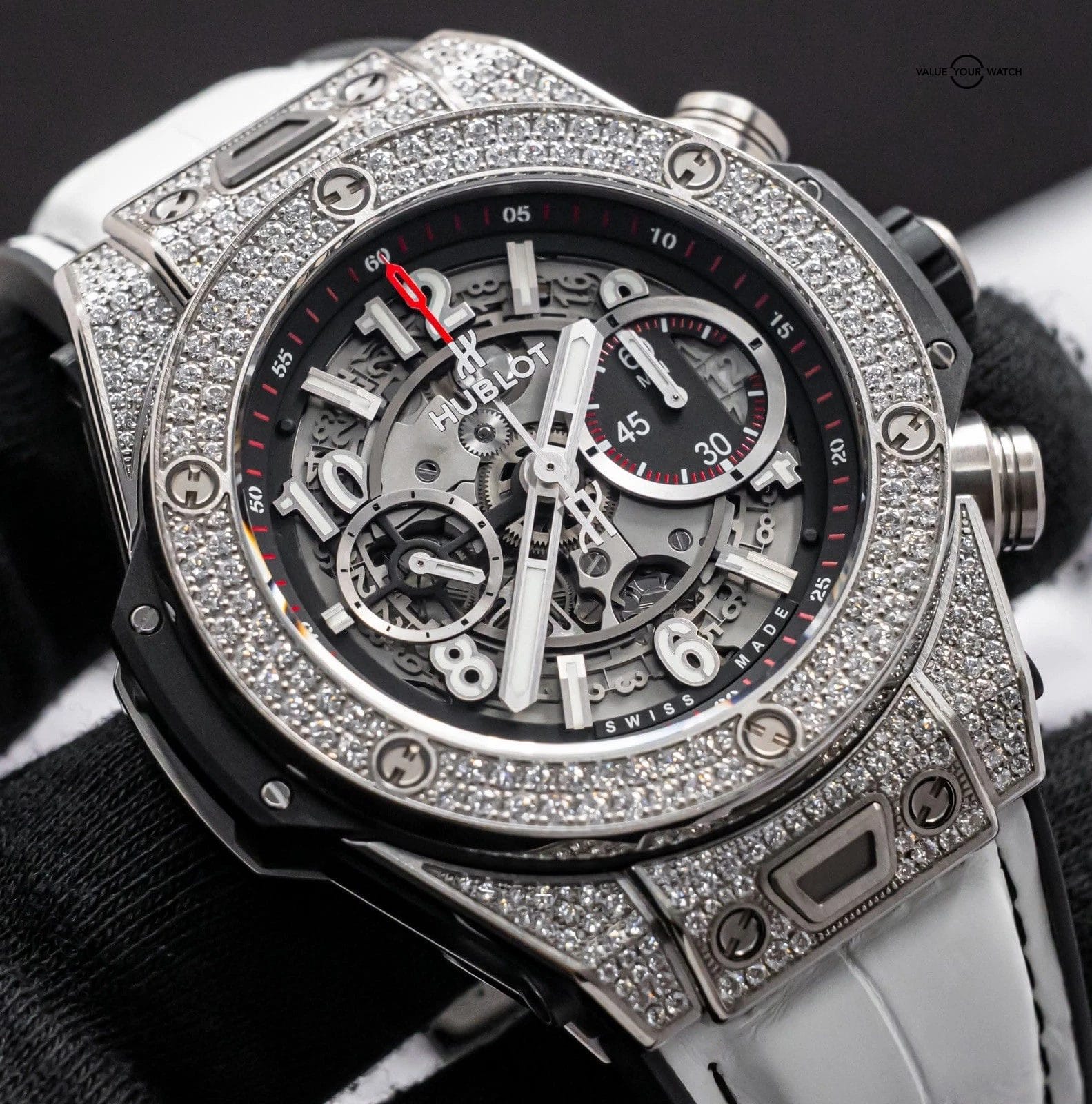 STRIKING Hublot Big Bang Unico Titanium Pave 45 mm with Skeleton Black Dial & BRAND NEW UNWORN White Hublot Alligator Strap! The Factory-Hublot-Pave-Set Diamond Bezel & Case looks insanely cool, and the White Alligator Hublot Strap looks like a match made in heaven- I am truly tempted to wear this personally but of course won’t as the strap is new and we do not wear our inventory once listed. Arrives as a complete set with the original Hublot boxes and papers including the NFC style serialized international warranty card. This piece was FULLY SERVICED at Hublot at a cost of over $1K in August 2025. Have peace of mind, it is WARRANTIED through Hublot until August 2026!