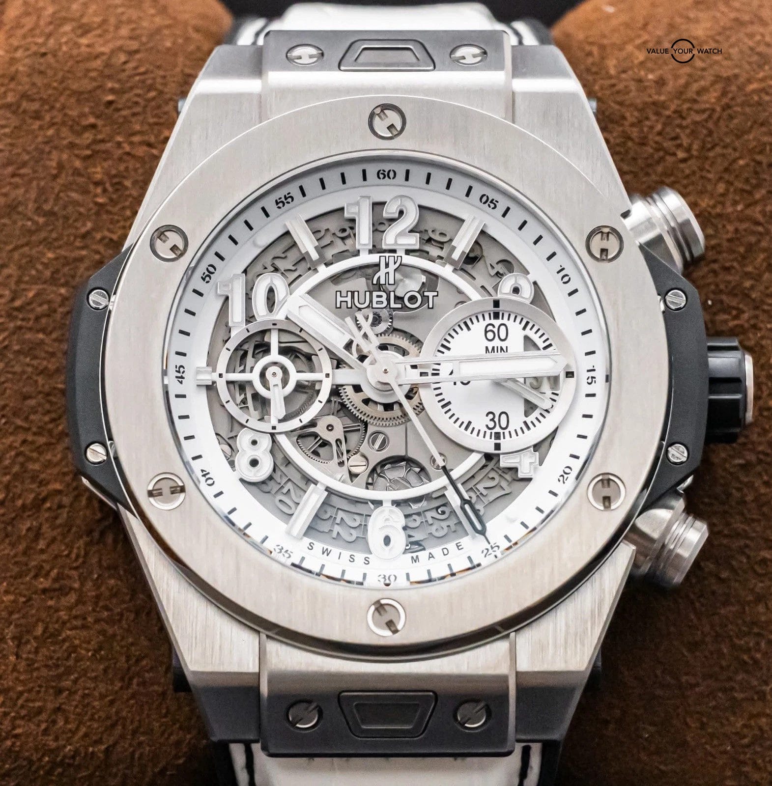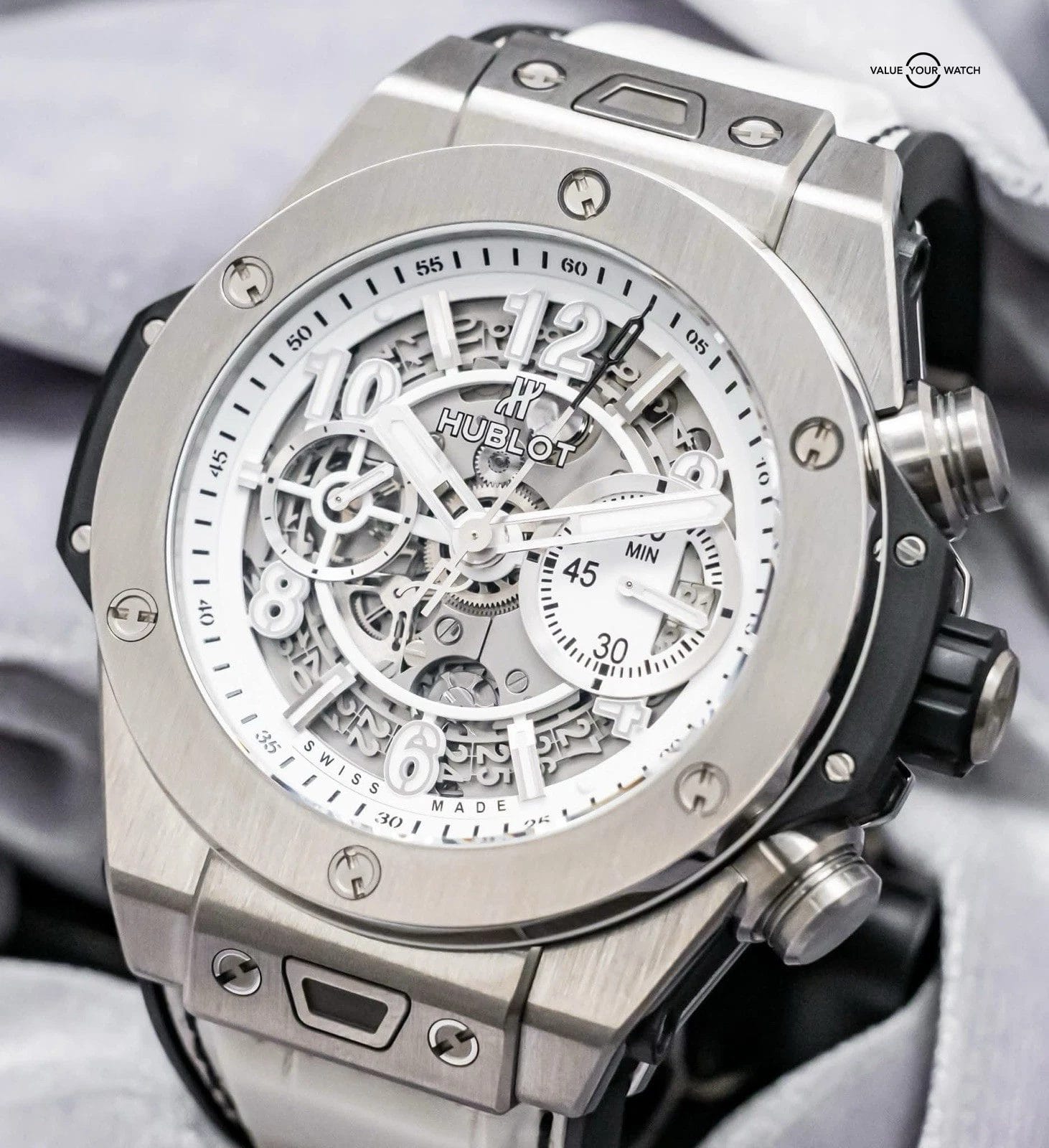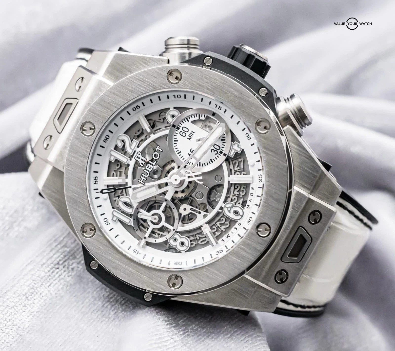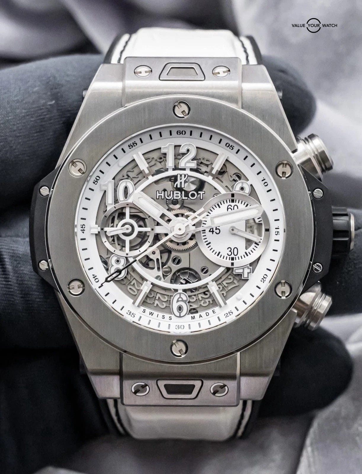 STRIKING Hublot Big Bang Unico Titanium White JSM15 Special Edition 45 mm in Titanium with White Skeleton Dial on BRAND NEW UNWORN White Hublot Alligator Strap! Arrives with the original Hublot box and limited edition certificate. Have peace of mind, this piece was SERVICED at Hublot in Spring 2025 and remains under WARRANTY! Very comfortable watch on the White Alligator Strap being that it’s backed in Rubber, giving you that great look of leather but comfort of a rubber strap. I wear Hublots everyday as they are my go tos due to their comfort. The skeleton dial and titanium case provide a killer contrast!