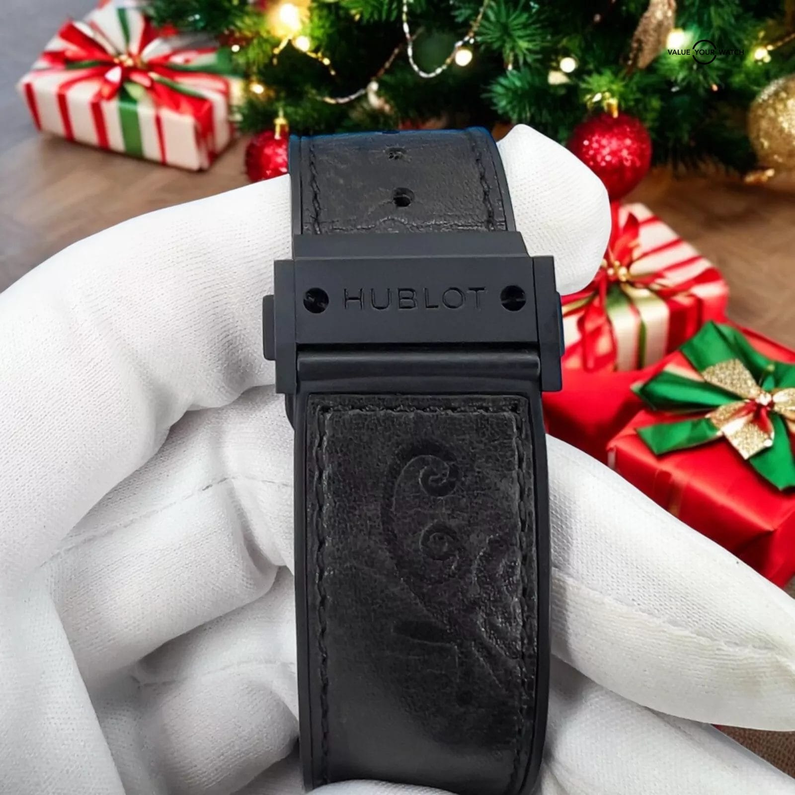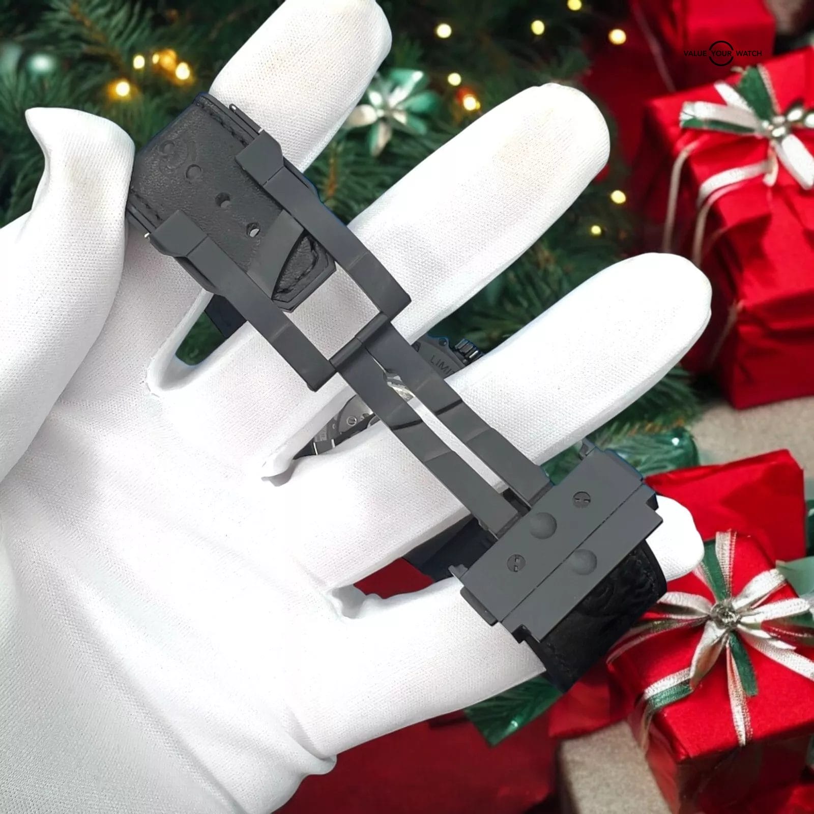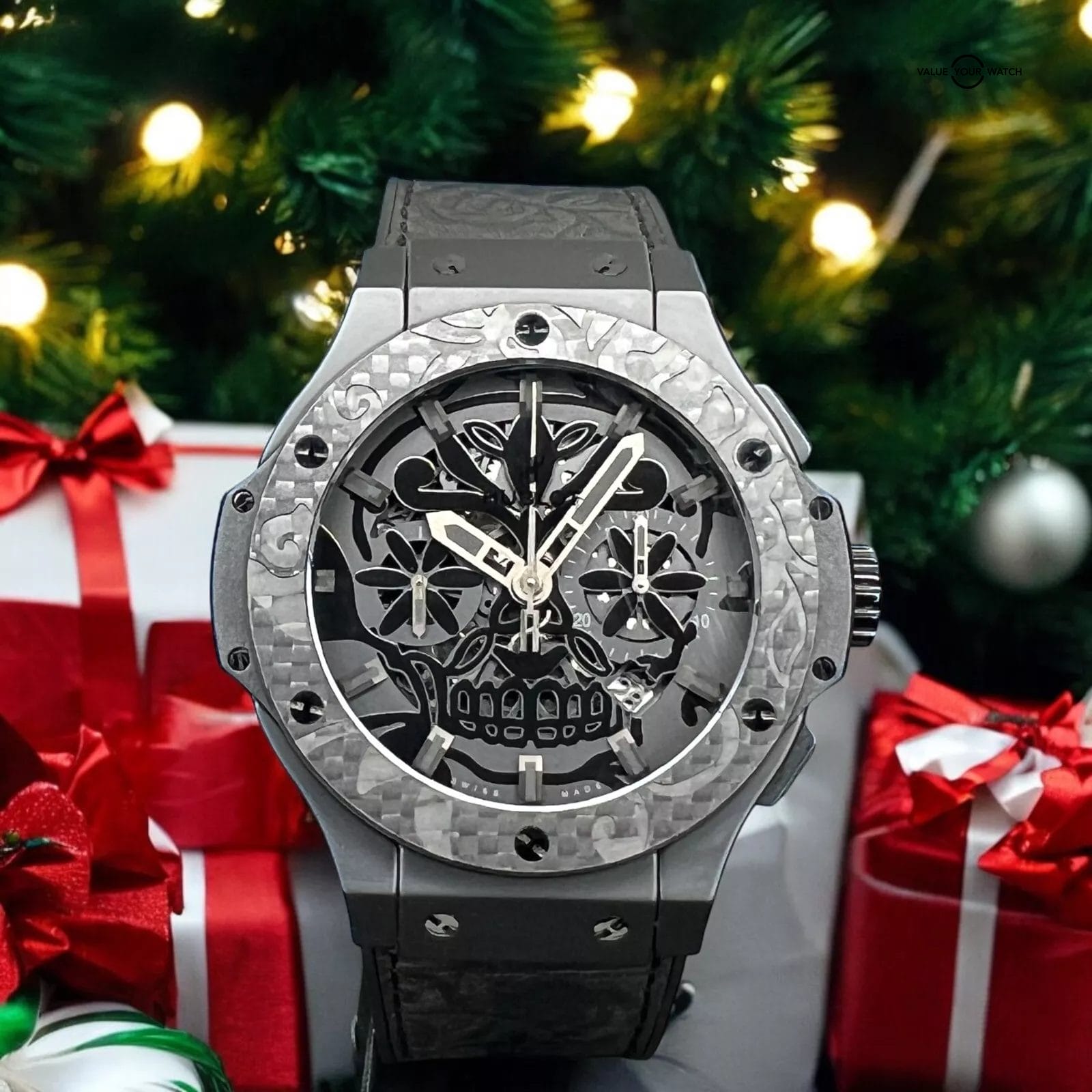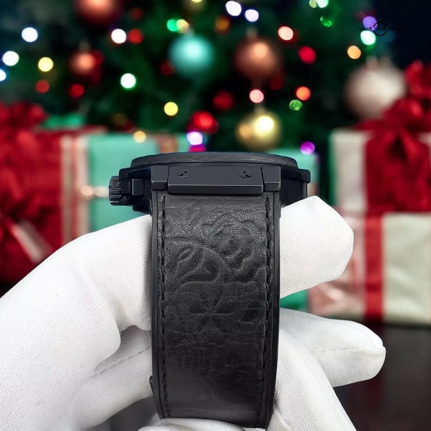 The Hublot Big Bang Aero Bang Sugar Skull 311.CQ.1110.VR.FDK15 is a limited edition of only 200 pieces made worldwide. This unique timepiece made with a micro blasted ceramic case and carbon fiber bezel will certainly be one to catch people’s attention. Look closely at the dial with over 250 hand placed components and soon you will see the unique skeleton/skull outline suddenly appear. Its skeleton dial, bezel, and leather strap are all engraved with a unique design only found on the Hublot Sugar Skull model.