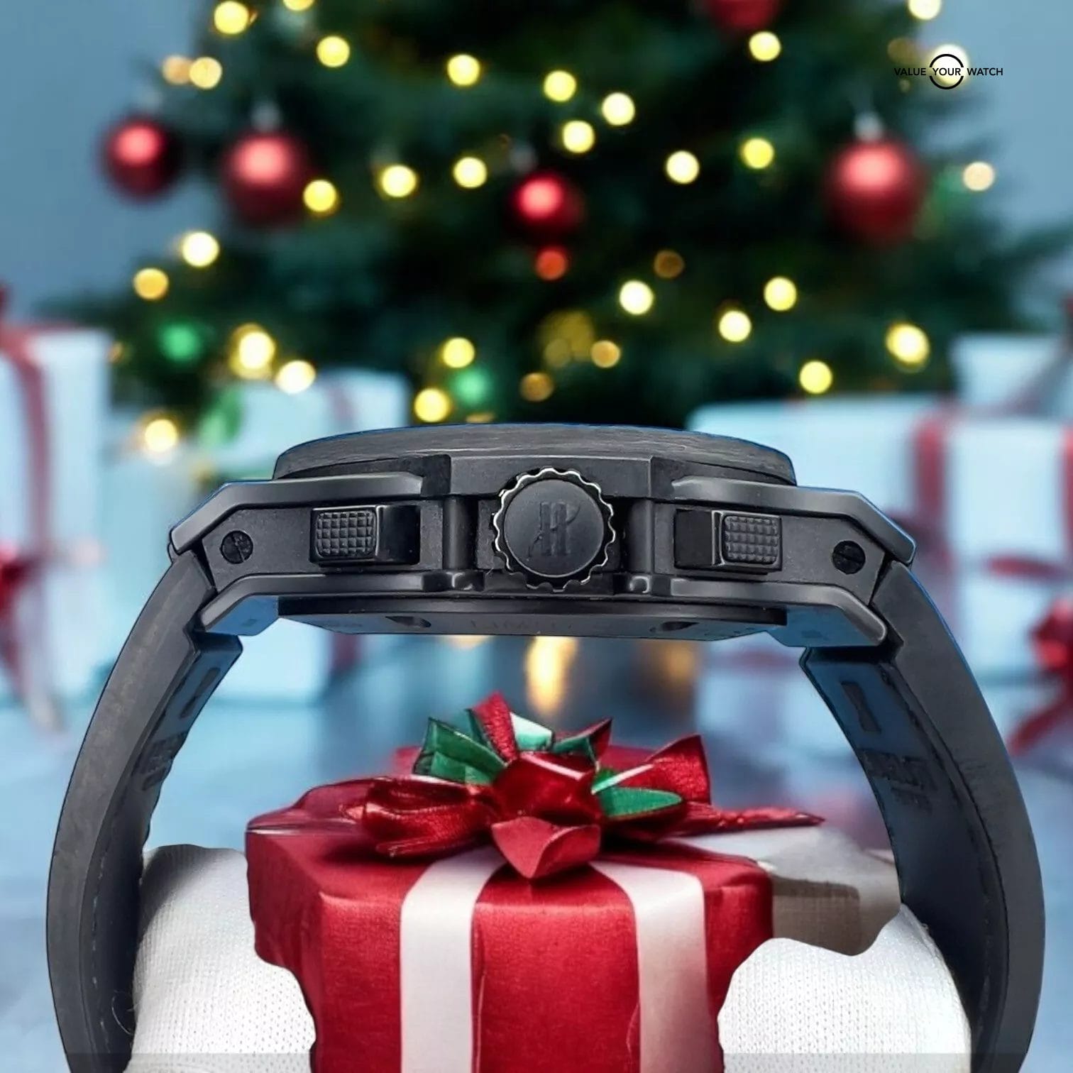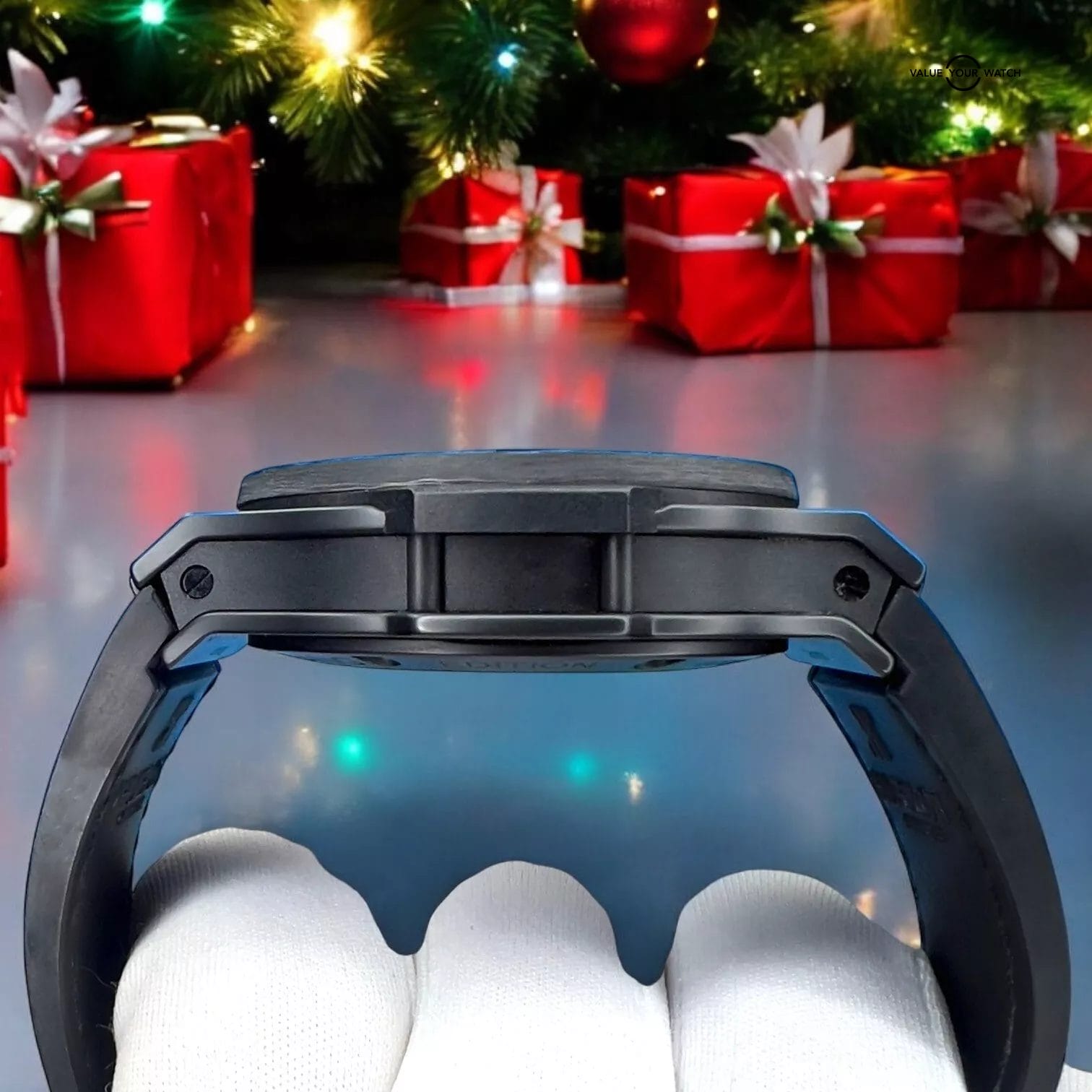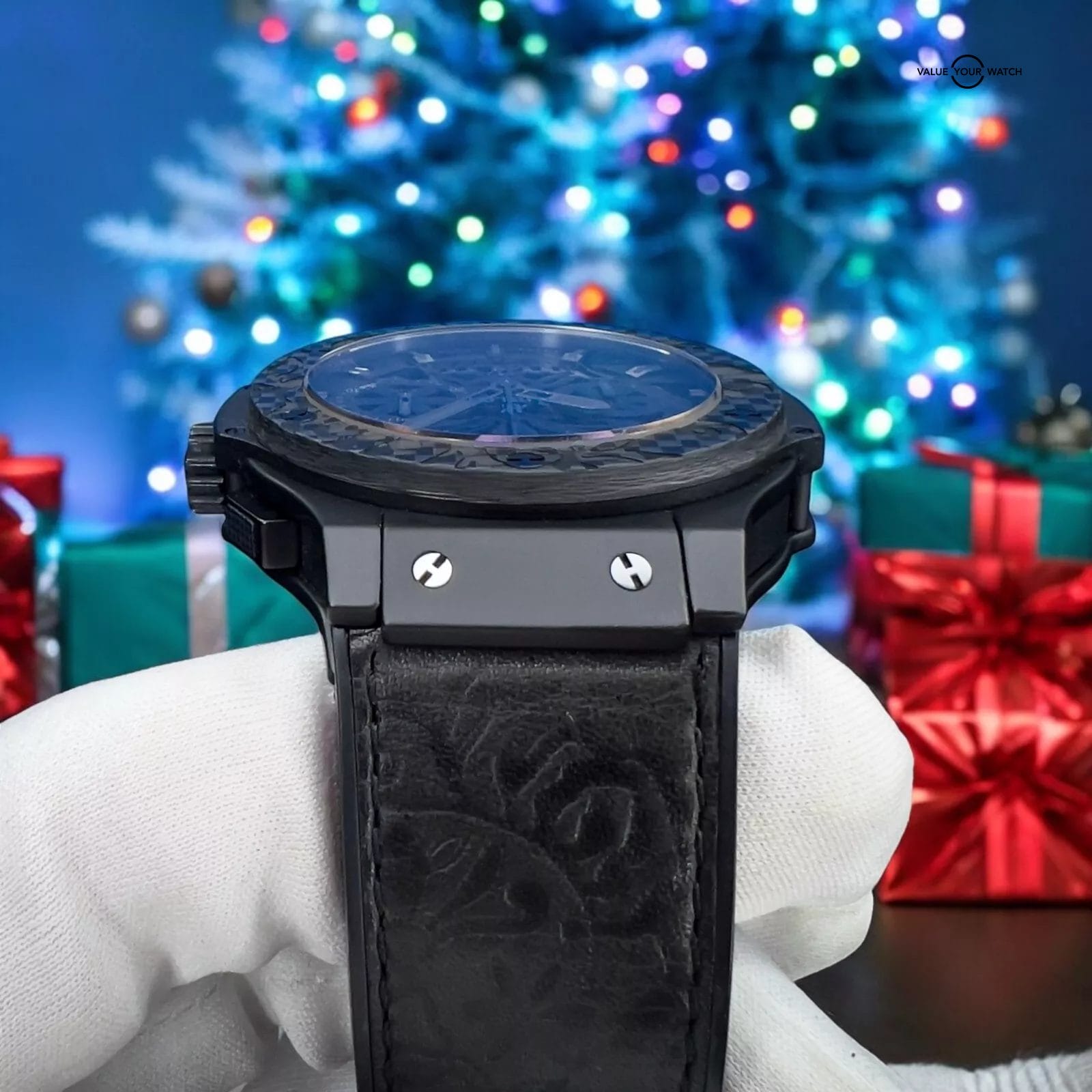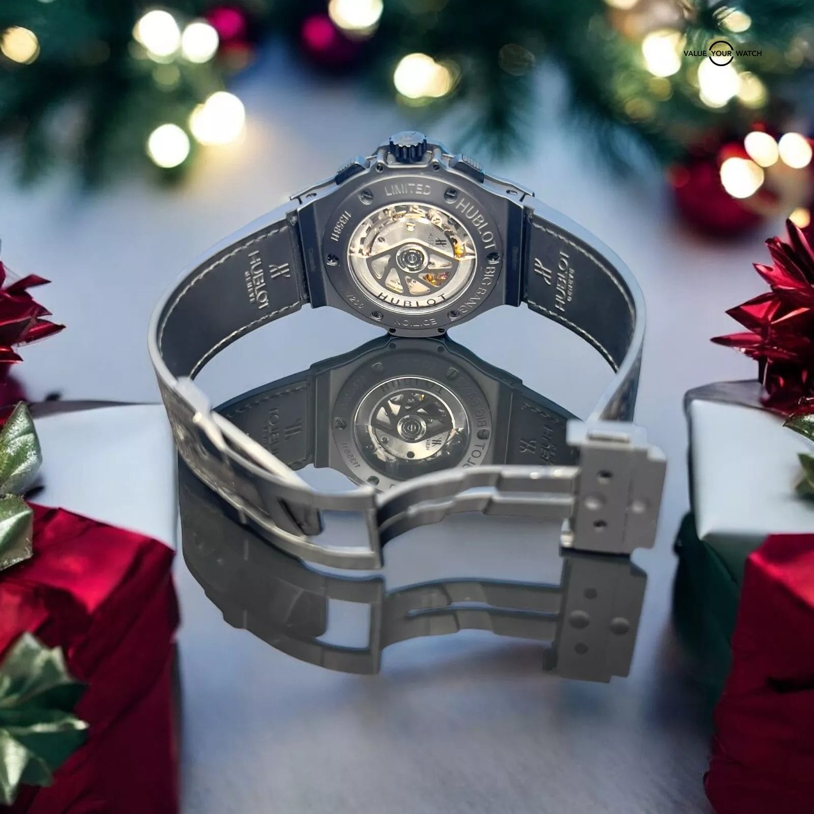 The Hublot Big Bang Aero Bang Sugar Skull 311.CQ.1110.VR.FDK15 is a limited edition of only 200 pieces made worldwide. This unique timepiece made with a micro blasted ceramic case and carbon fiber bezel will certainly be one to catch people’s attention. Look closely at the dial with over 250 hand placed components and soon you will see the unique skeleton/skull outline suddenly appear. Its skeleton dial, bezel, and leather strap are all engraved with a unique design only found on the Hublot Sugar Skull model.