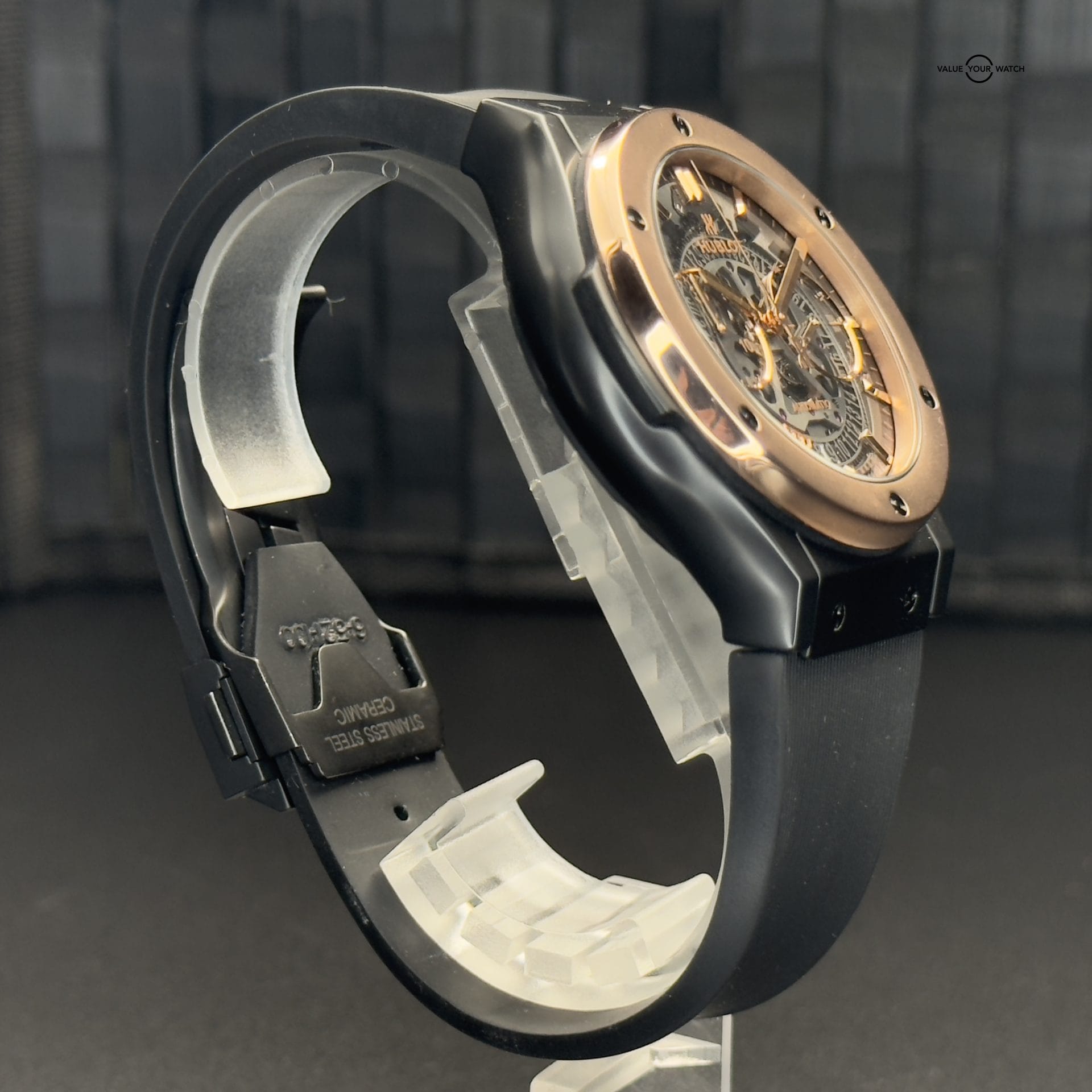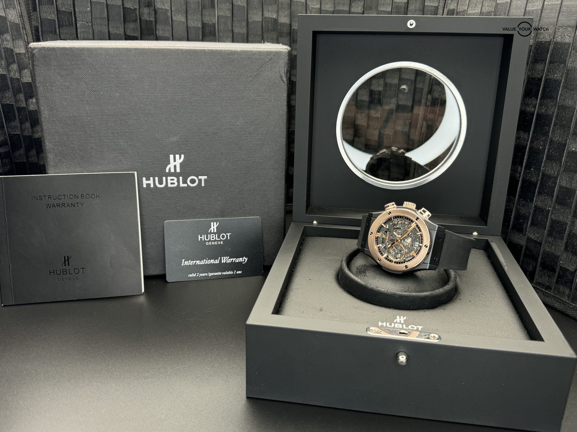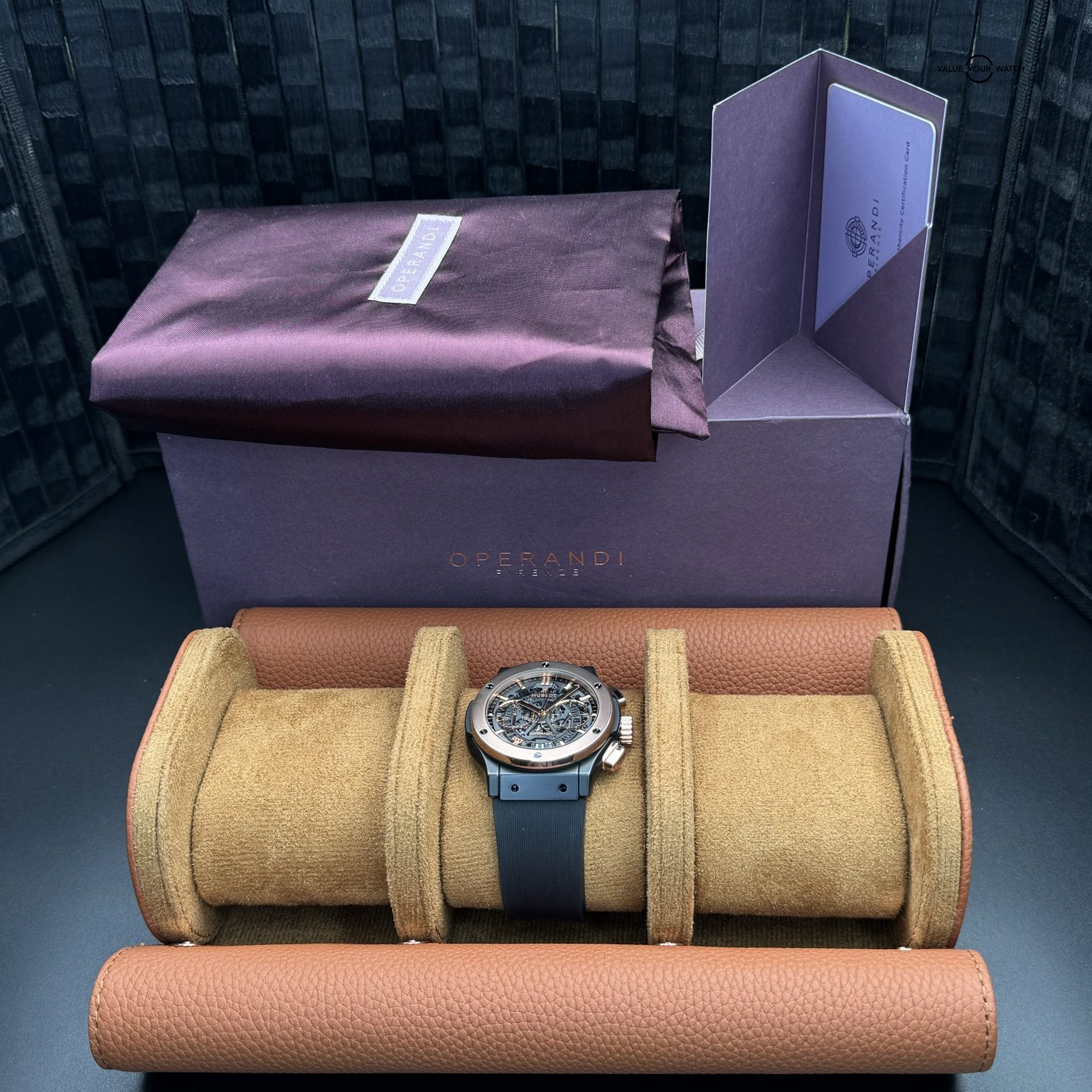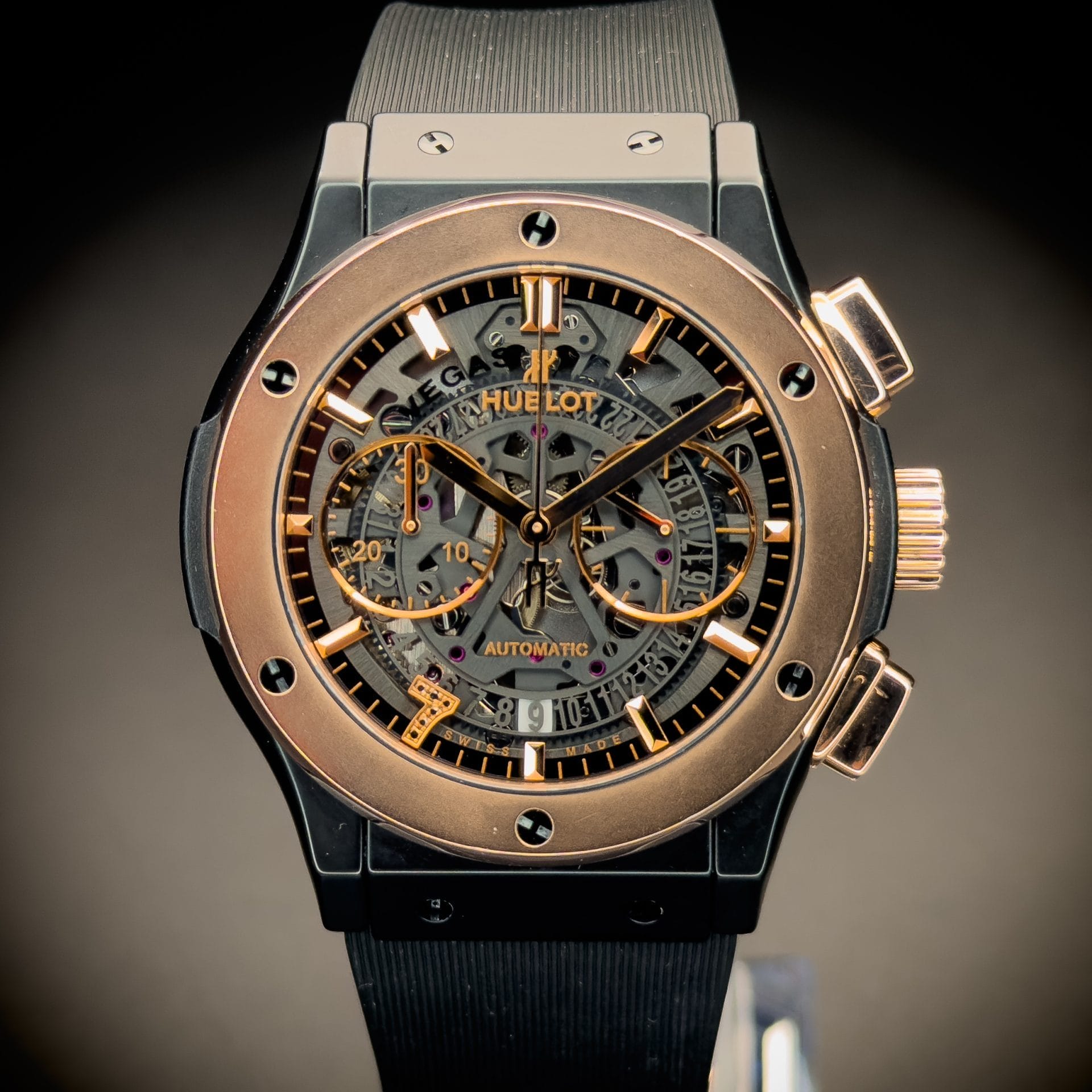 This Hublot Classic Aerofusion Las Vegas Special Edition is in great condition. There were only 21 of these ever made. The case is black ceramic which makes it very resistant to scratches. It has a rose gold bezel and is highlighted with a ton of rose gold accents throughout. It is mounted on a Hublot black rubber sport strap with ceramic clasp. The lucky gold 7 with black diamonds is a great addition to this wonderful skeleton dial. The exhibition case back allows for viewing of the movement underneath the iconic “Welcome to Fabulous Las Vegas” logo. Both front and back glass are clear and the case and clasp are in fantastic shape. The bezel shows some small signs of wear. This piece comes with warranty booklet, open warranty card, inner and outer boxes. The outer cardboard box shows some wear and the pillow of the inner box has some flaking so I am also including a new/unused Operandi watch roll that comes with its own silk bag, box, and authenticity card. Please feel free to reach with any questions or for more pictures.