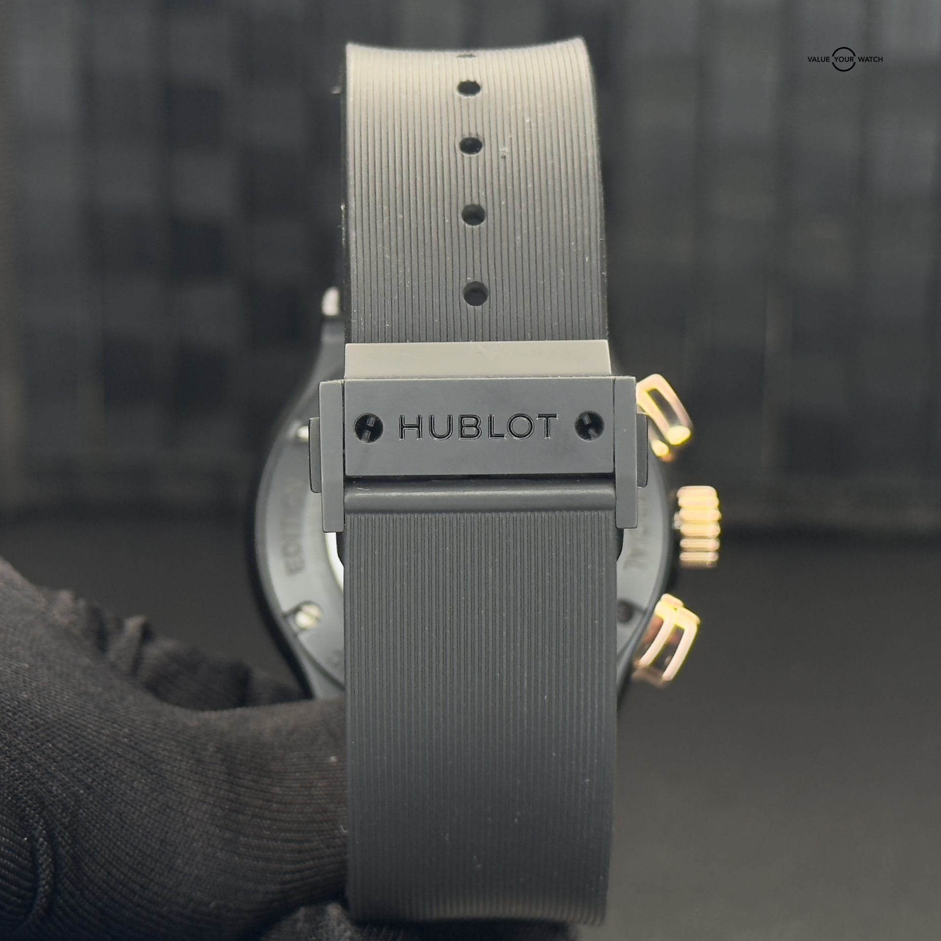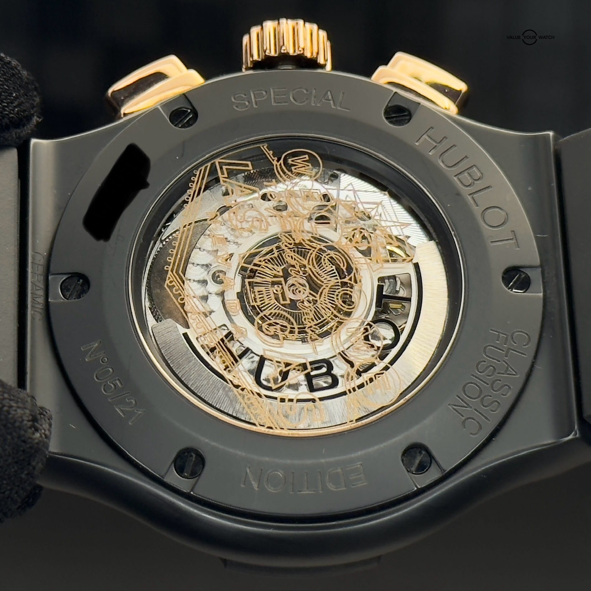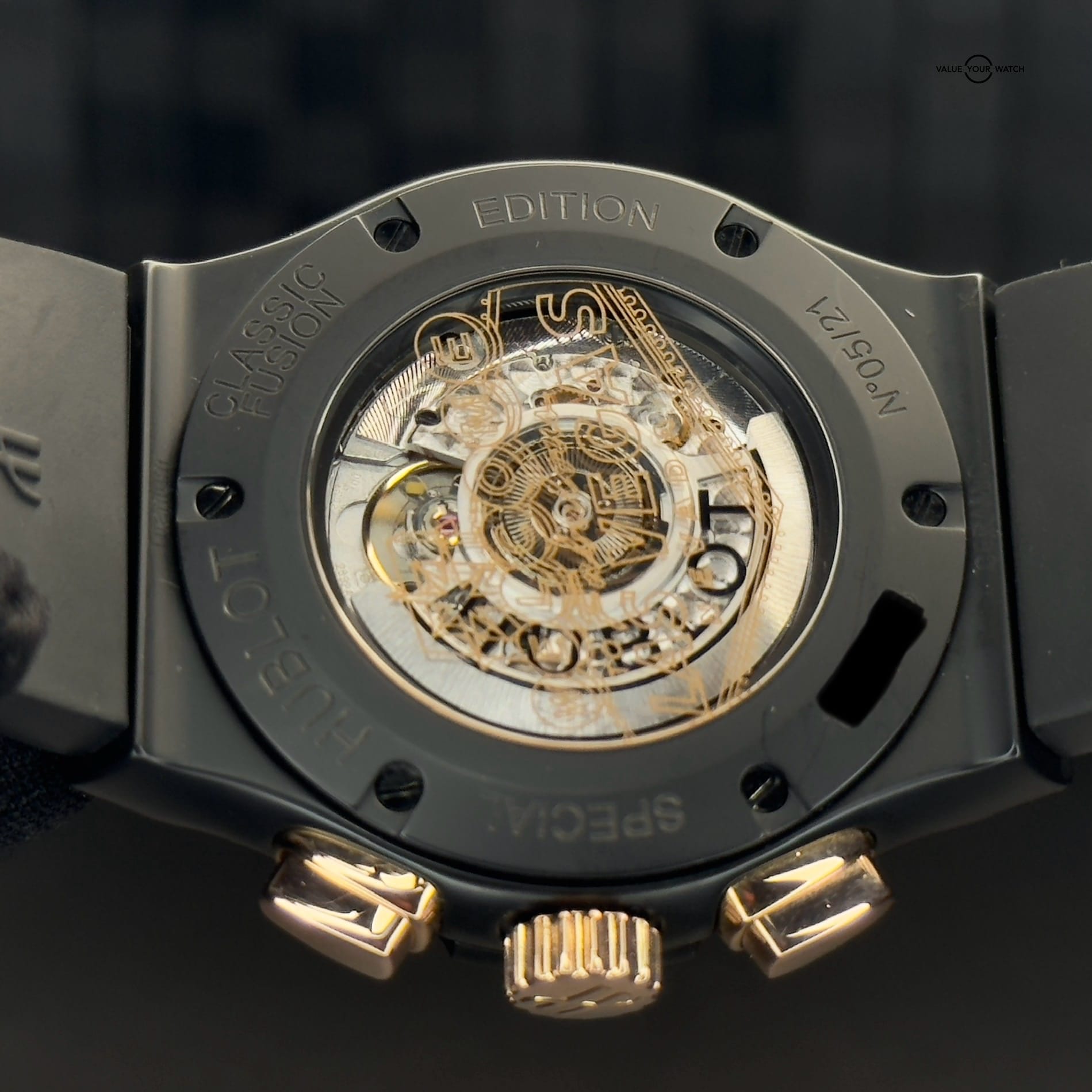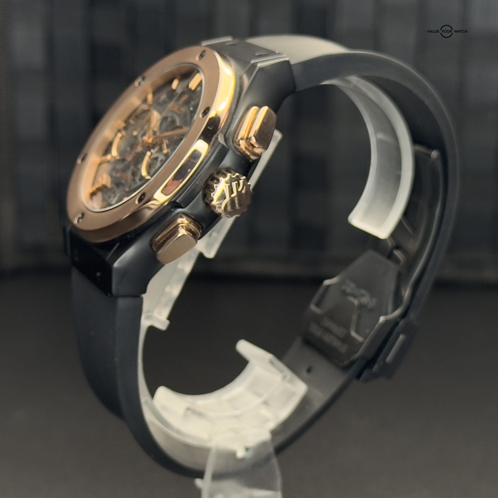 This Hublot Classic Aerofusion Las Vegas Special Edition is in great condition. There were only 21 of these ever made. The case is black ceramic which makes it very resistant to scratches. It has a rose gold bezel and is highlighted with a ton of rose gold accents throughout. It is mounted on a Hublot black rubber sport strap with ceramic clasp. The lucky gold 7 with black diamonds is a great addition to this wonderful skeleton dial. The exhibition case back allows for viewing of the movement underneath the iconic “Welcome to Fabulous Las Vegas” logo. Both front and back glass are clear and the case and clasp are in fantastic shape. The bezel shows some small signs of wear. This piece comes with warranty booklet, open warranty card, inner and outer boxes. The outer cardboard box shows some wear and the pillow of the inner box has some flaking so I am also including a new/unused Operandi watch roll that comes with its own silk bag, box, and authenticity card. Please feel free to reach with any questions or for more pictures.