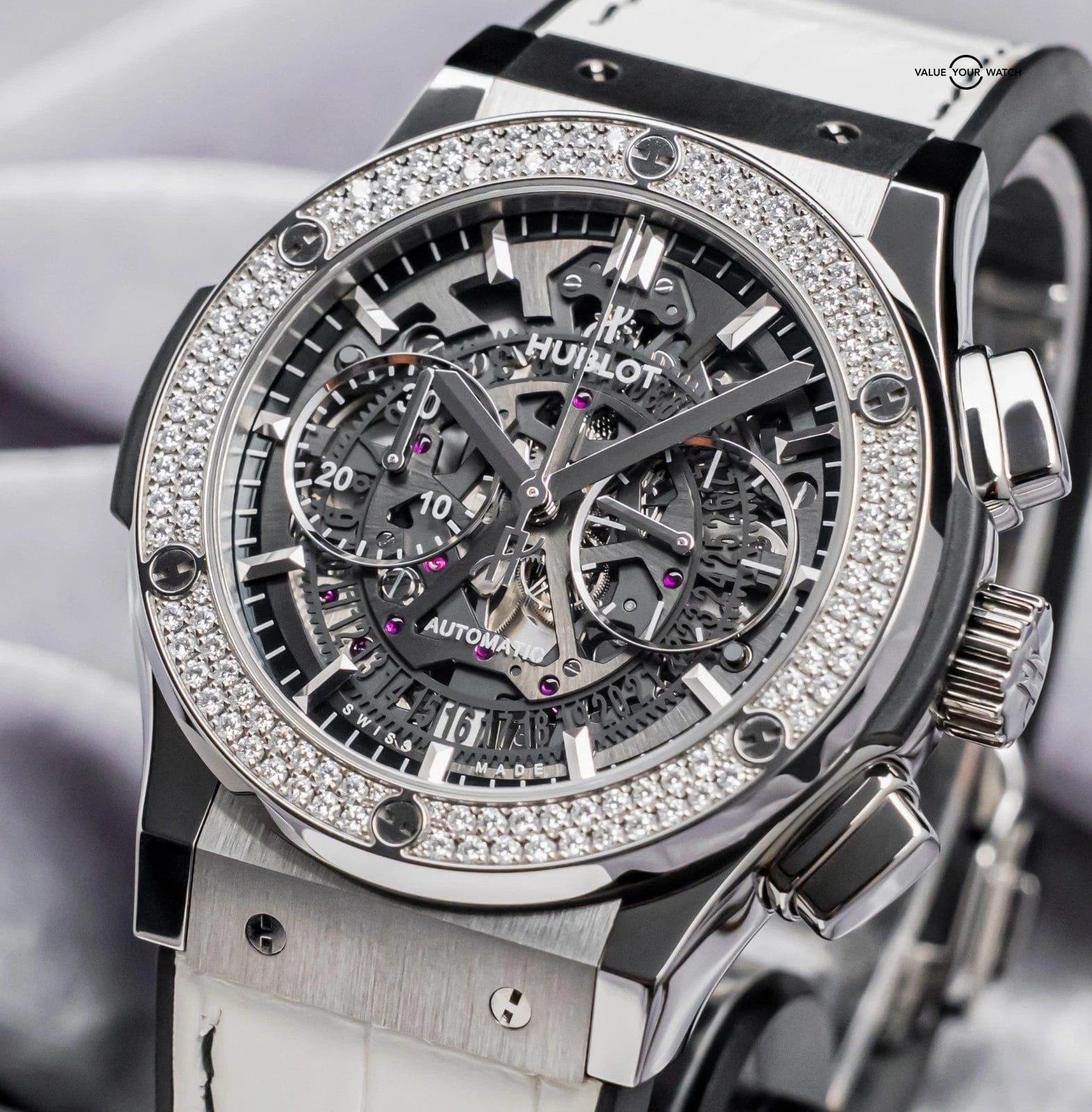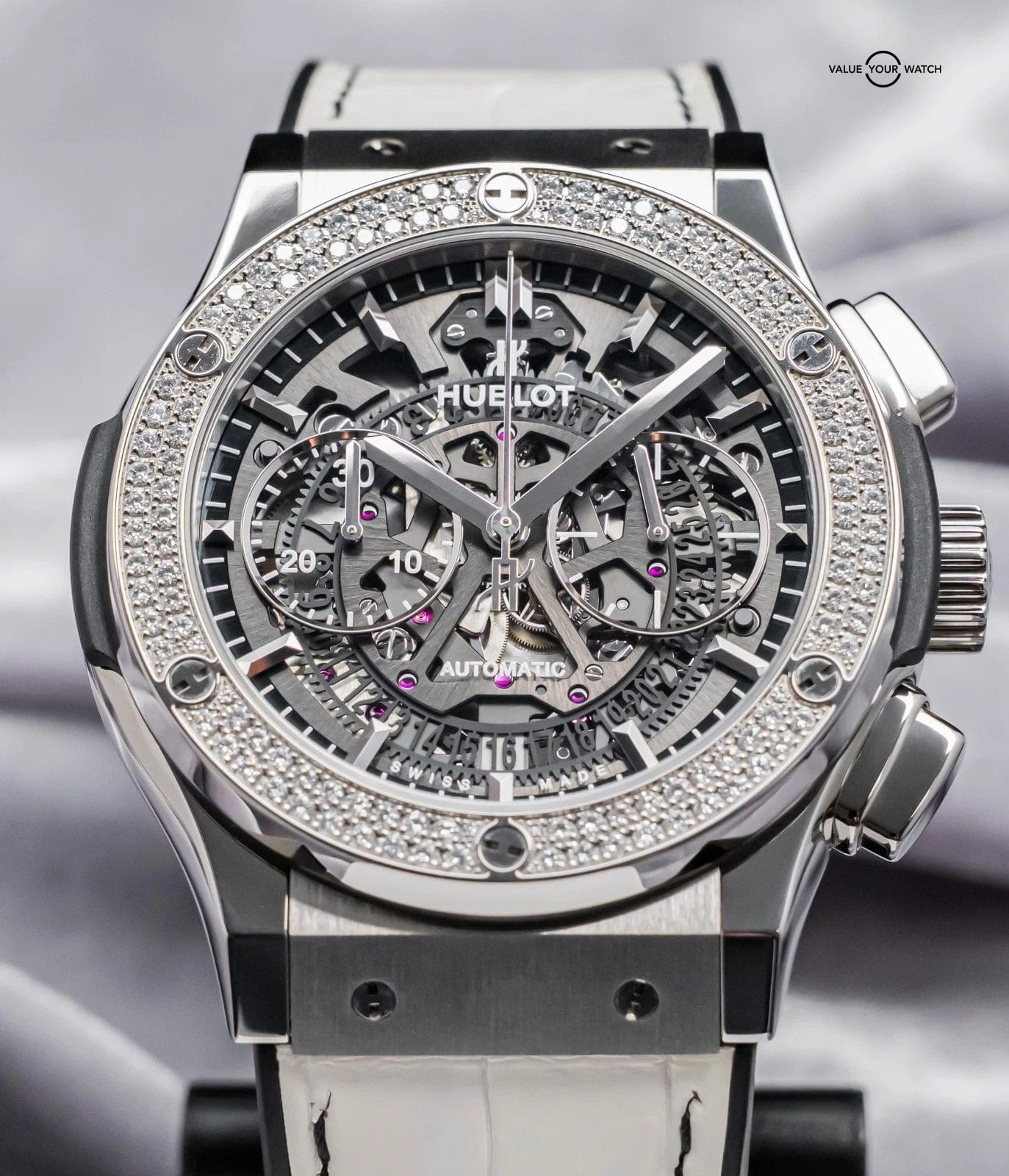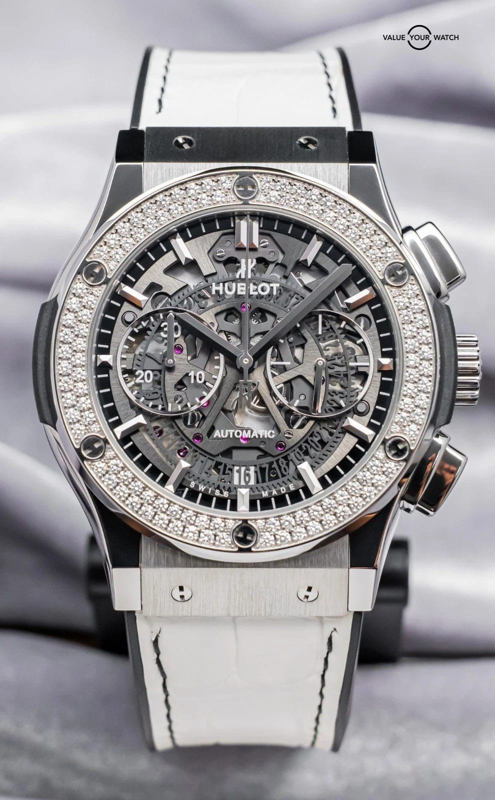 STUNNING Hublot Classic Fusion Aerofusion Chronograph 45 mm with FACTORY 126 Diamond Set Bezel, Titanium Case, and Skeleton Dial on White Hublot Alligator Strap! Arrives as a complete set with original Hublot boxes and papers including the international warranty card. This piece was SERVICED at Hublot in February 2026, and it’s under WARRANTY through February 2027, a huge value-add. With the rubber backing of the strap, it’s incredibly comfortable to wear daily given you get the awesome look of leather but the comfort of rubber- this is the same reason an Aerofusion has found its way in my permanent personal collection. Originally purchased from a Hublot Authorized Dealer in March 2020 and is ready to be on wrist!