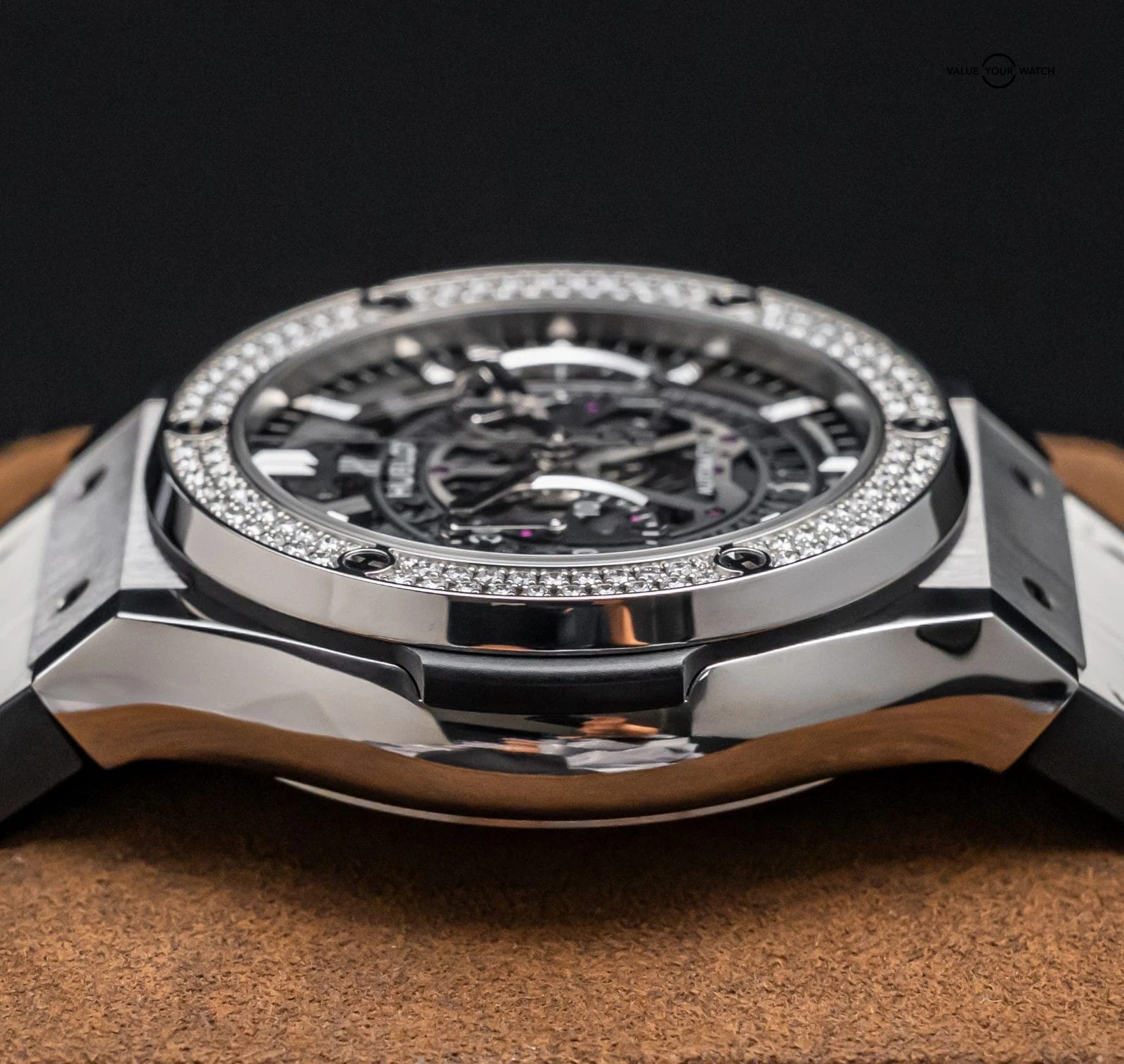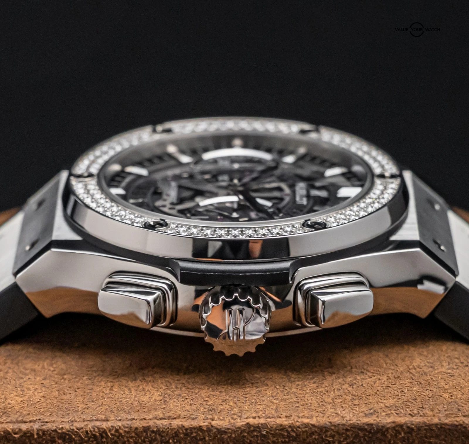 The watch is in great condition with only very minor wear, nothing notable. Keeping good time on my timegrapher when tested! Please excuse the lint/dust in the pictures from the photography process. The Hublot box does have typical Hublot box wear, due to the materials originally used in their production. Super STRIKING with the rare FACTORY Diamond Bezel!