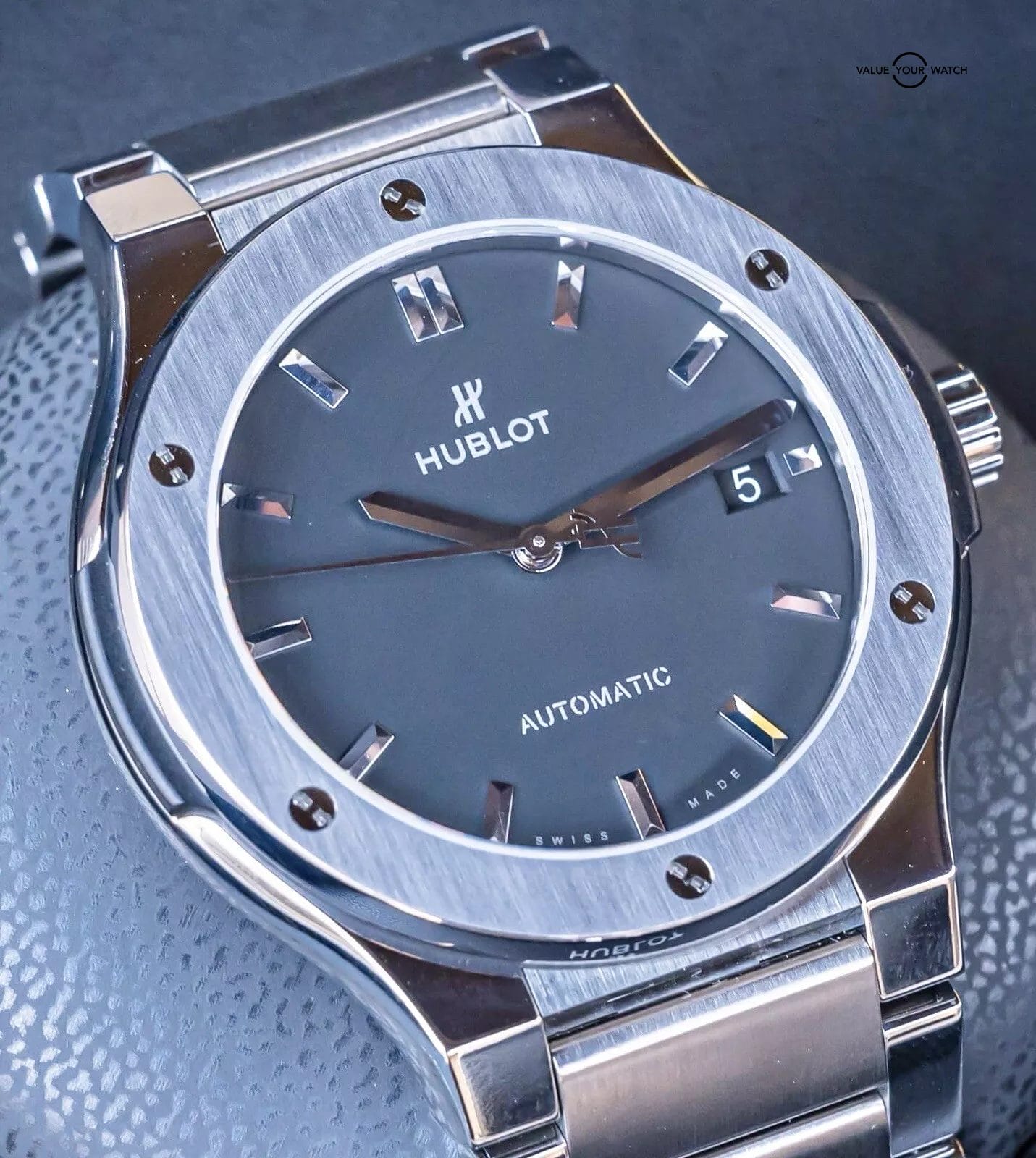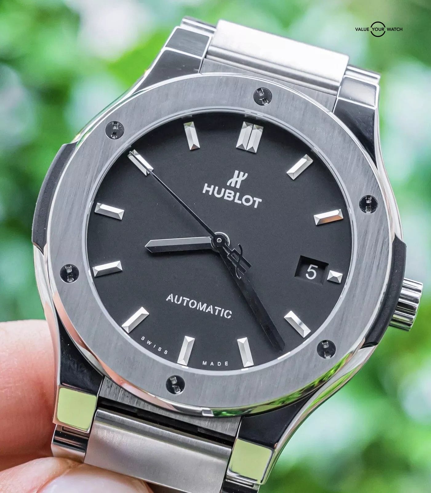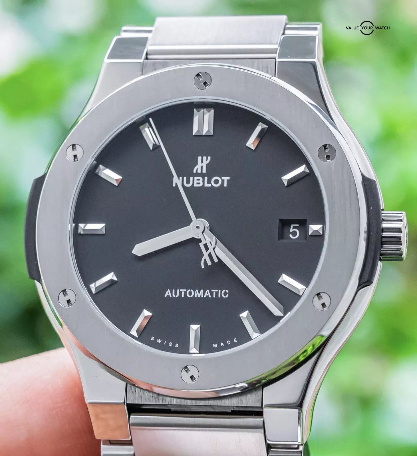 STUNNING Hublot Classic Fusion 45 mm Titanium with Black Dial on Rare Integrated Titanium Bracelet! Arrives with original Hublot boxes and papers including the NFC style warranty card. Do not confuse this NFC style card for the older write-in style cards, the NFC card is unreplicatable as it’s embossed with the serial from the factory, a huge value-add. Originally purchased from Hublot Authorized Dealer in March 2022. Have peace of mind, it is WARRANTIED through Hublot until September 2024! Striking piece and a significant bang for your buck, the watch’s mix of brushed and polished titanium finishes make the watch look phenomenal and comparable to $20K watches in my opinion. Ready to be on wrist!