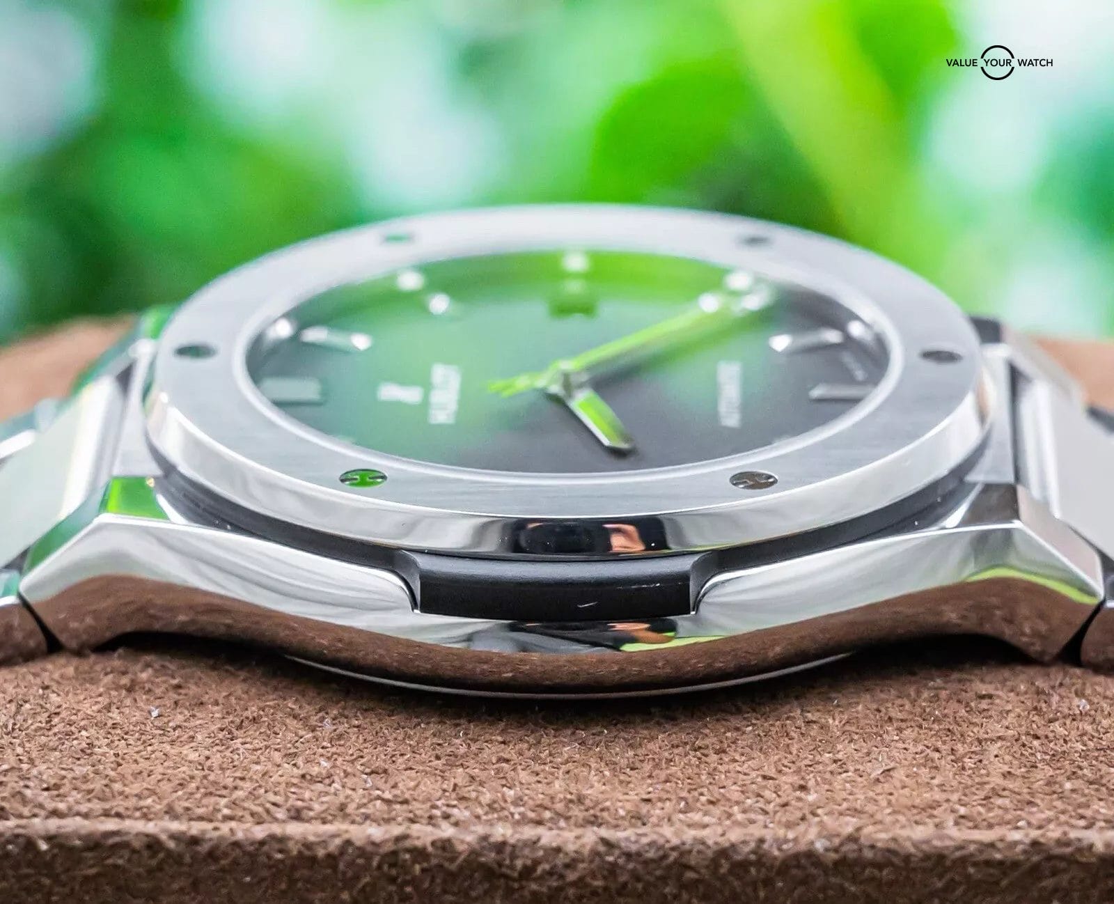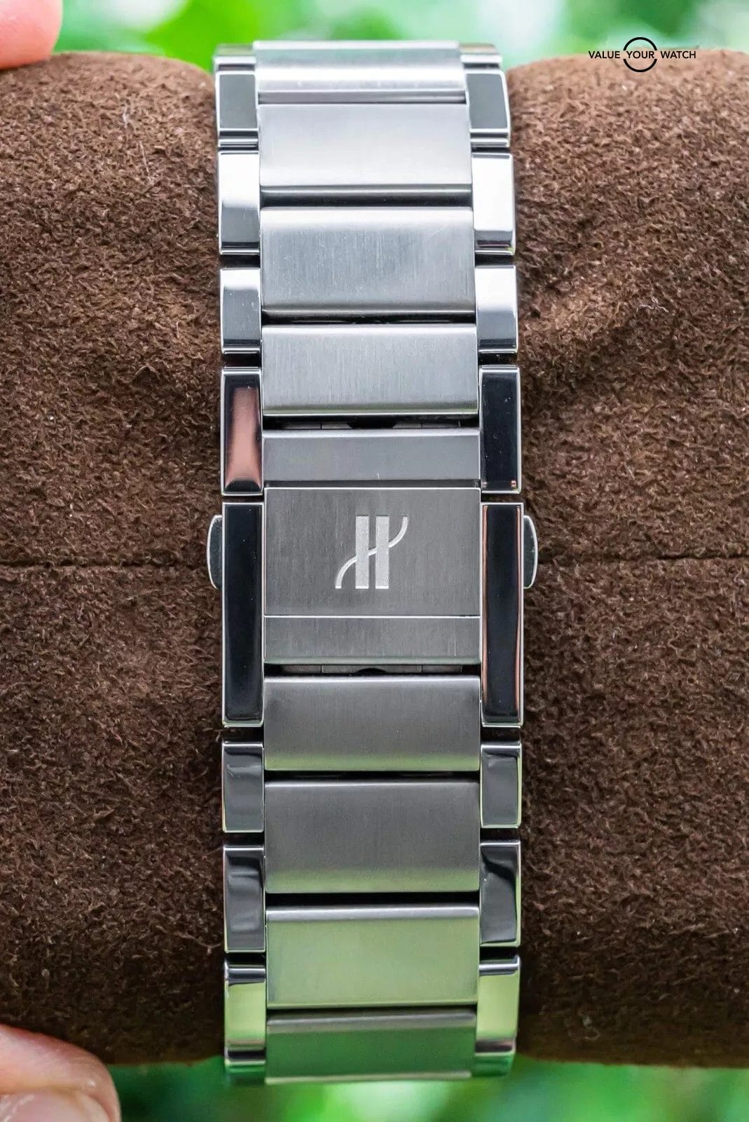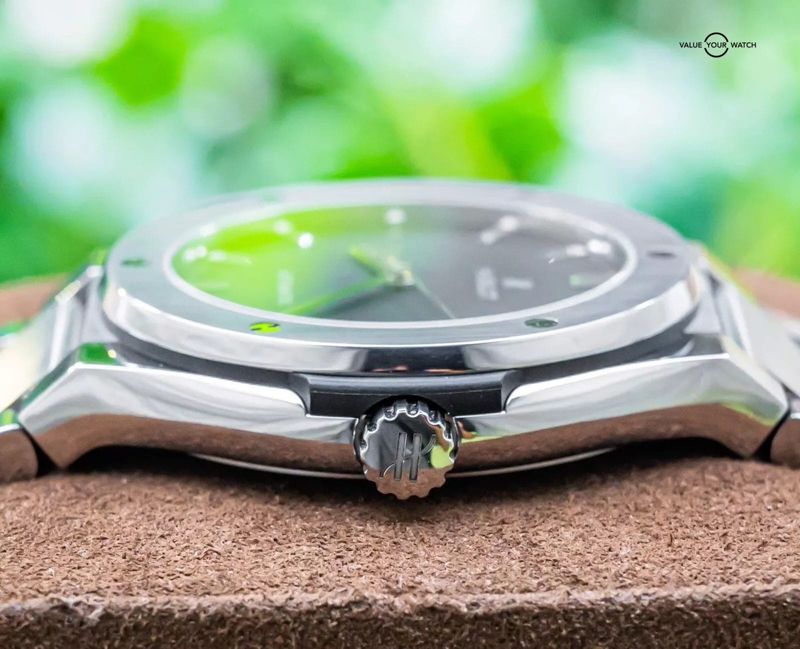 STUNNING Hublot Classic Fusion 45 mm Titanium with Black Dial on Rare Integrated Titanium Bracelet! Arrives with original Hublot boxes and papers including the NFC style warranty card. Do not confuse this NFC style card for the older write-in style cards, the NFC card is unreplicatable as it’s embossed with the serial from the factory, a huge value-add. Originally purchased from Hublot Authorized Dealer in March 2022. Have peace of mind, it is WARRANTIED through Hublot until September 2024! Striking piece and a significant bang for your buck, the watch’s mix of brushed and polished titanium finishes make the watch look phenomenal and comparable to $20K watches in my opinion. Ready to be on wrist!