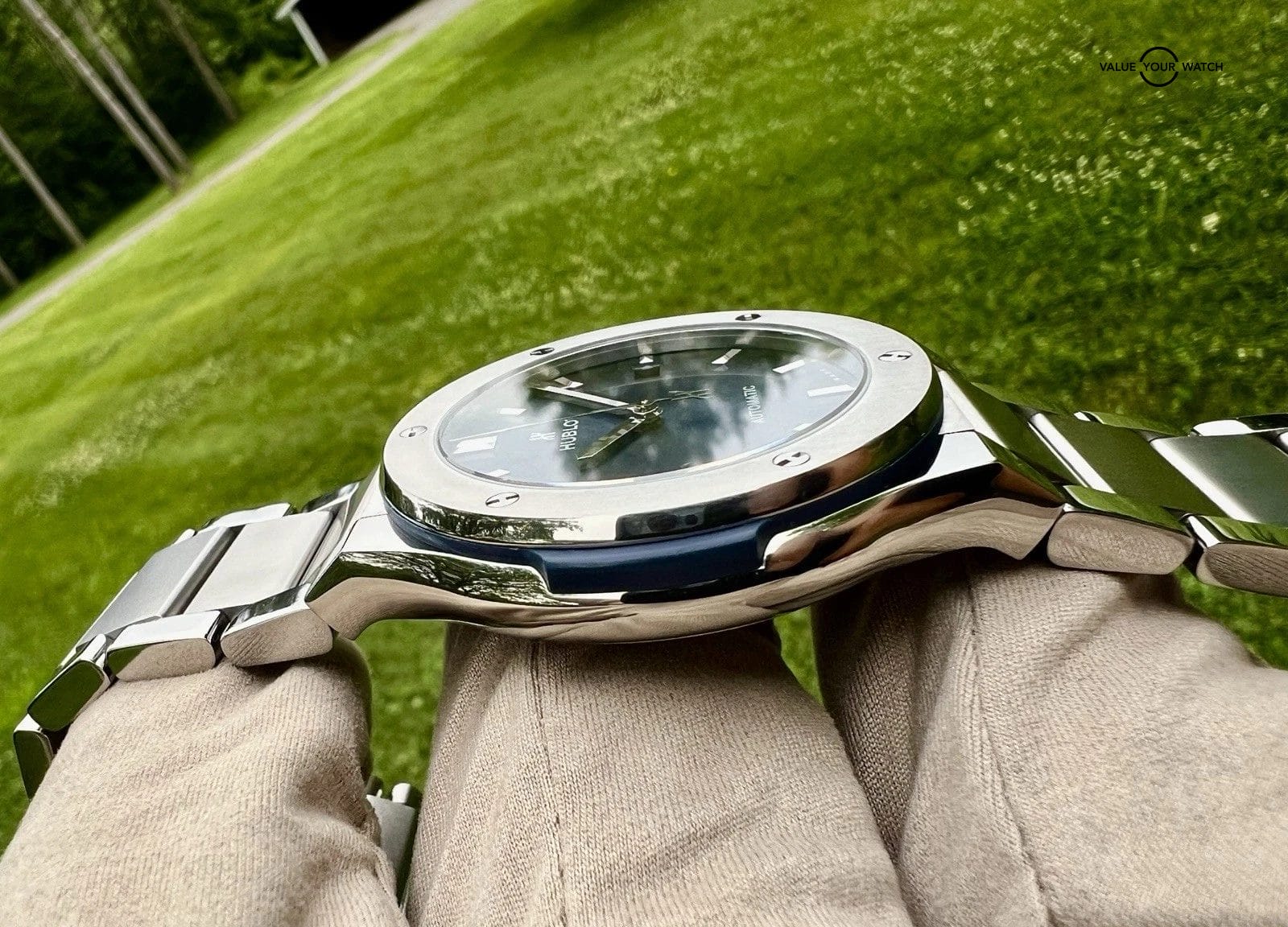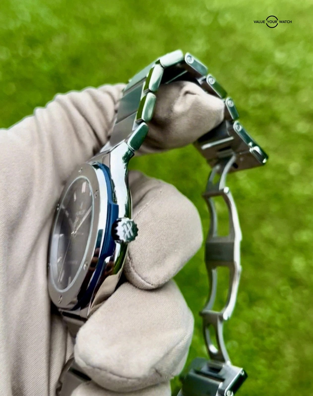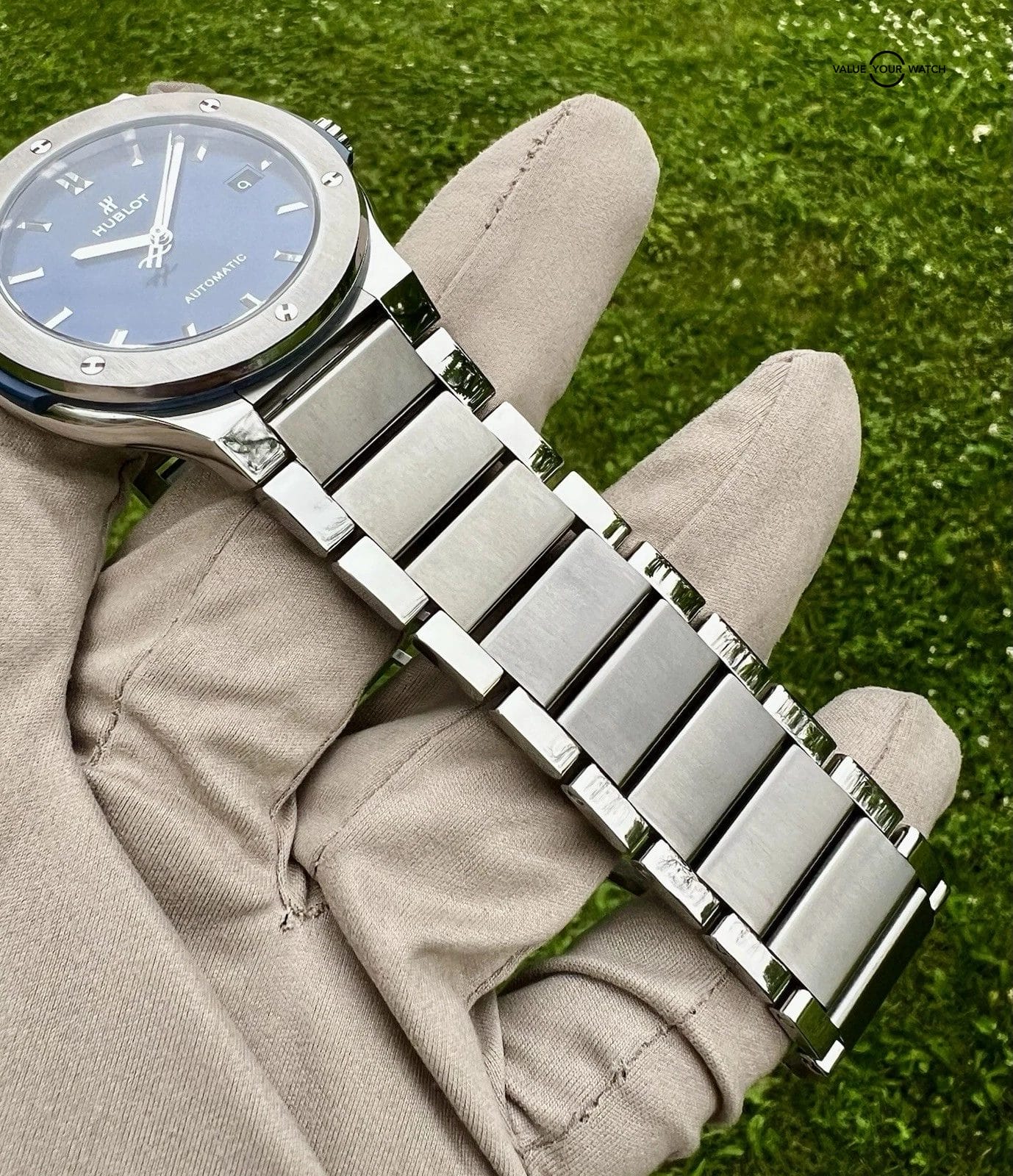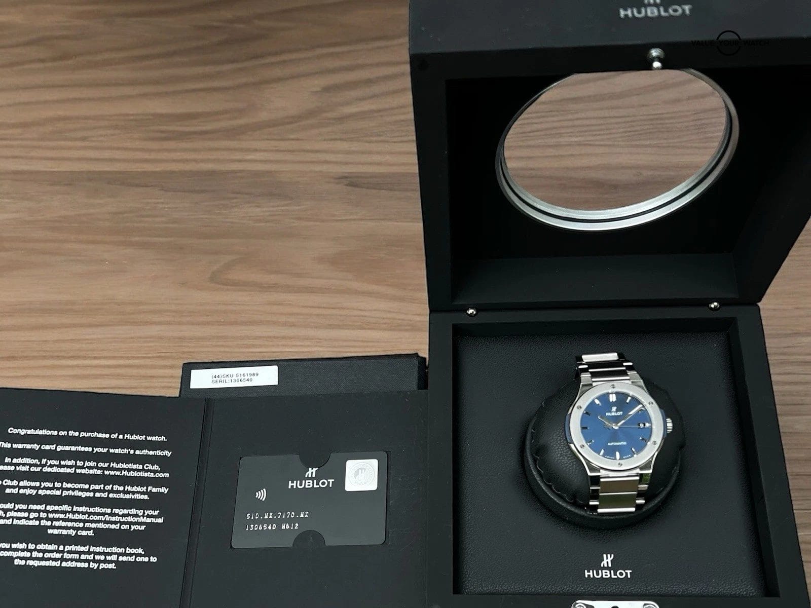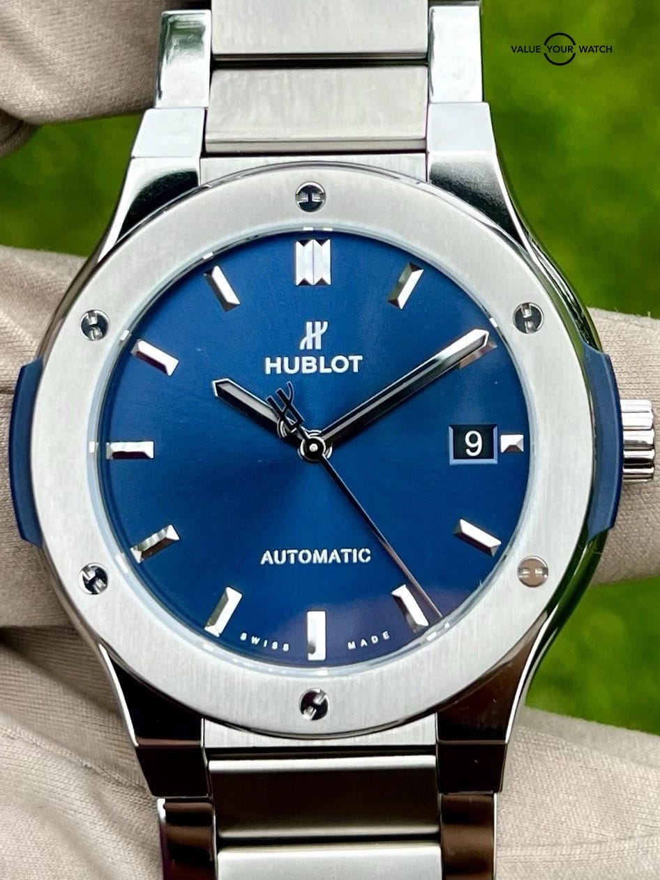 The Hublot Classic Fusion 45MM Blue Dial Titanium Bracelet (510.NX.7170.NX) is a stylish and sophisticated men’s wristwatch featuring a gray case and silver bezel. This classic timepiece boasts a mechanical automatic movement and date indicator, with a water resistance of 50m. The watch comes with a push-button deployant closure, baton indexes, and sapphire crystal features. The bracelet is made of titanium and the case size is 45mm, offering a sleek and timeless design suitable for everyday wear. Perfect for watch collectors, this Hublot watch is a luxury addition to any watch collection.