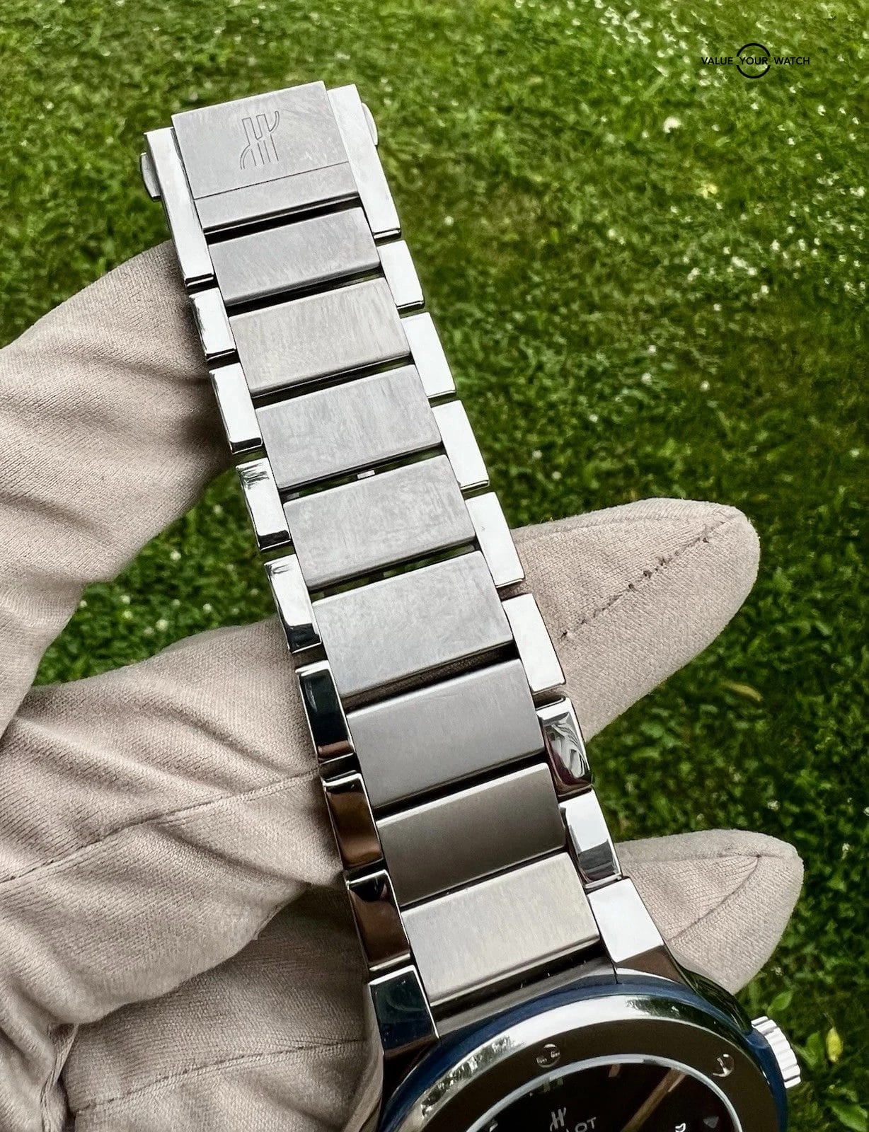 This stunning Hublot is in excellent condition and comes with full links, and the original box and warranty card. Don’t wait to make an offer and add this stunning watch to your collection today!