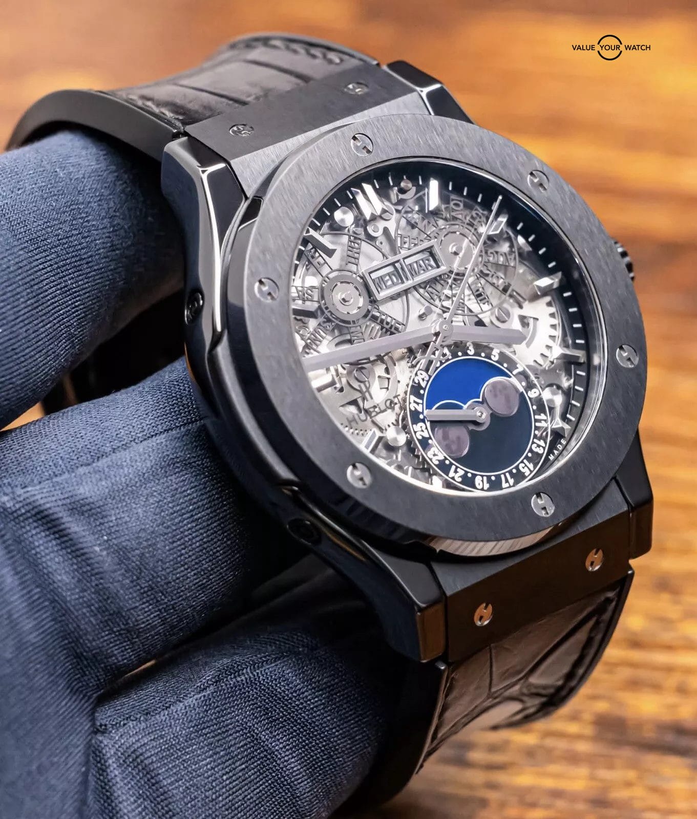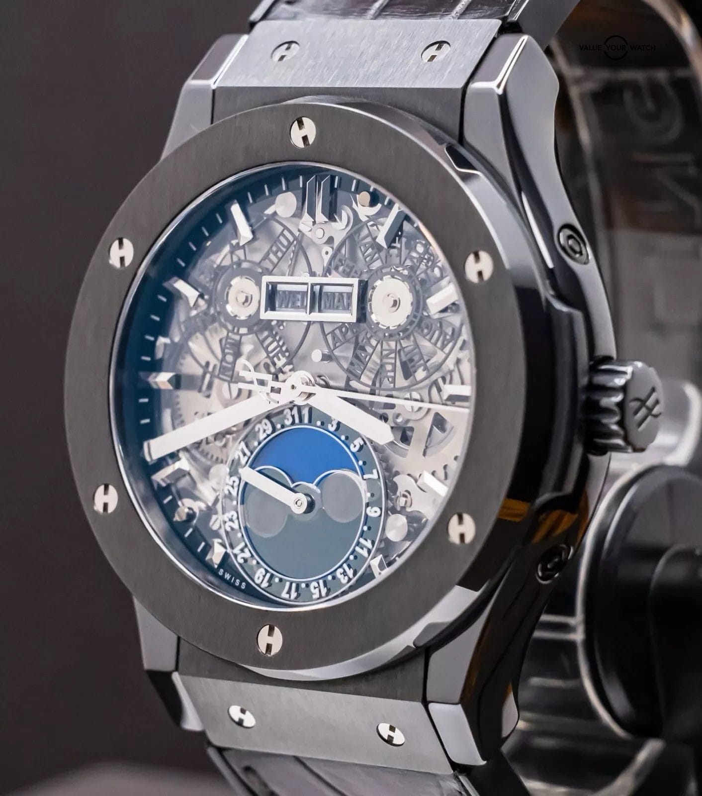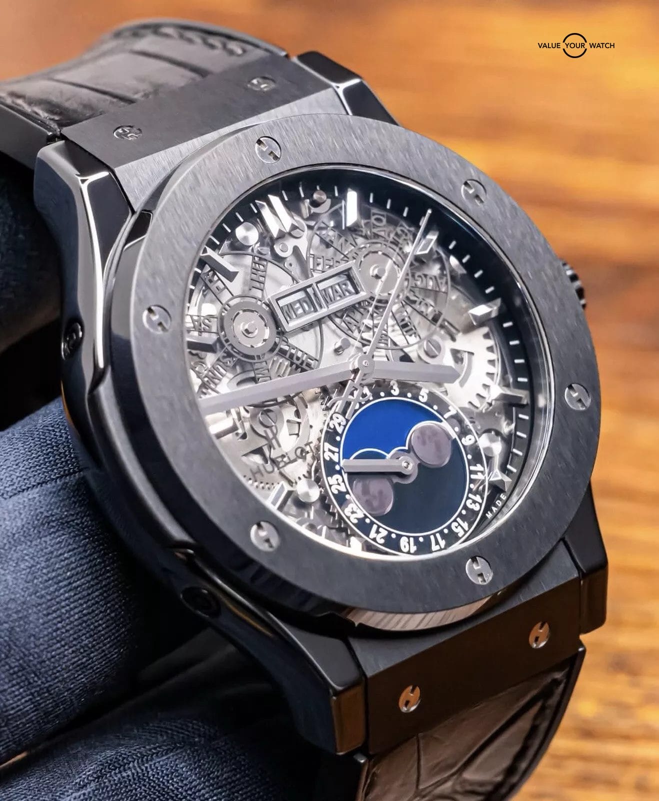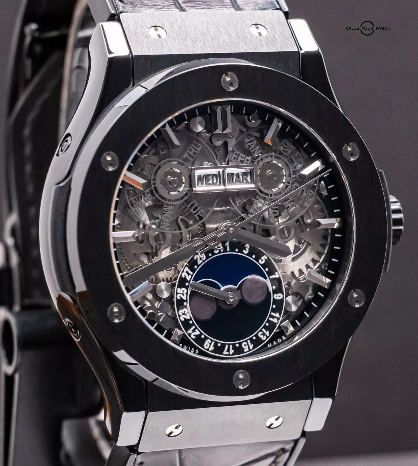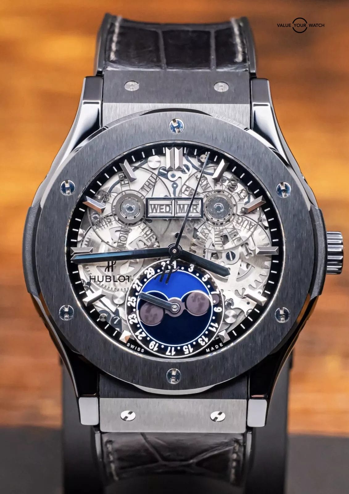 STUNNING Hublot Classic Fusion Aerofusion Moonphase 45 mm Skeleton Dial in Black Ceramic on Black Hublot Alligator Strap! Arrives watch only and keeping good time on my timegrapher when tested. This Moonphase is a phenomenal piece, and when I say phenomenal, let me tell you- I have owned over 3000 watches over the course of seven years in the business, and I own an identical one of these but in Rose Gold in my personal collection since August 2020. Since then, my opinion has remained unwavered, that this is simply one of the coolest watches you can buy within a $50K budget. Whether in Ceramic or Rose, either is a win, because you can pair literally any colored strap on it, if you’d prefer more contrast. This is also in the discontinued 45mm size, way better than the 42mm (of which I was never a fan of, the 45mm is quite literally perfect for all wrist sizes). Take advantage of the opportunity- this Aerofusion holds ground with even the coolest watches in the industry, at a significant value & attractive price point!