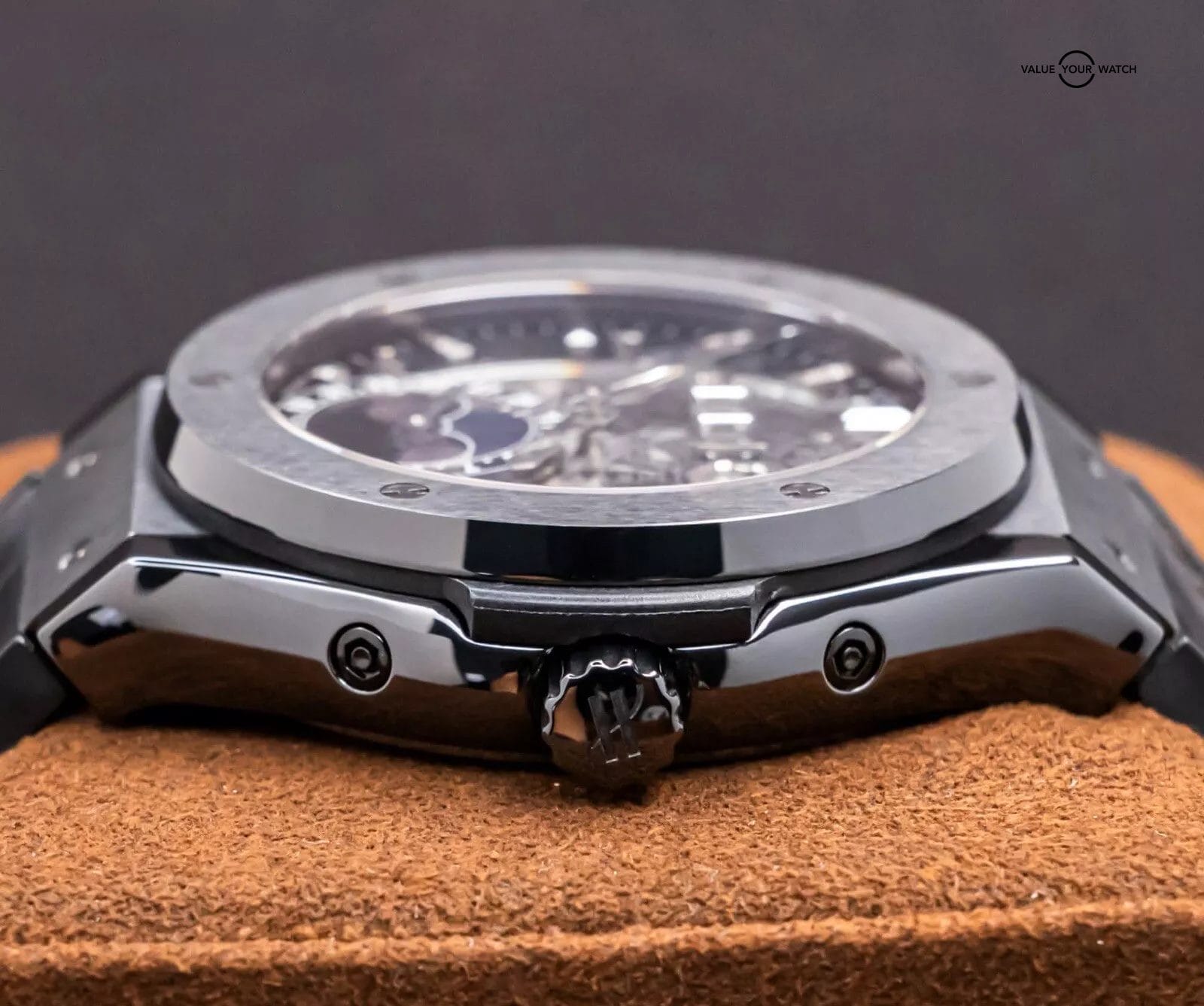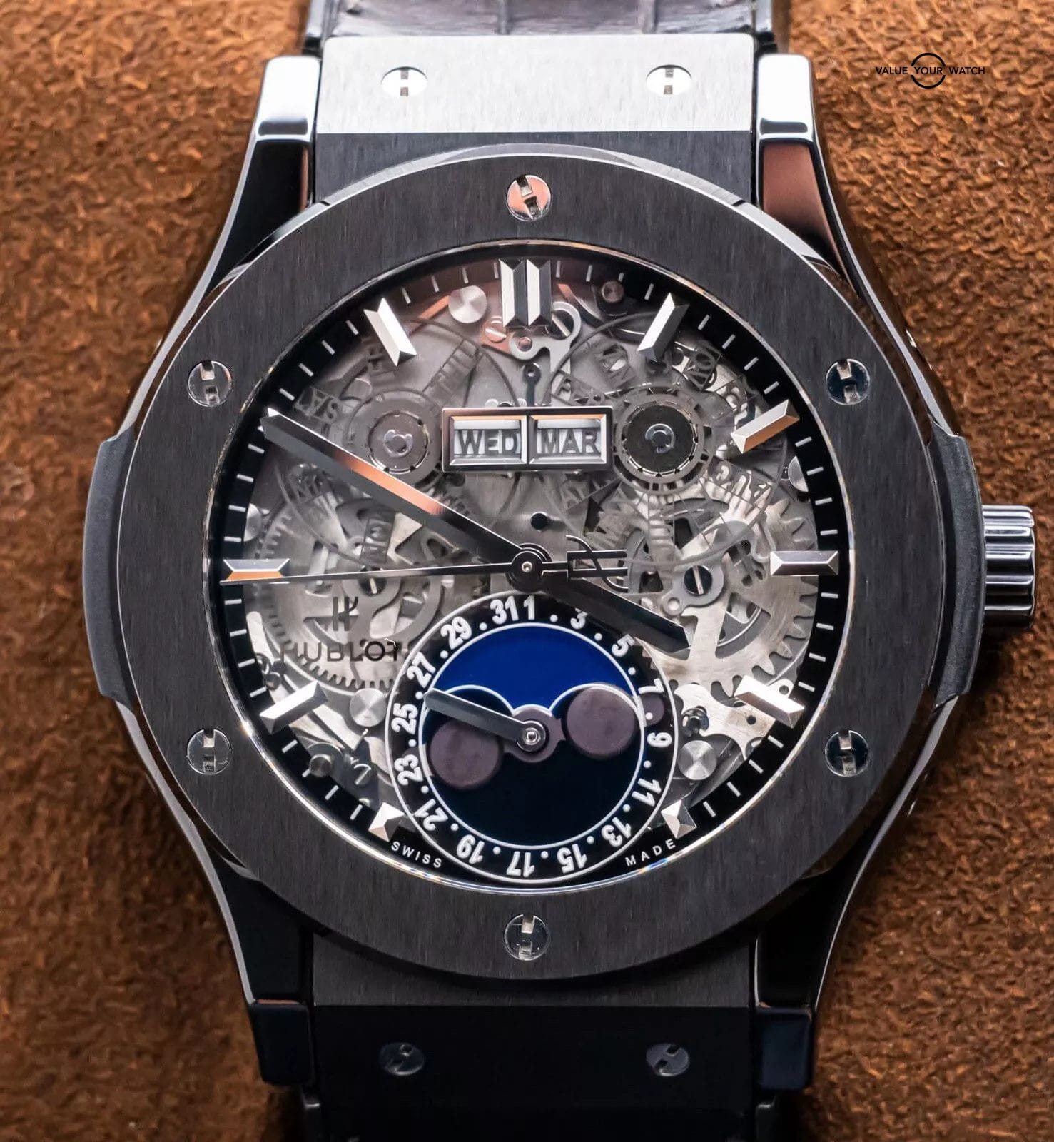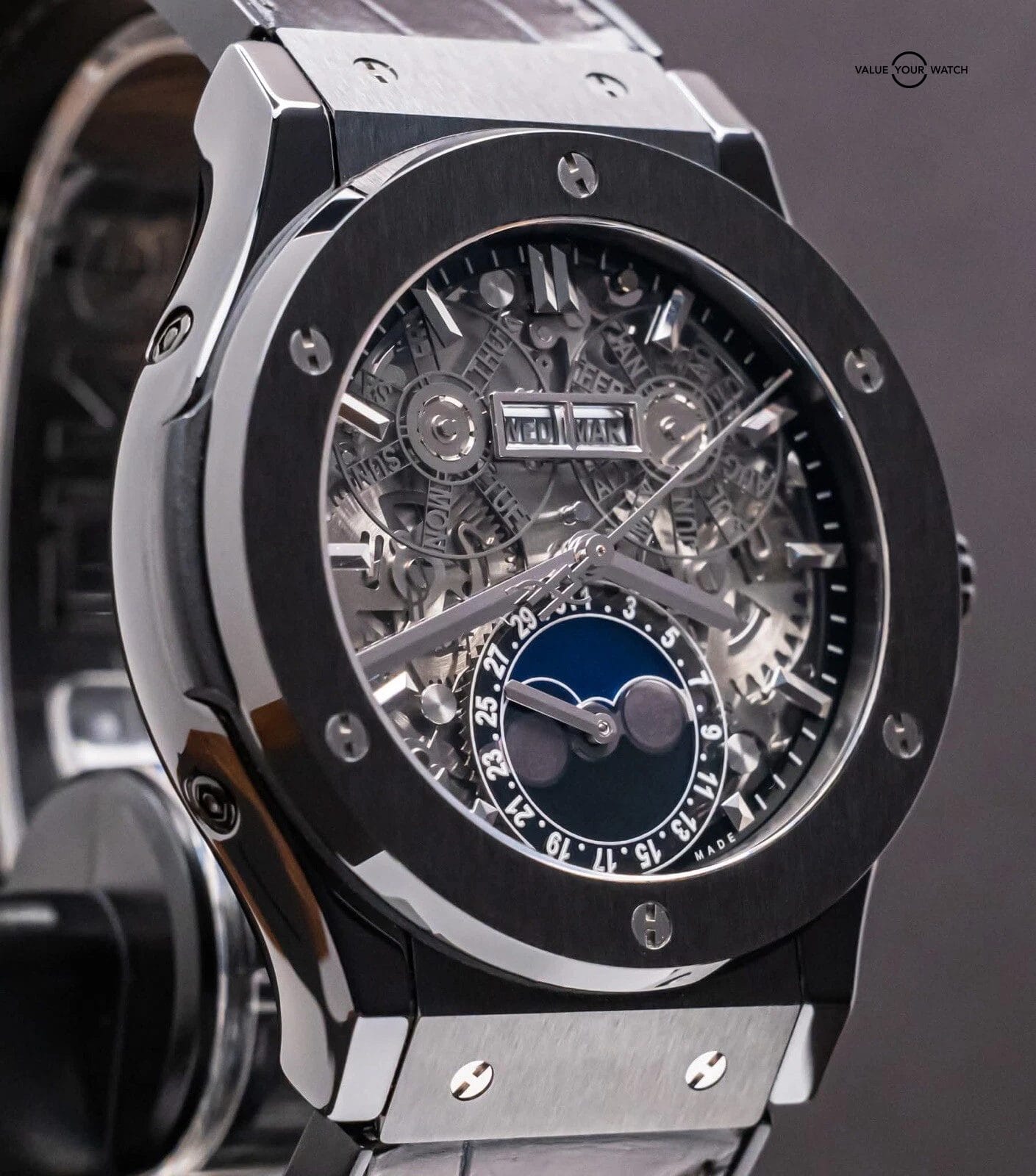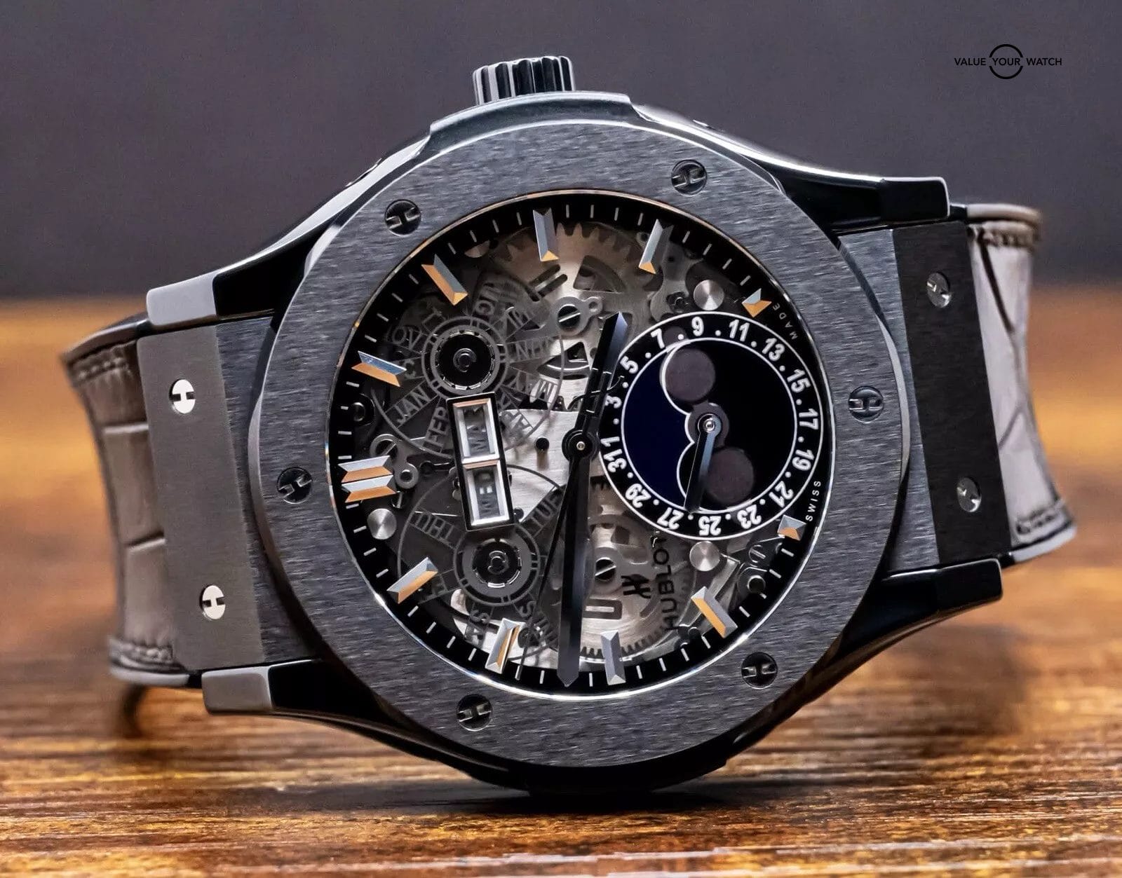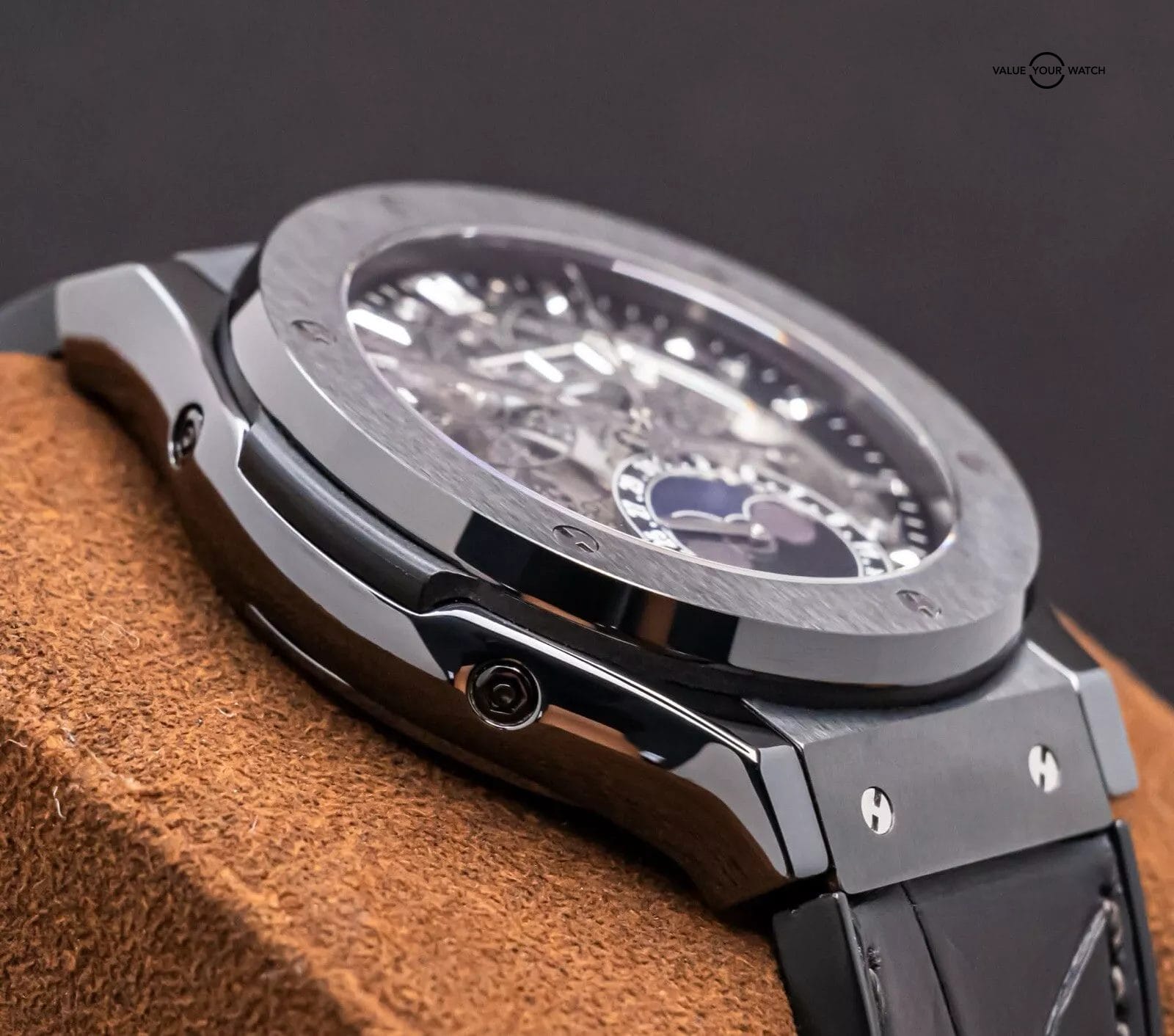 STUNNING Hublot Classic Fusion Aerofusion Moonphase 45 mm Skeleton Dial in Black Ceramic on Black Hublot Alligator Strap! Arrives watch only and keeping good time on my timegrapher when tested. This Moonphase is a phenomenal piece, and when I say phenomenal, let me tell you- I have owned over 3000 watches over the course of seven years in the business, and I own an identical one of these but in Rose Gold in my personal collection since August 2020. Since then, my opinion has remained unwavered, that this is simply one of the coolest watches you can buy within a $50K budget. Whether in Ceramic or Rose, either is a win, because you can pair literally any colored strap on it, if you’d prefer more contrast. This is also in the discontinued 45mm size, way better than the 42mm (of which I was never a fan of, the 45mm is quite literally perfect for all wrist sizes). Take advantage of the opportunity- this Aerofusion holds ground with even the coolest watches in the industry, at a significant value & attractive price point!
