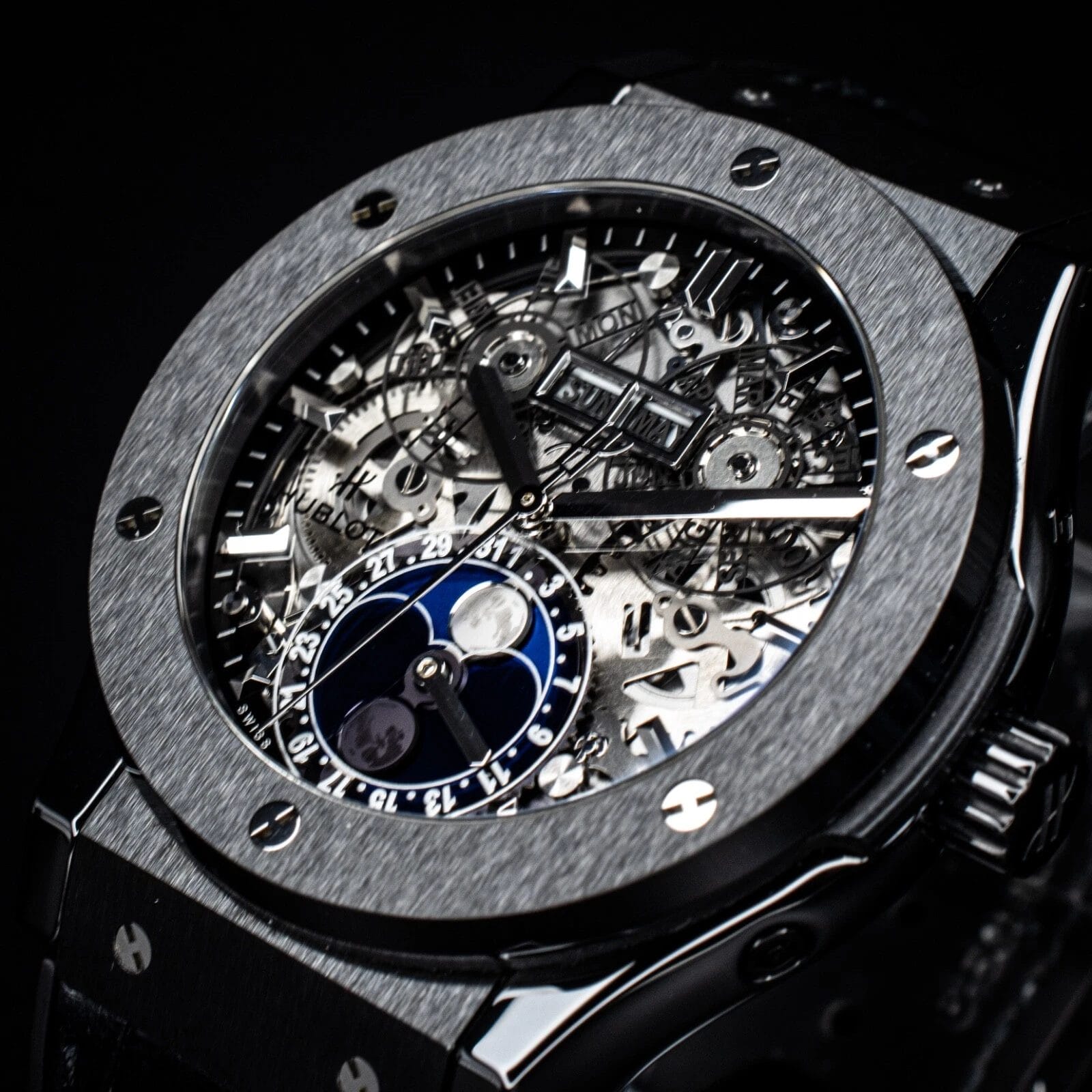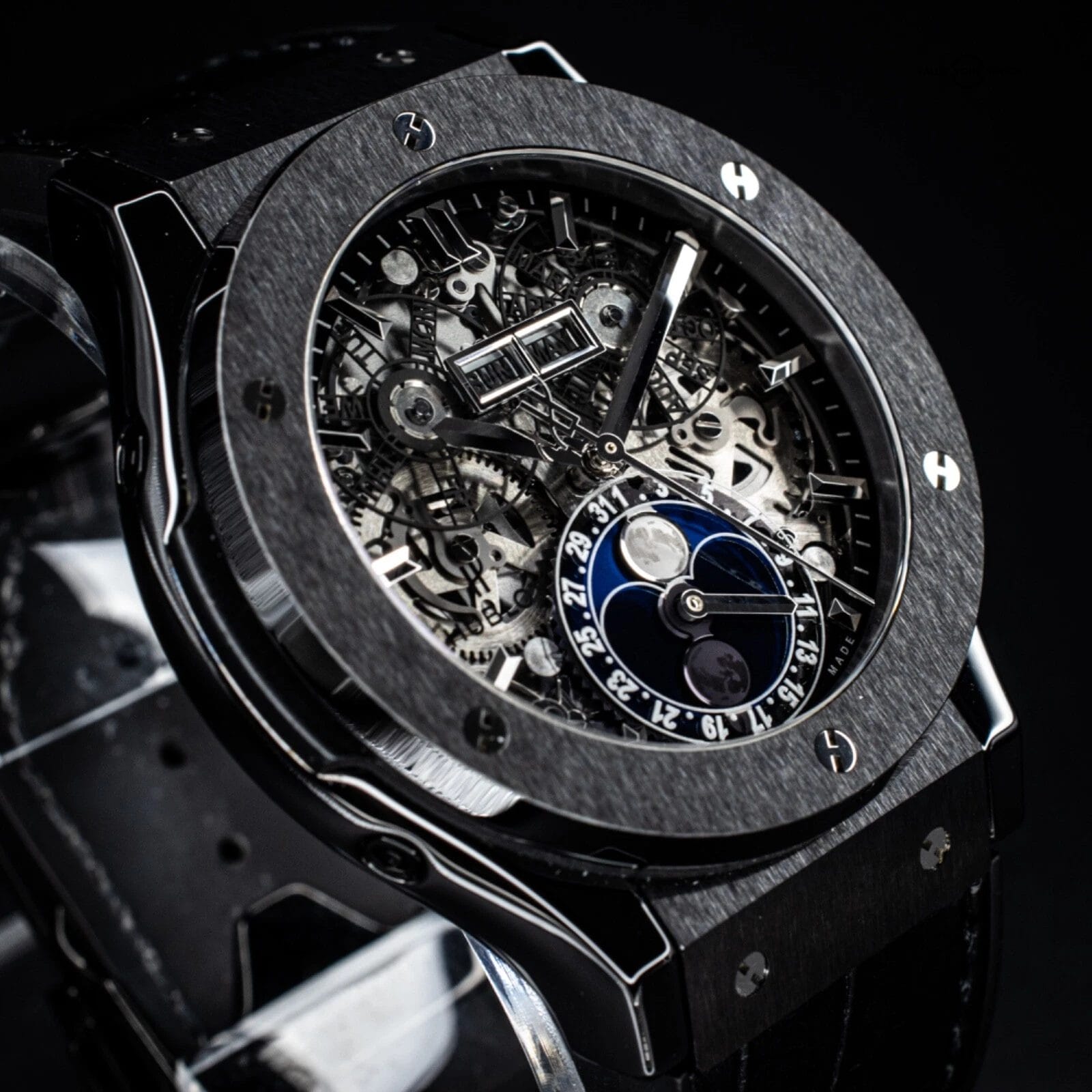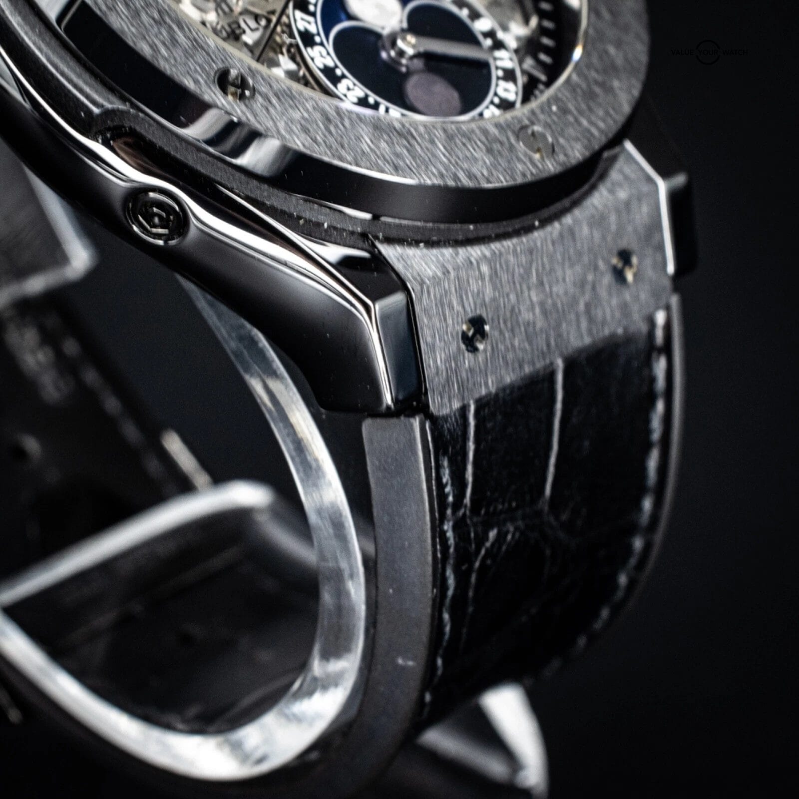 The Hublot Classic Fusion Aerofusion Moonphase Black Magic combines technical edge with refined detail, featuring a 45mm polished and satin-finished black ceramic case and an openworked dial that puts the automatic HUB1131 movement on full display. At 6 o’clock, a detailed moonphase disc adds a poetic, astronomical element to an otherwise modern and industrial design. A date subdial surrounds the moon phase disc without overpowering the open architecture. The sapphire crystal on both sides offers a clear view into the mechanical complexity, while the black alligator strap with rubber backing keeps it comfortable and durable. The ceramic case keeps the watch light on the wrist despite its bold size, and the combination of technical materials with classical complications is distinctly Hublot.