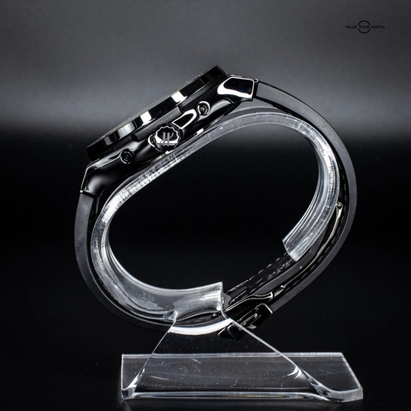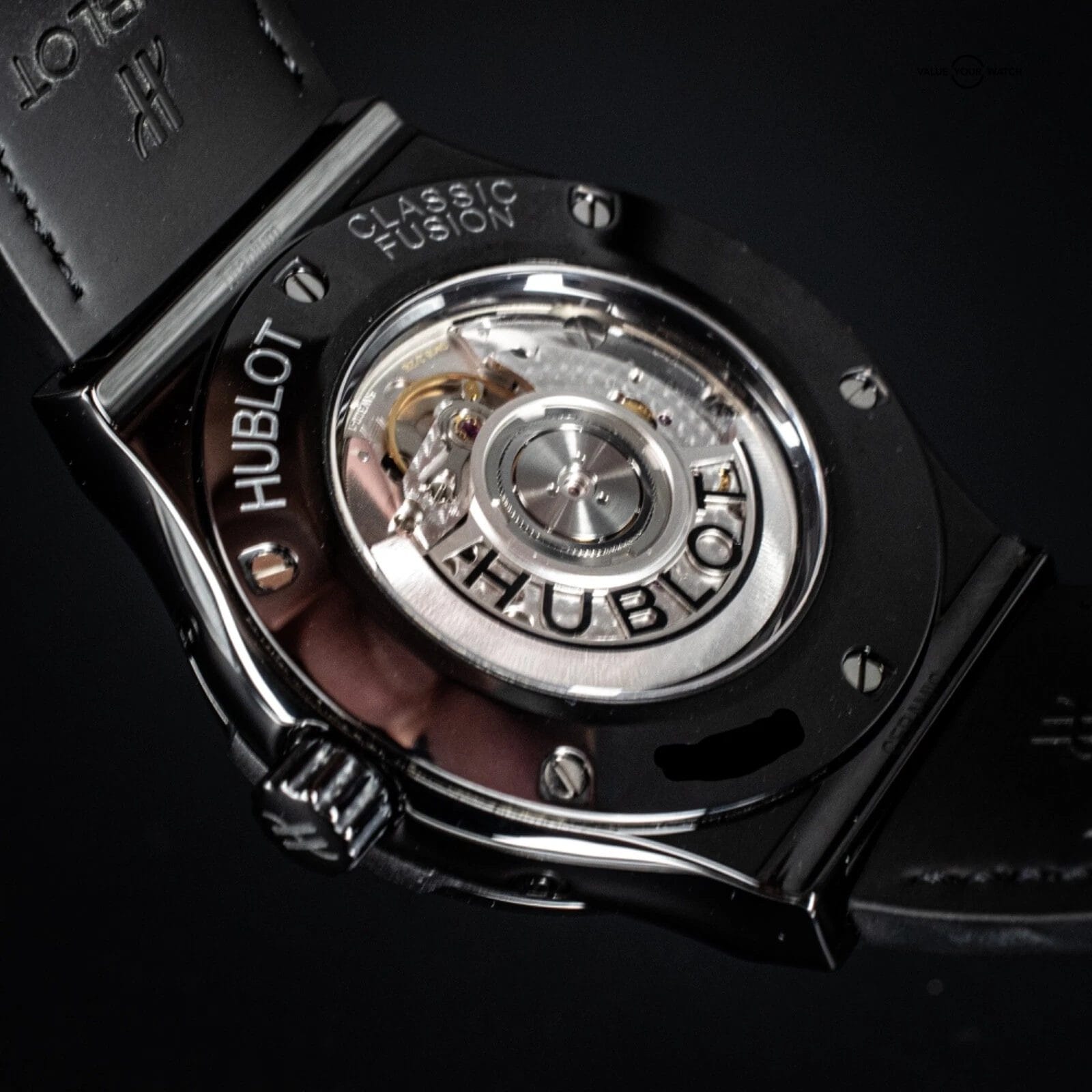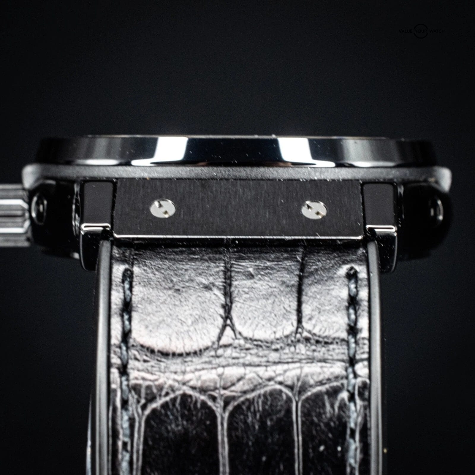 The Hublot Classic Fusion Aerofusion Moonphase Black Magic combines technical edge with refined detail, featuring a 45mm polished and satin-finished black ceramic case and an openworked dial that puts the automatic HUB1131 movement on full display. At 6 o’clock, a detailed moonphase disc adds a poetic, astronomical element to an otherwise modern and industrial design. A date subdial surrounds the moon phase disc without overpowering the open architecture. The sapphire crystal on both sides offers a clear view into the mechanical complexity, while the black alligator strap with rubber backing keeps it comfortable and durable. The ceramic case keeps the watch light on the wrist despite its bold size, and the combination of technical materials with classical complications is distinctly Hublot.