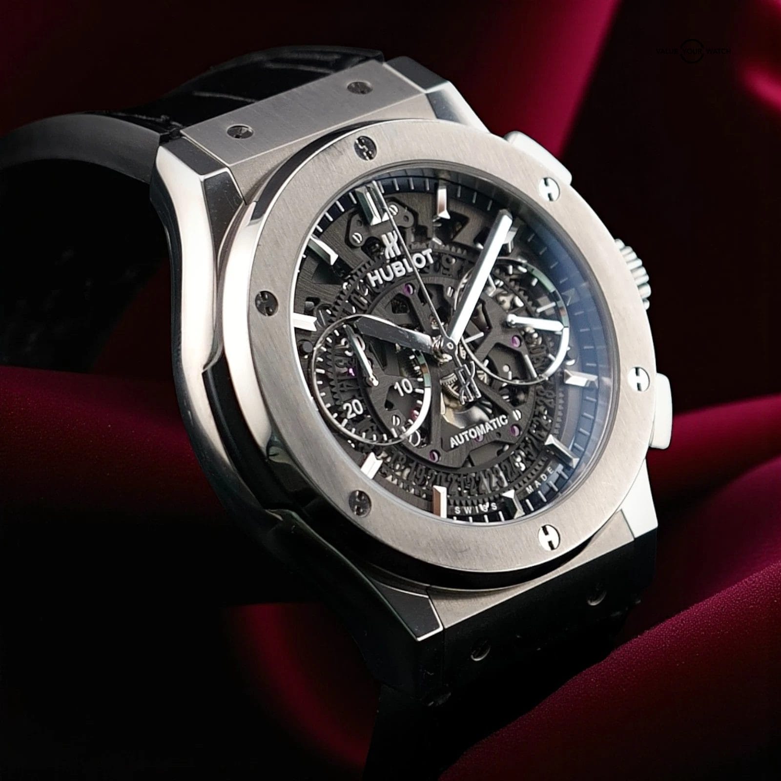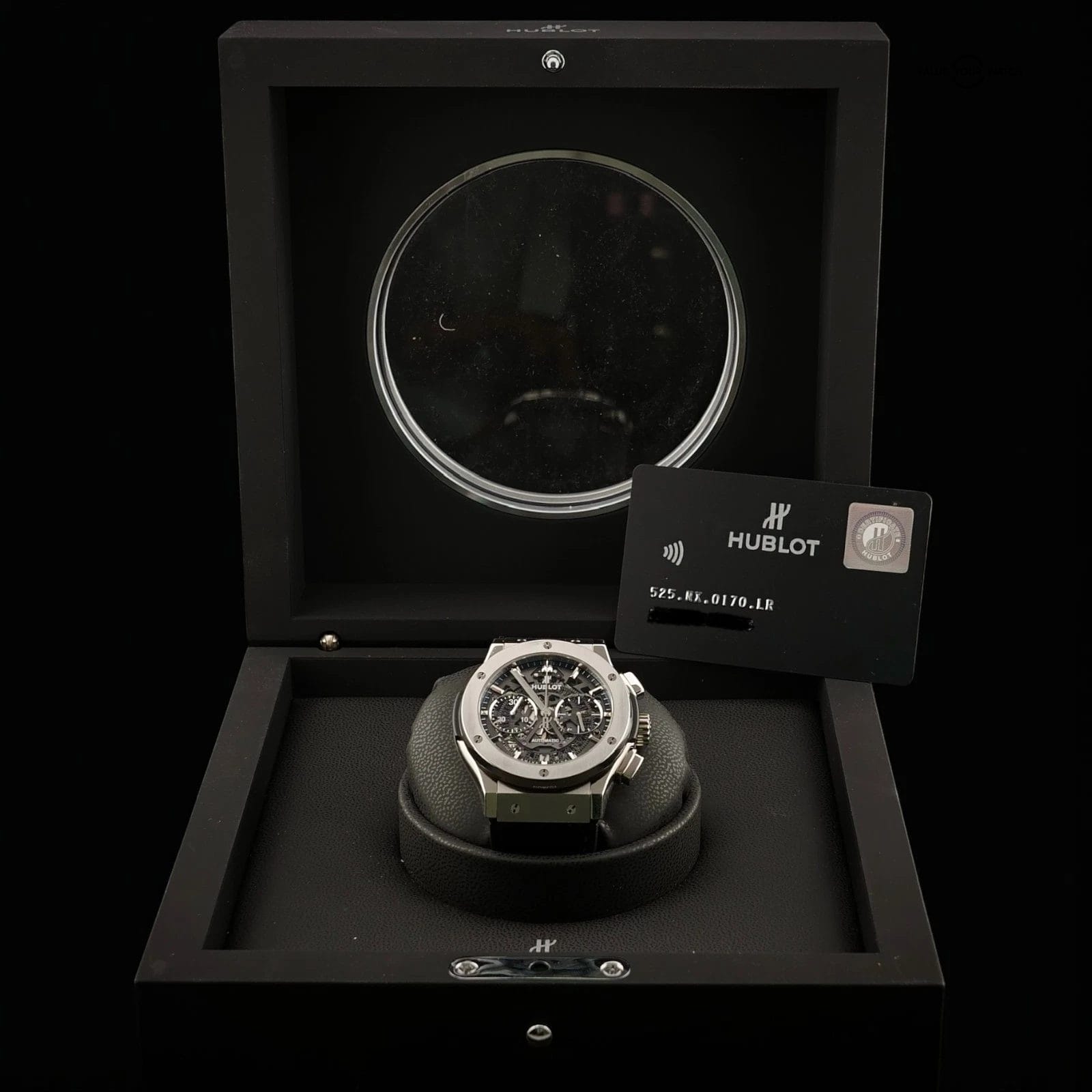 This Classic Fusion Aero Chronograph is the pure Hublot experience: a lightweight satin finished titanium case, a fully open worked dial that lets you see the chronograph engine at work, and a modern profile that moves easily between business, travel, and weekend wear. For enthusiasts it ticks every box, because you get a true skeleton Hublot, a versatile factory original full set, and an extra rubber strap that turns this into a wrist ready daily companion or statement piece on demand.