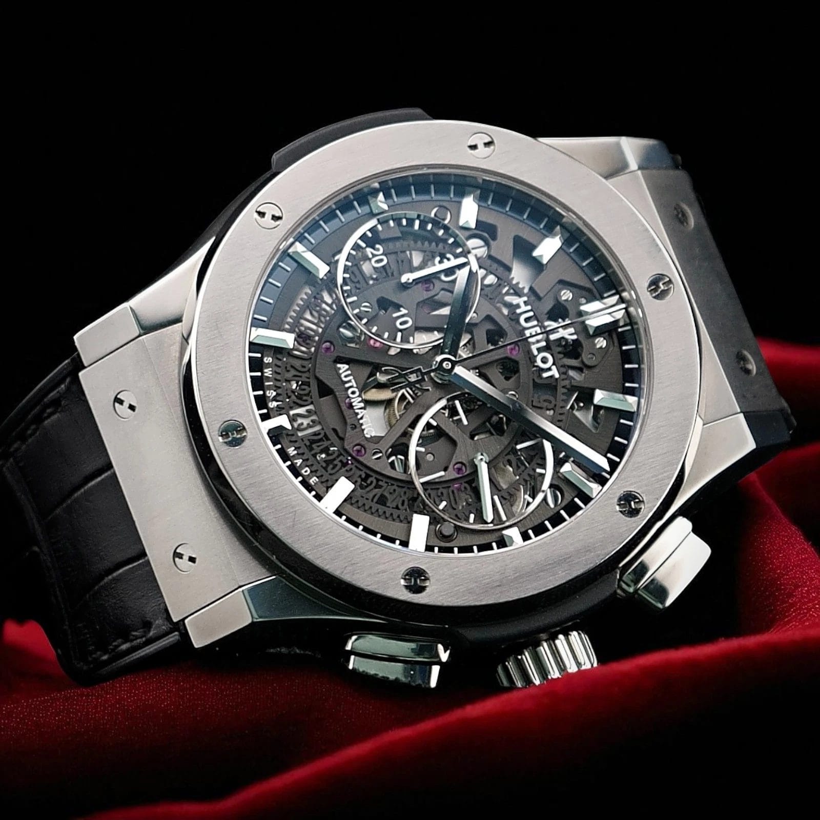 Among Classic Fusion models, the Aero Chronograph stands out because it gives you the Hublot skeleton look without going into oversized or overly aggressive territory. The 45 mm titanium case keeps weight comfortable, the profile sits flatter than many chunky sports chronographs, and the factory set plus extra rubber strap means you are effectively getting two distinct personalities in one watch. It is the kind of piece that satisfies both the engineering lover, who wants to see gears and levers in motion, and the style focused collector, who wants a clean, modern silhouette that still reads as unmistakably Hublot from across the room.