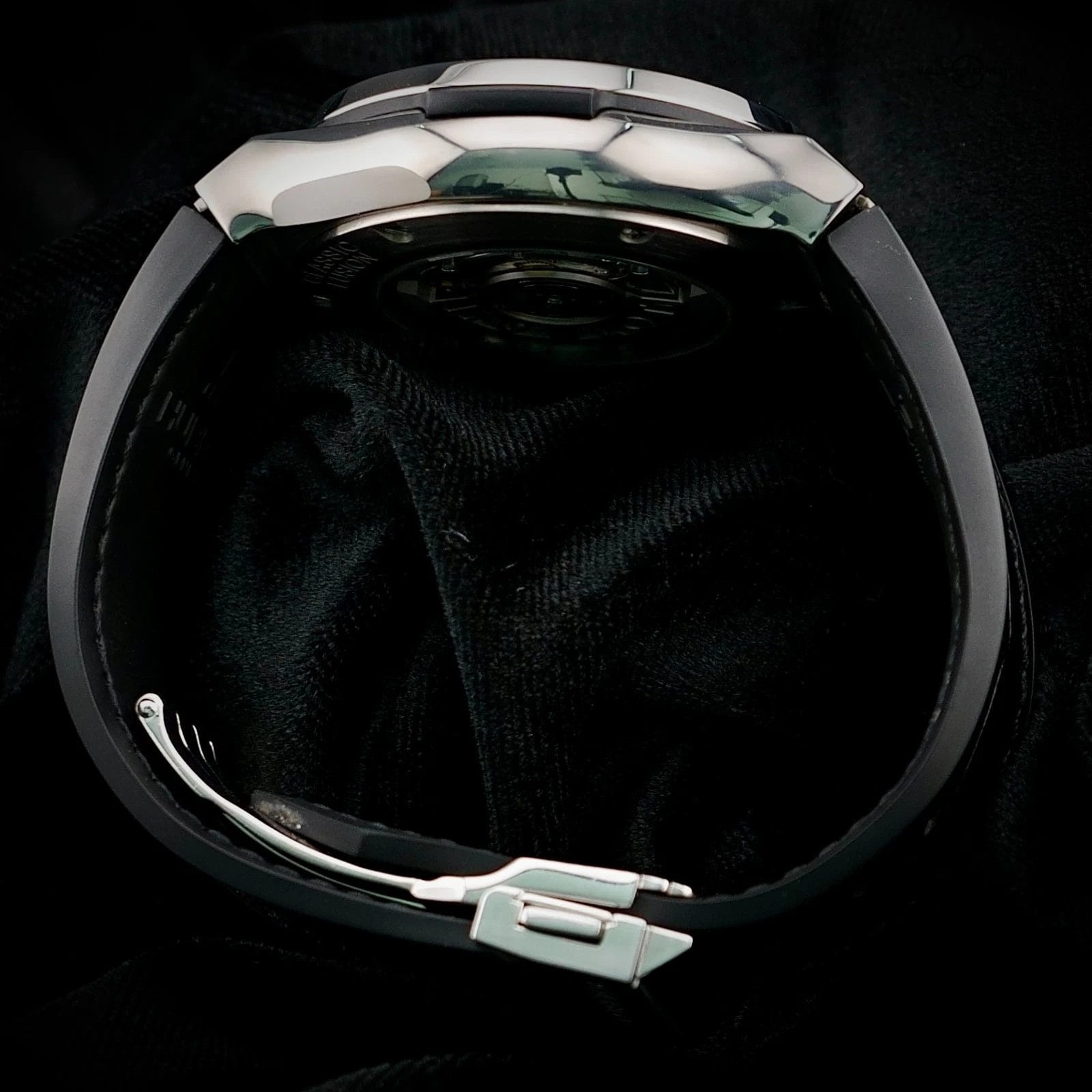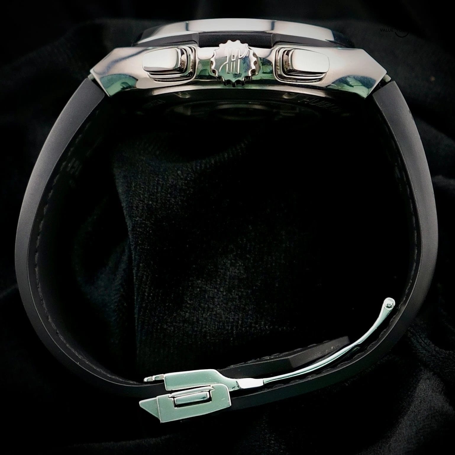 Straps Original Hublot black alligator leather strap with rubber lining and Hublot clasp, plus extra high quality black rubber strap for a more sport forward look.