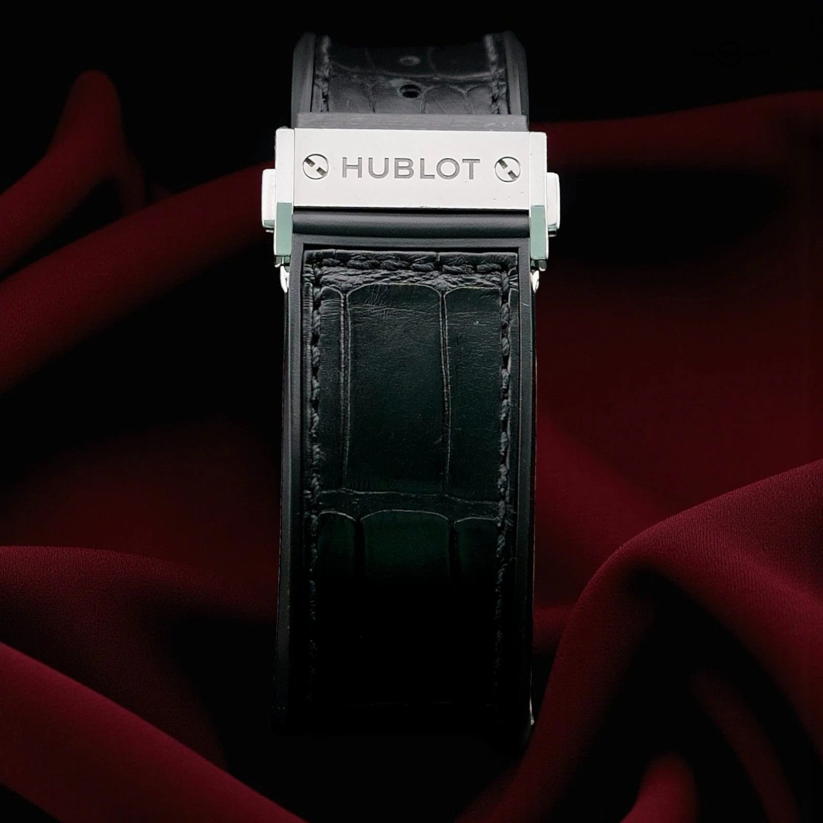 Original black alligator leather strap with rubber lining and signed Hublot clasp.