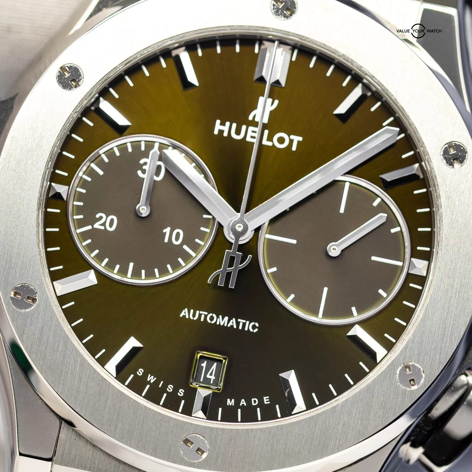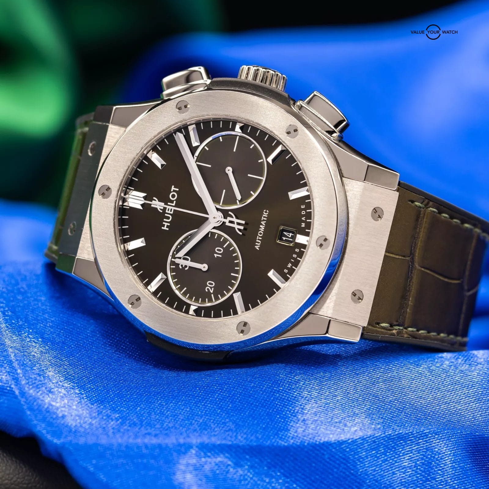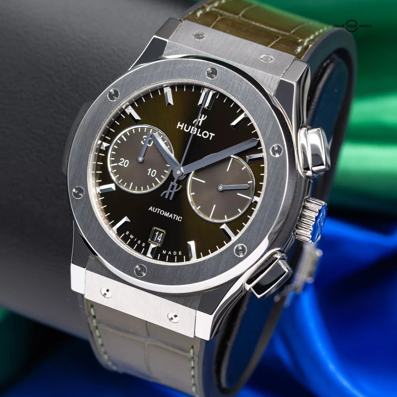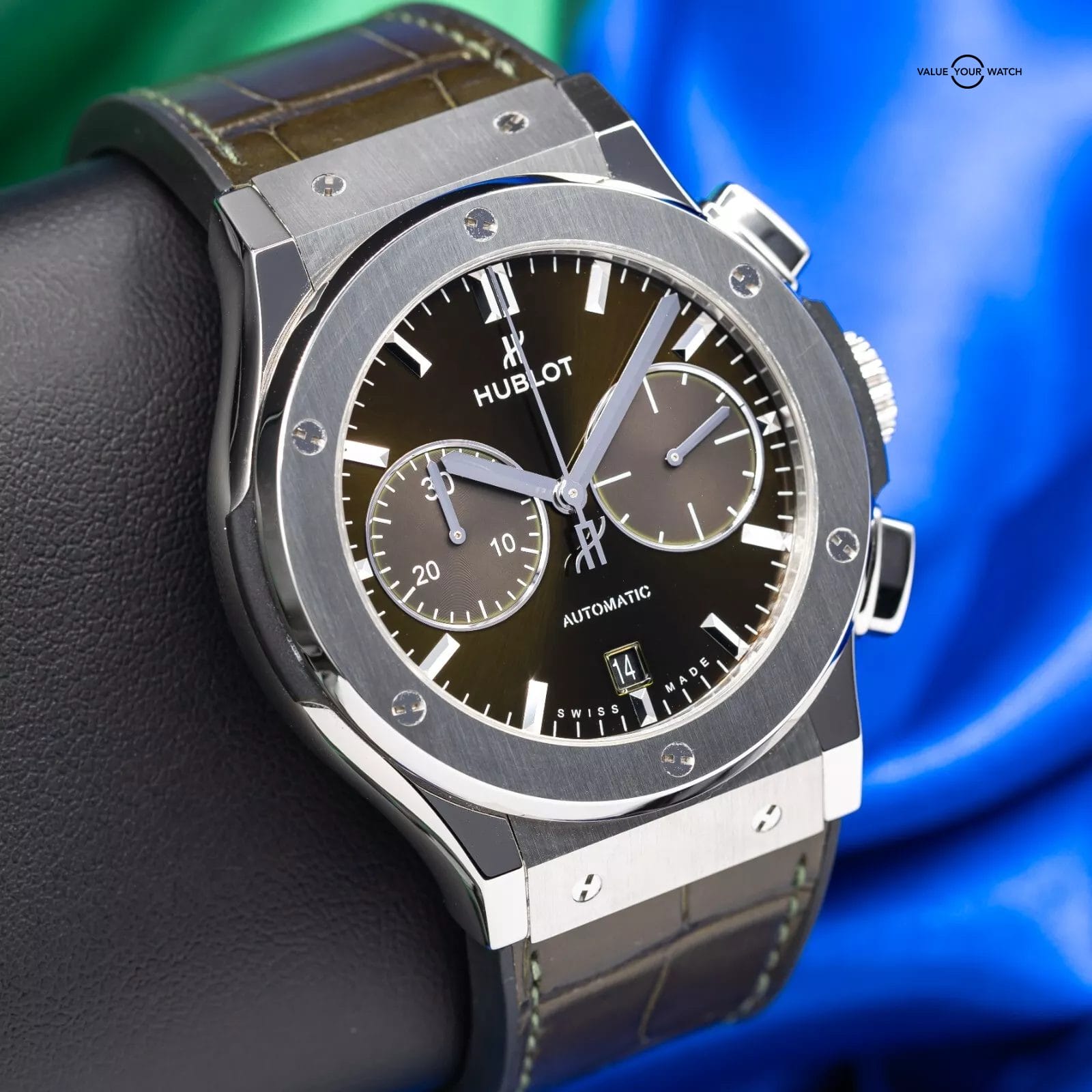 Exhibiting a captivating blend of timeless elegance and cutting-edge innovation, the Hublot Classic Fusion Chronograph 521.NX.8970.LR stands as a remarkable timepiece in the unique lineup of Hublot timepieces. The case of this impressive timepiece is meticulously crafted from titanium, a favored material for luxury sports watches due to its lightweight and robust nature, adds a touch of sophistication. Showcasing a polished edge and a diameter of 45mm that embodies Hublot’s modern and streamlined aesthetic, the titanium bezel is adorned with six iconic H-shaped screws, symbolizing the brand’s iconic design. The unique green dial, boasting a captivating satin finish, showcases rhodium-plated hour markers and hands that create a stunning contrast. Positioned at 6 o’clock, a date window adds practicality, while two sub-dials grace the 3 o’clock (small seconds) and 9 o’clock (30-minute counter) positions.