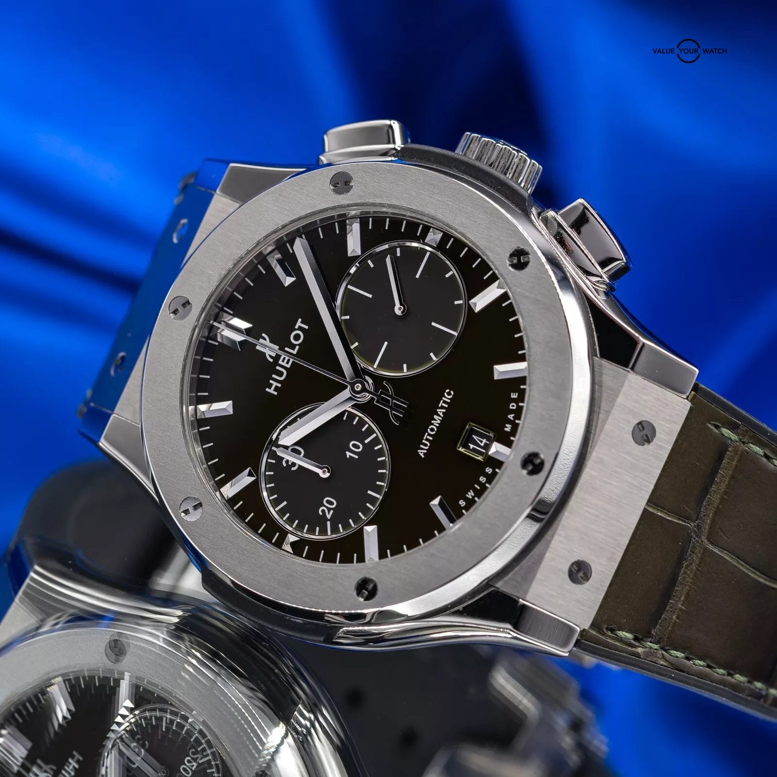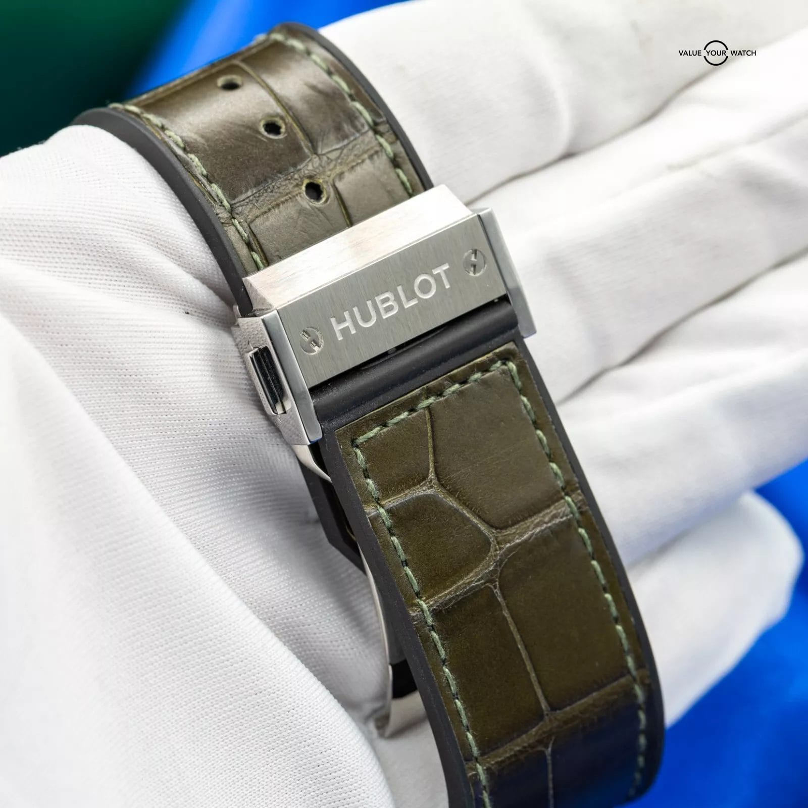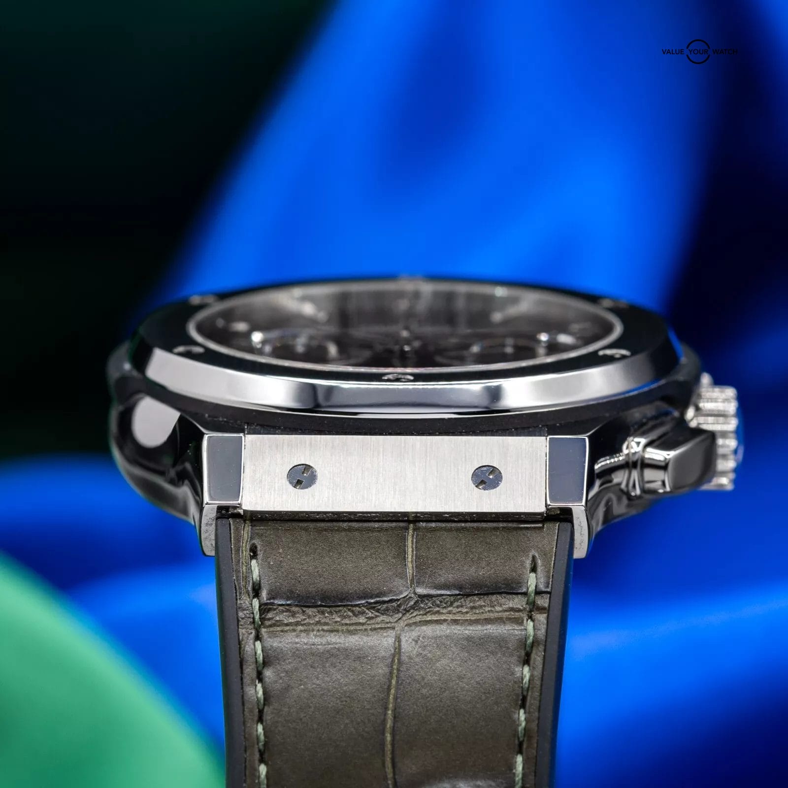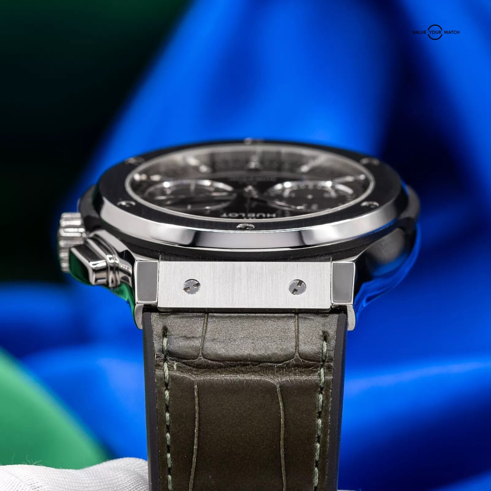 Exhibiting a captivating blend of timeless elegance and cutting-edge innovation, the Hublot Classic Fusion Chronograph 521.NX.8970.LR stands as a remarkable timepiece in the unique lineup of Hublot timepieces. The case of this impressive timepiece is meticulously crafted from titanium, a favored material for luxury sports watches due to its lightweight and robust nature, adds a touch of sophistication. Showcasing a polished edge and a diameter of 45mm that embodies Hublot’s modern and streamlined aesthetic, the titanium bezel is adorned with six iconic H-shaped screws, symbolizing the brand’s iconic design. The unique green dial, boasting a captivating satin finish, showcases rhodium-plated hour markers and hands that create a stunning contrast. Positioned at 6 o’clock, a date window adds practicality, while two sub-dials grace the 3 o’clock (small seconds) and 9 o’clock (30-minute counter) positions.