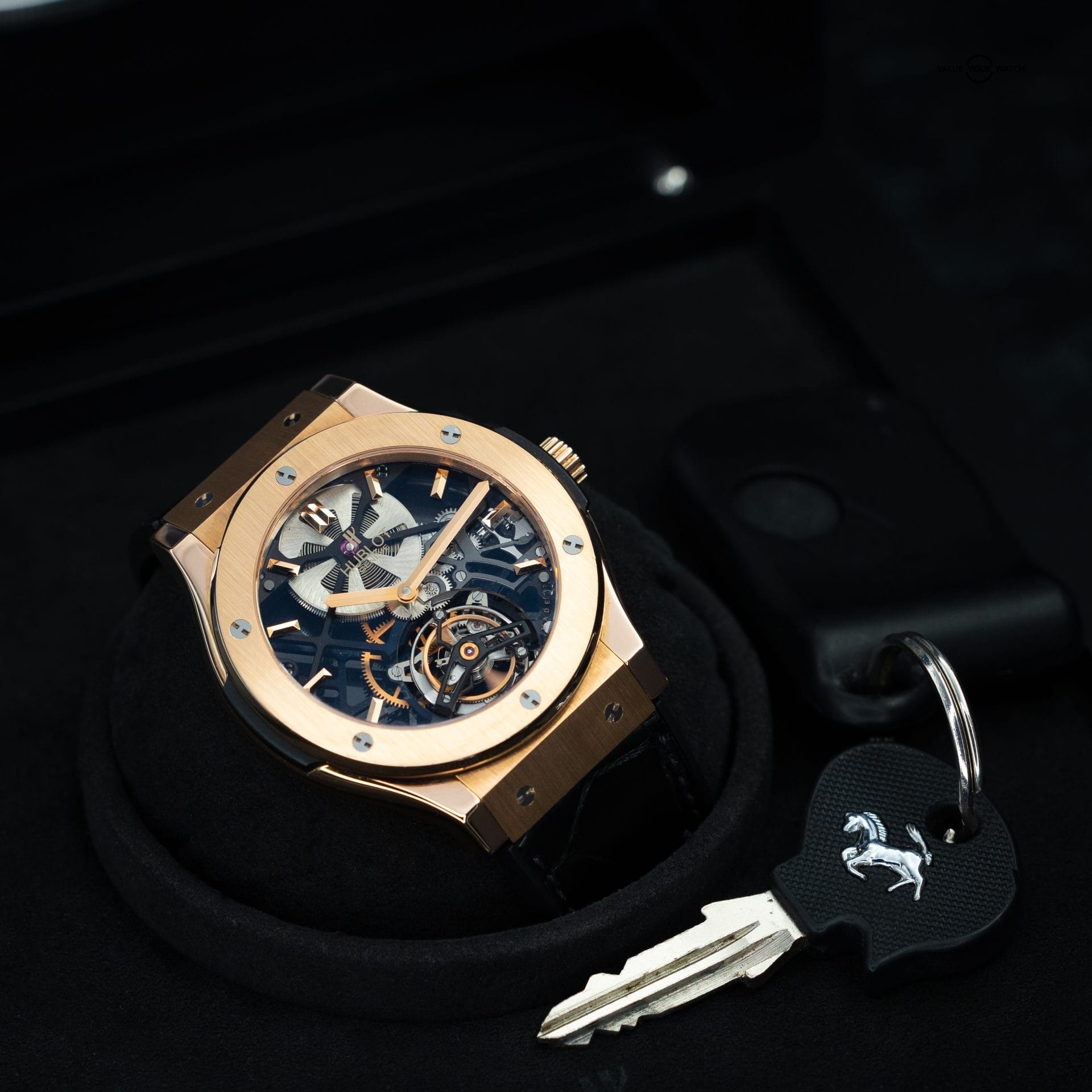 The Hublot Classic Fusion Skeleton Tourbillon Ref. 505.OX.0180.LR is a showcase of mechanical artistry and avant-garde elegance. Rendered in 18K King Gold, this rare openworked timepiece offers a mesmerizing view into the hand-wound tourbillon movement, perfectly framed by the clean lines of the Classic Fusion case. Elegance meets modernity in this reference โ a true grail for Hublot collectors and connoisseurs of haute horlogerie. Presented as a full set in excellent condition, this example captures the spirit of innovation and opulence that defines the Hublot DNA.
