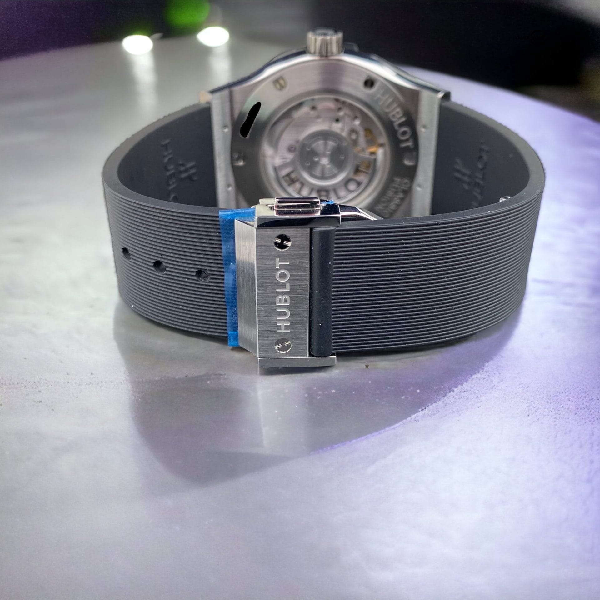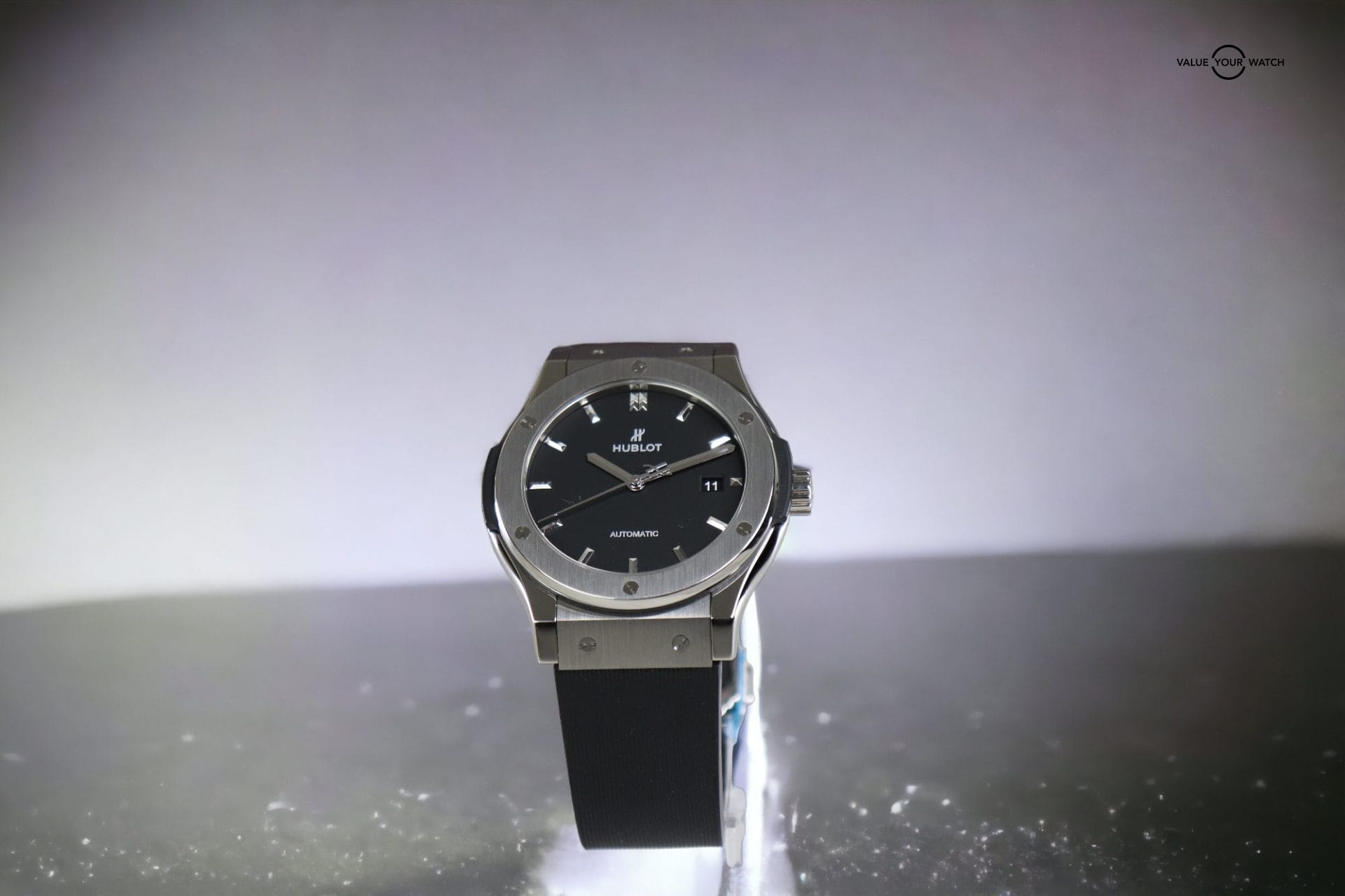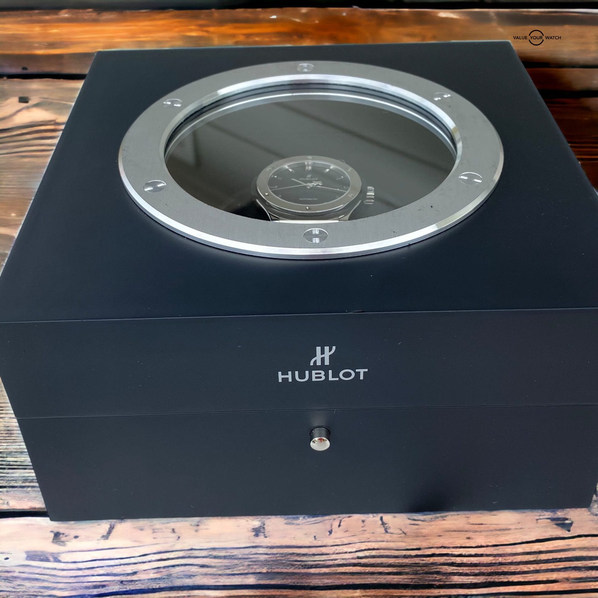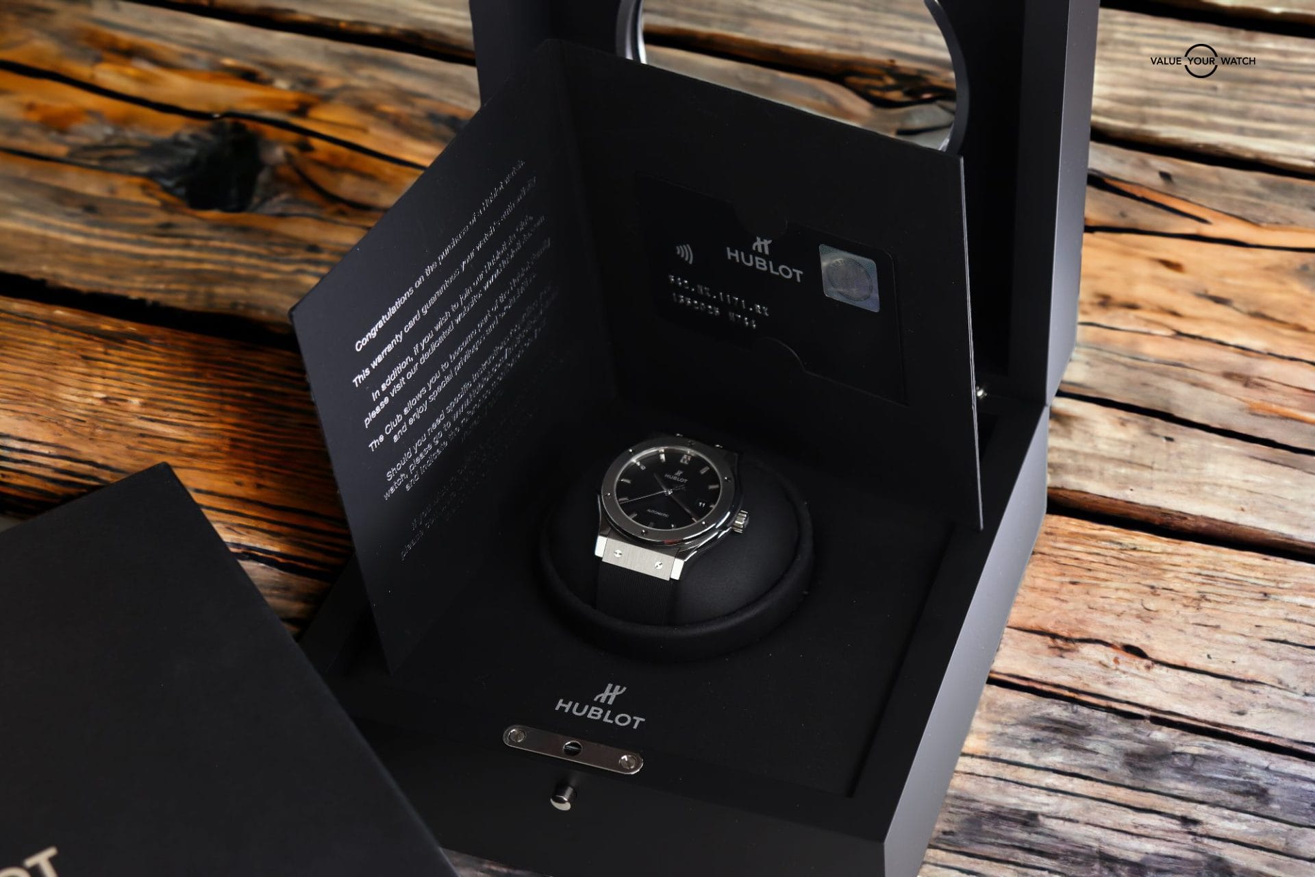 This piece offers Hublots HUB1110 Self-winding Swiss made movement with a 42 hour power reserve. The black dial and polished titanium case give a very classy clean look. At 42mm, the piece wears comfortably and makes an ideal wearer for business and casual meetings and events! Set comes with inner/outer box, manual, & warranty card.