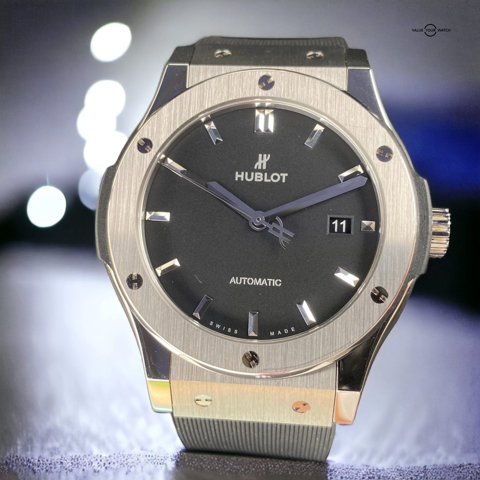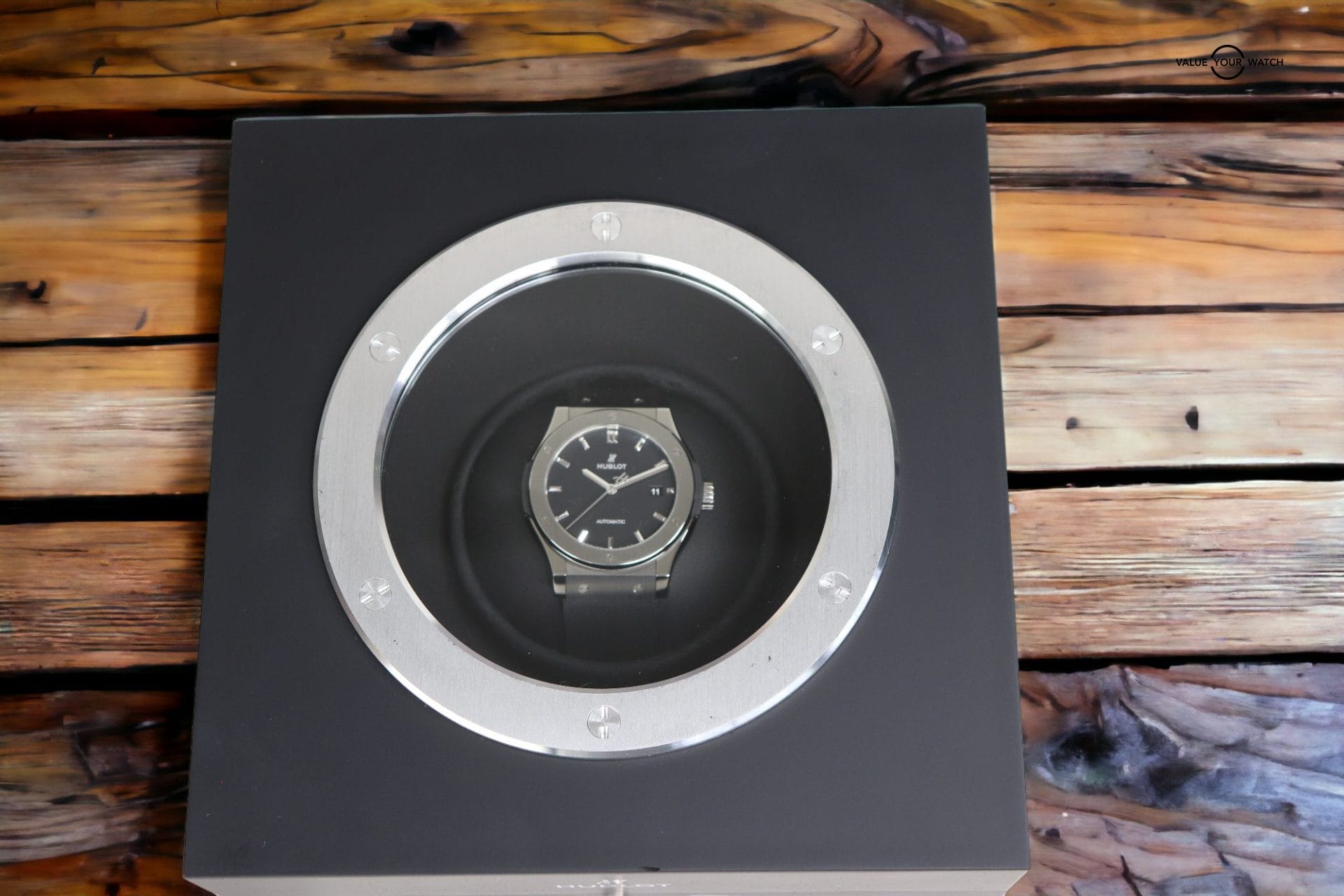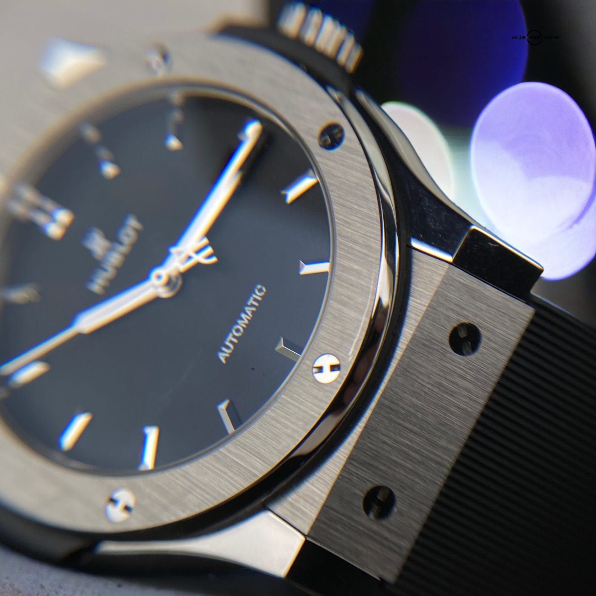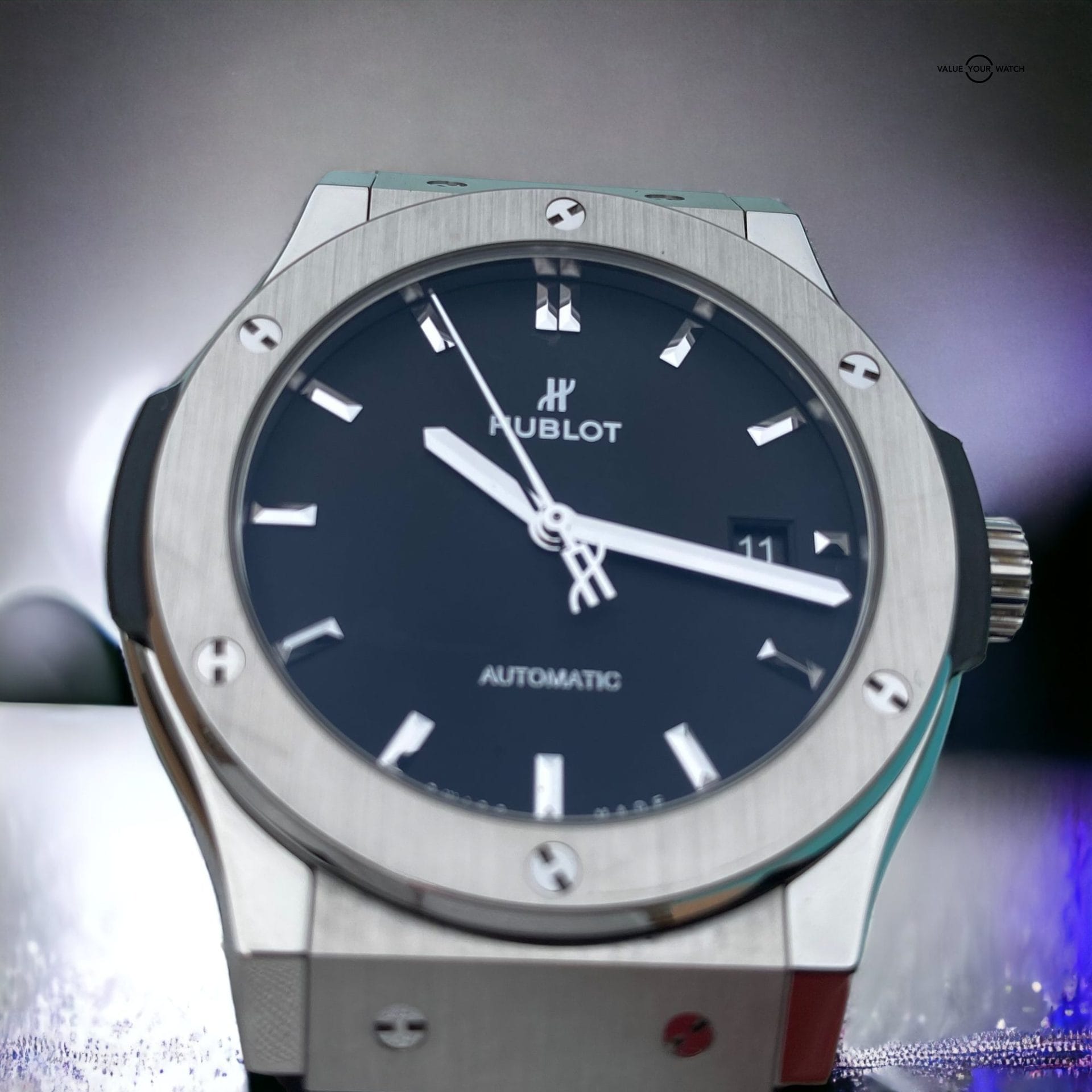 This piece offers Hublots HUB1110 Self-winding Swiss made movement with a 42 hour power reserve. The black dial and polished titanium case give a very classy clean look. At 42mm, the piece wears comfortably and makes an ideal wearer for business and casual meetings and events! Set comes with inner/outer box, manual, & warranty card.