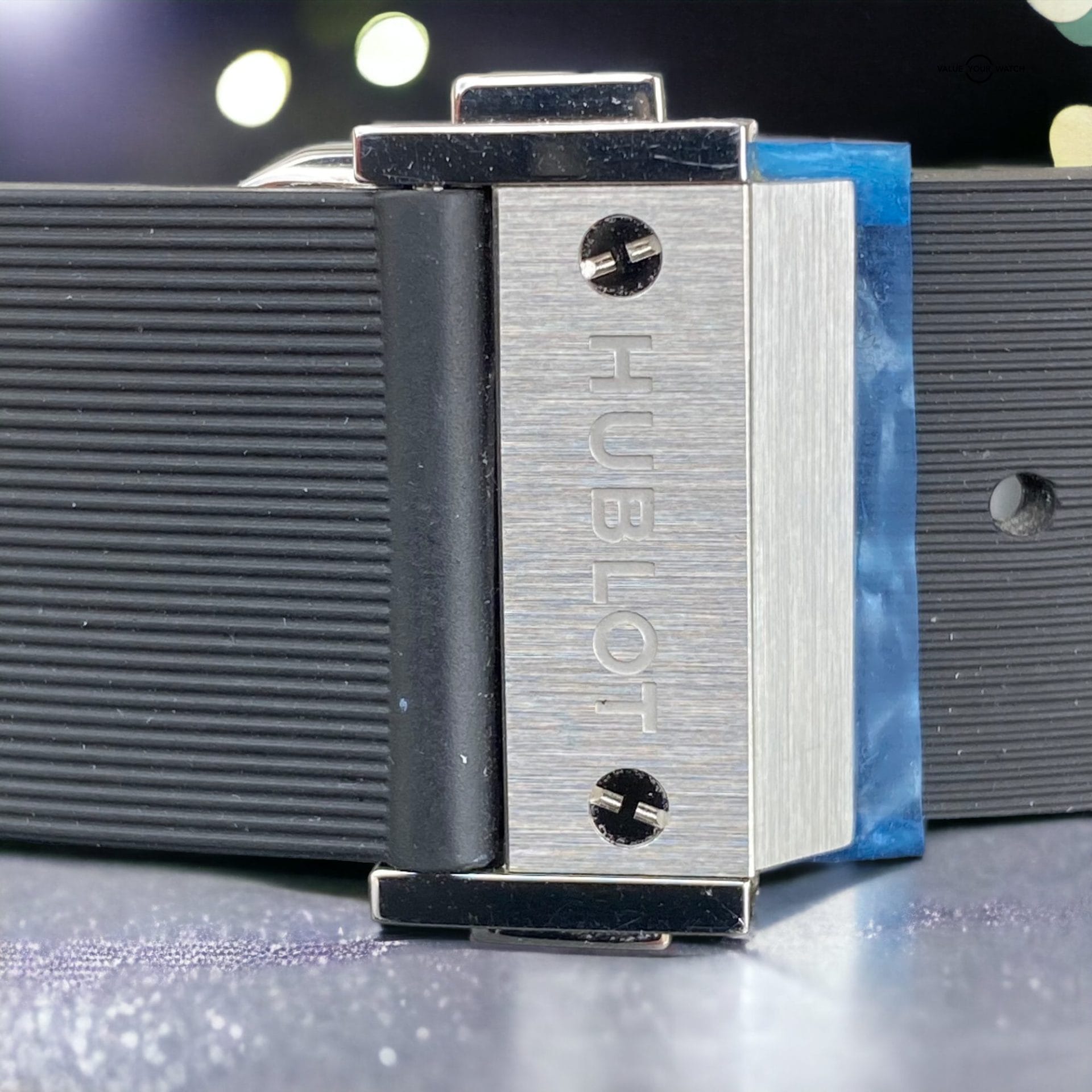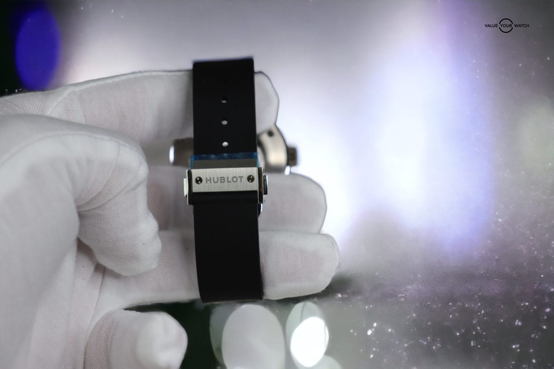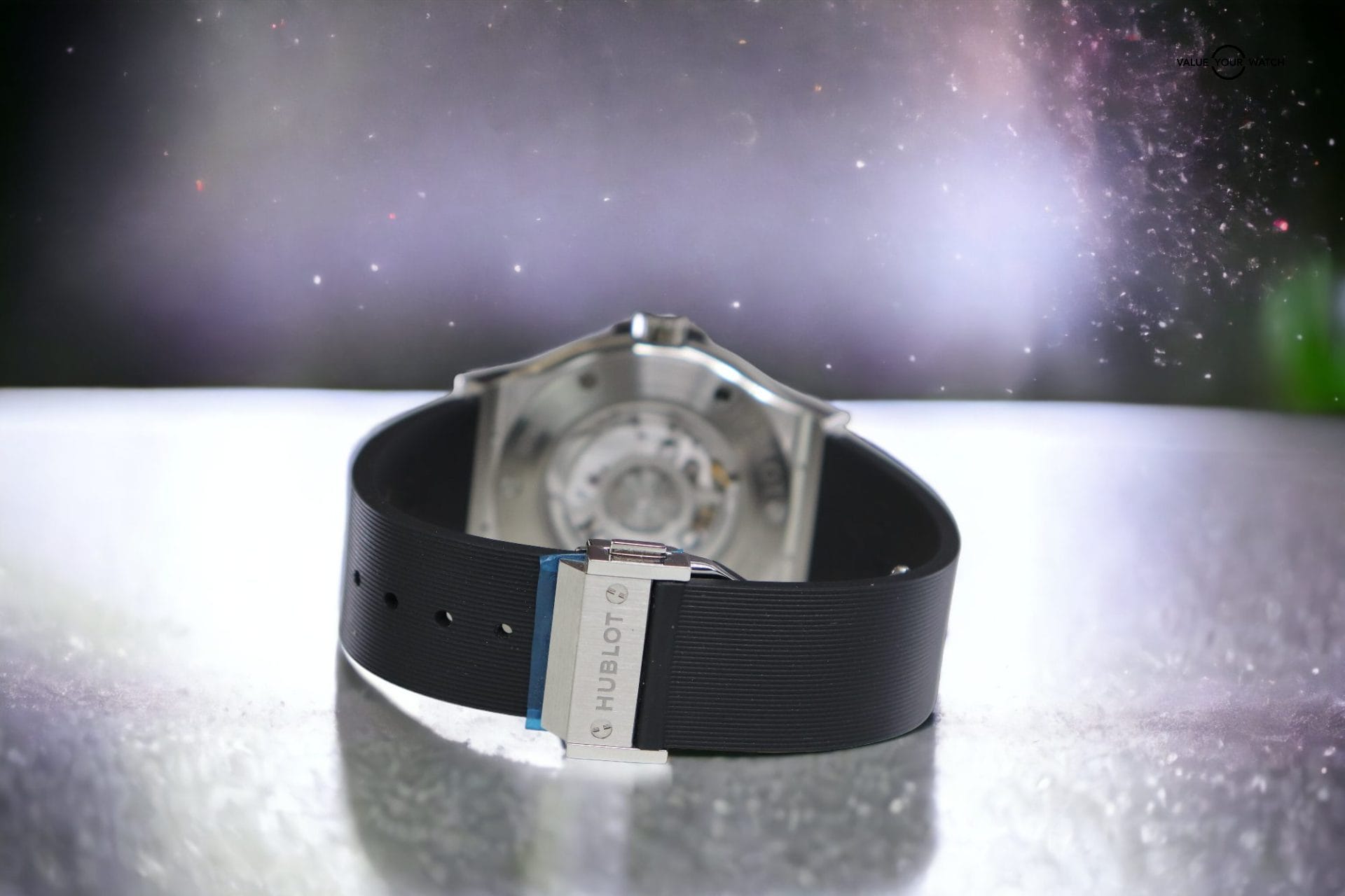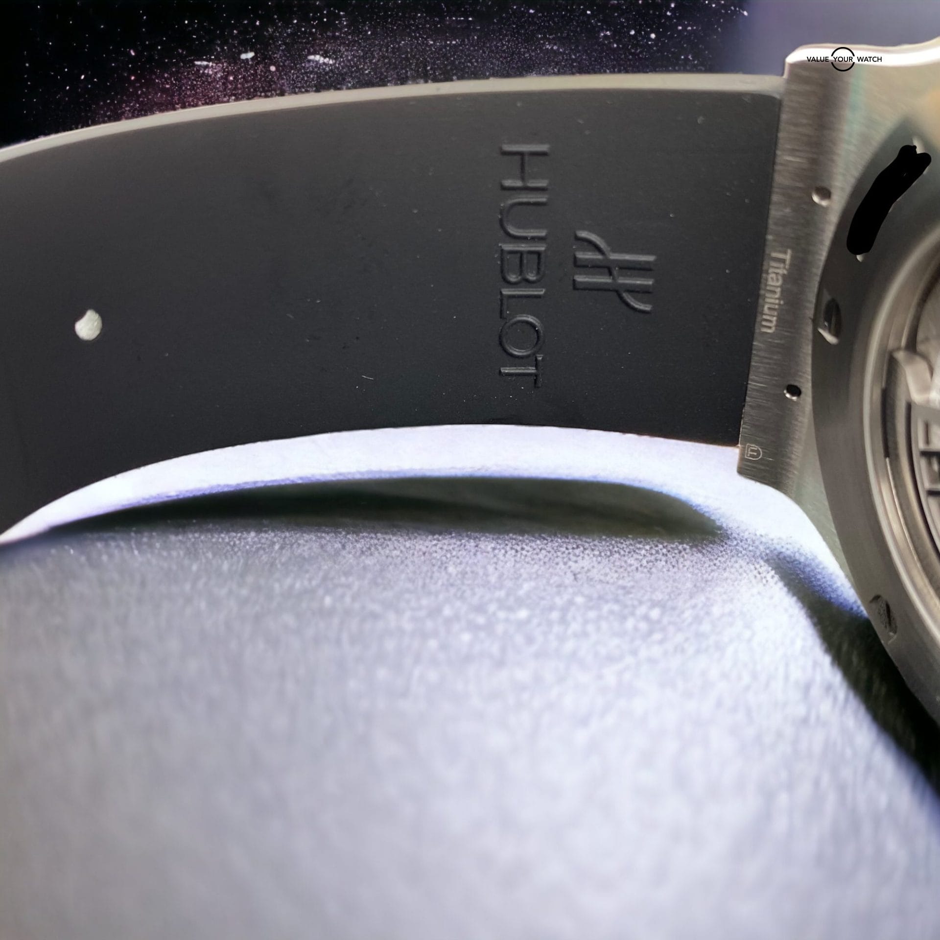 This piece offers Hublots HUB1110 Self-winding Swiss made movement with a 42 hour power reserve. The black dial and polished titanium case give a very classy clean look. At 42mm, the piece wears comfortably and makes an ideal wearer for business and casual meetings and events! Set comes with inner/outer box, manual, & warranty card.