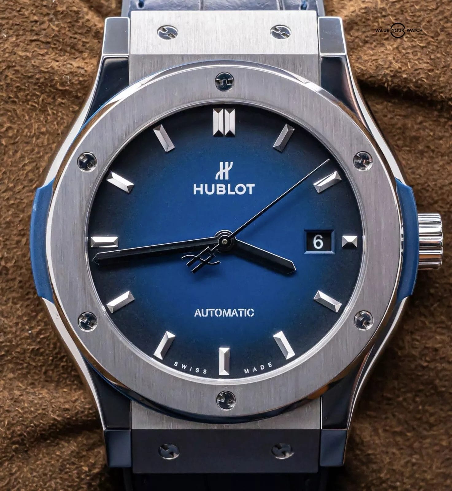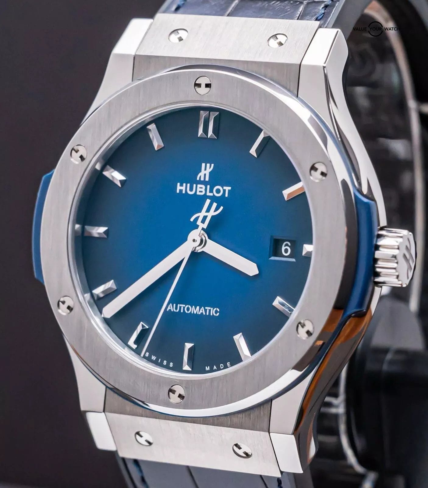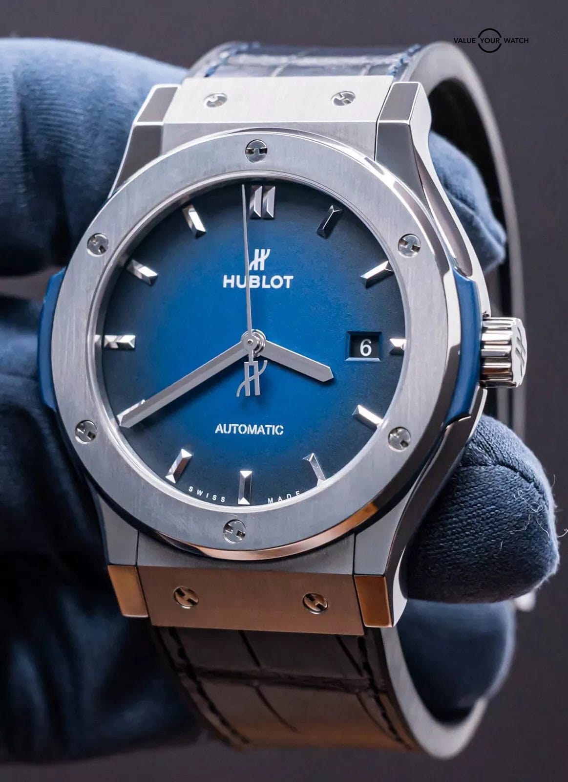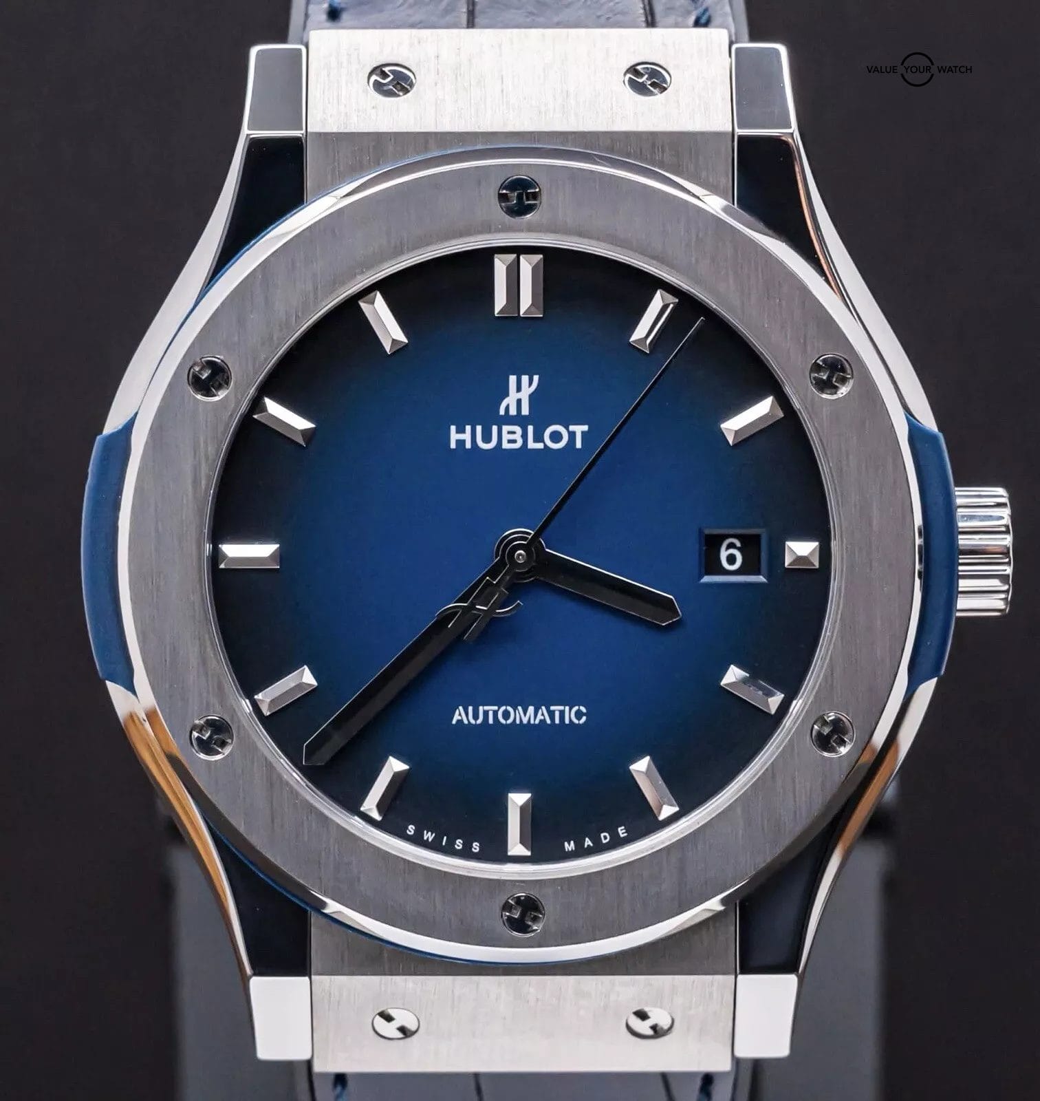 STUNNING Hublot Classic Fusion Titanium Deep Blue 42 mm with Blue Dial on BRAND NEW UNWORN Hublot Dark Blue Alligator Strap! Do not confuse this with the more common normal Blue Dial, this is the *RARE* Deep Blue Edition, made with the Blue Dial that fades from Blue to Black, SUPER cool. Arrives as a complete set with the original boxes and papers including the international warranty card. Originally purchased from a Hublot Authorized Dealer in 2019! This BRAND NEW UNWORN strap cost me near $700 from Hublot, may the next owner truly enjoy this STRIKING piece on wrist!